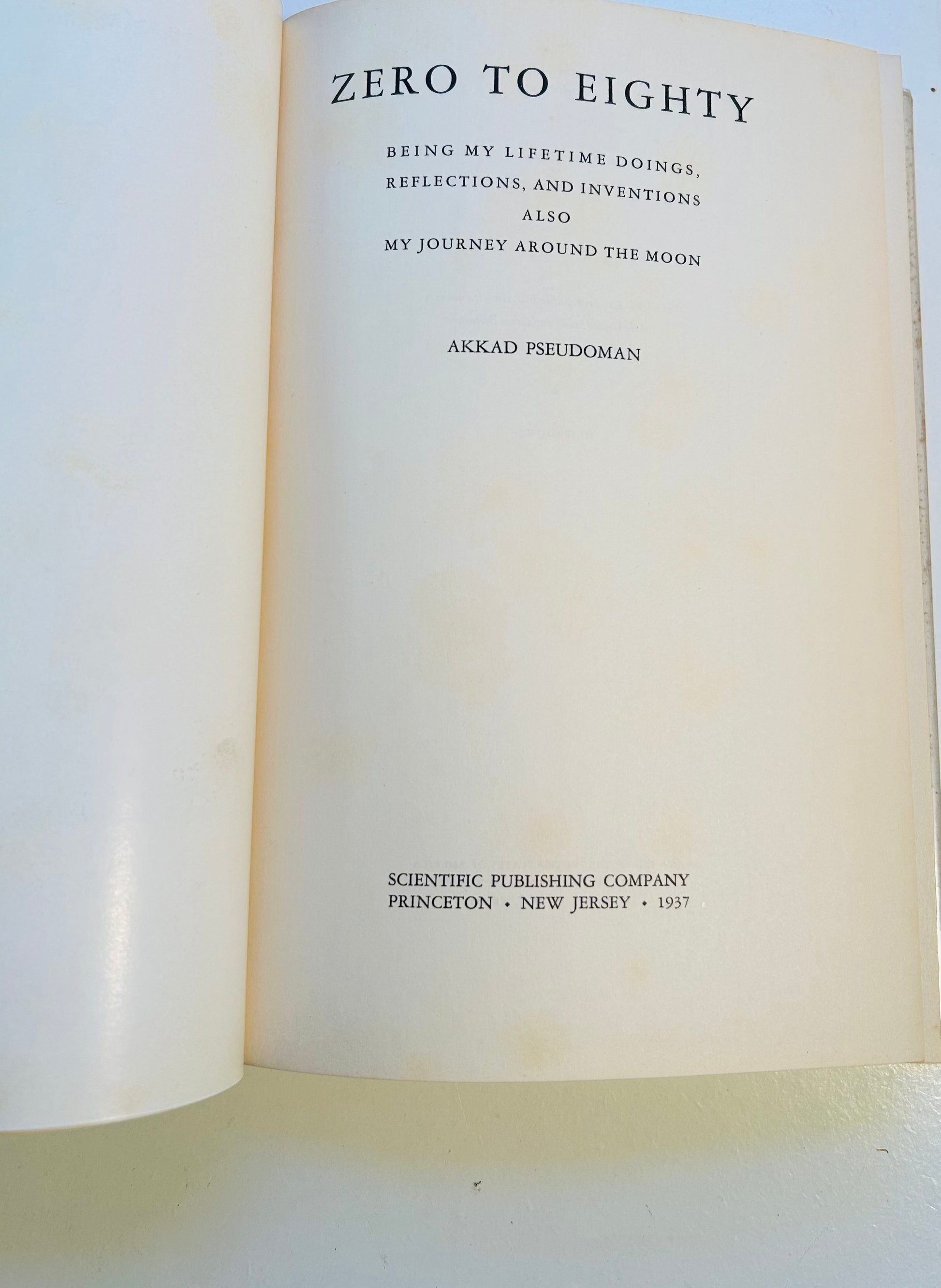 A scarce and intriguing stated first edition of Zero to Eighty by E. F. Northrup, writing under the pseudonym Akkad Pseudoman. Published in 1937 by the Scientific Publishing Company, this unconventional work blends early 20th-century speculative thought with philosophical and scientific inquiry—making it a compelling acquisition for collectors of obscure Americana, pseudonymous authorship, and pre-war scientific literature.