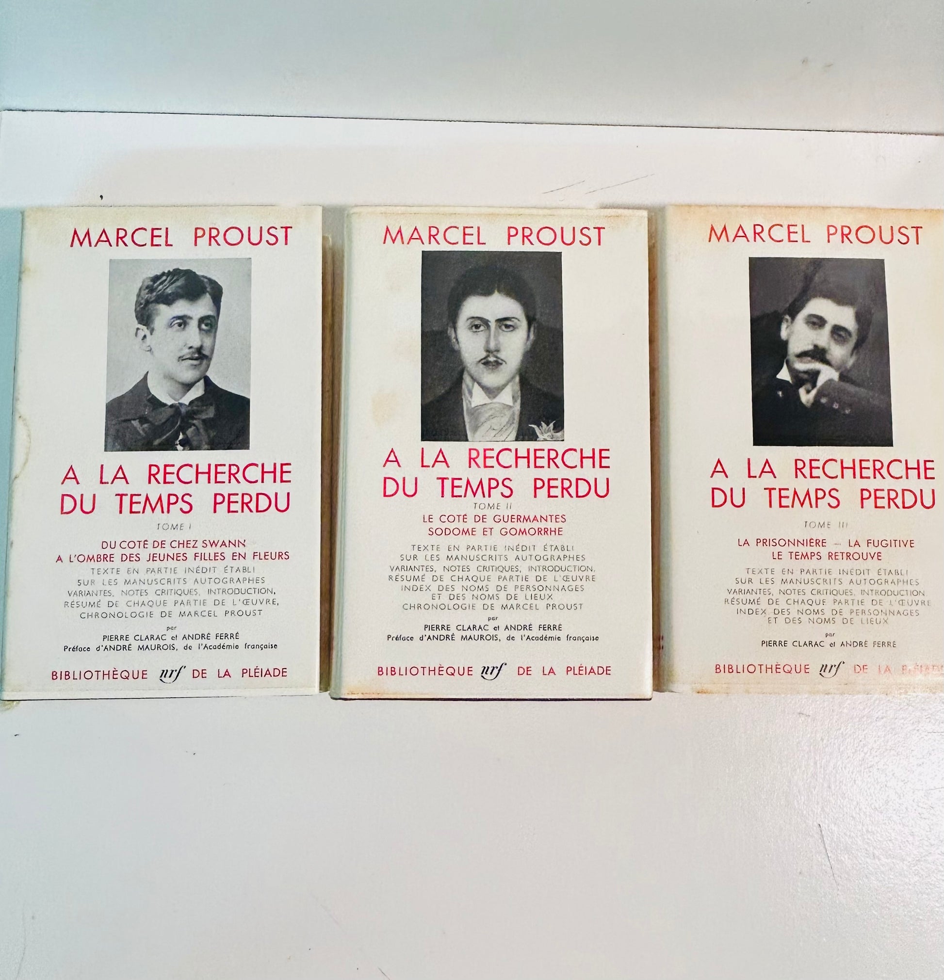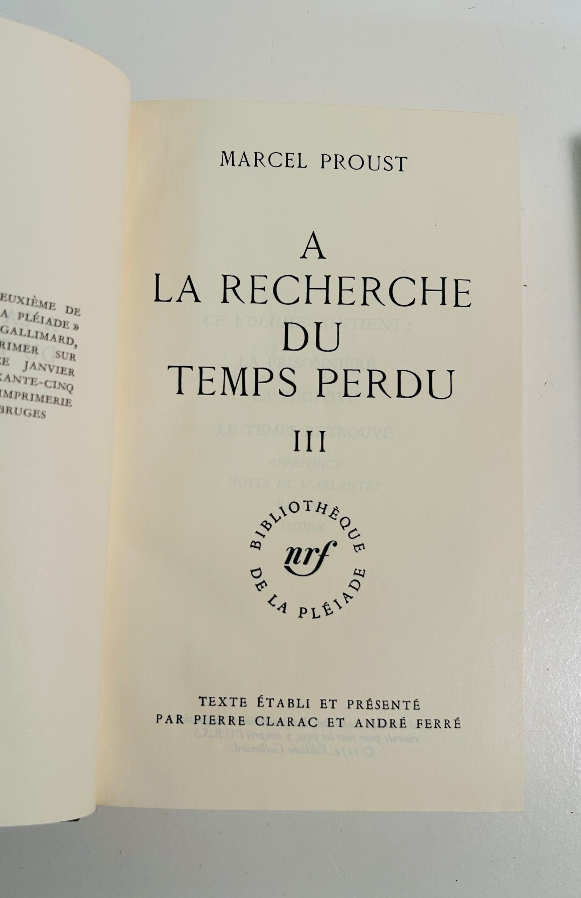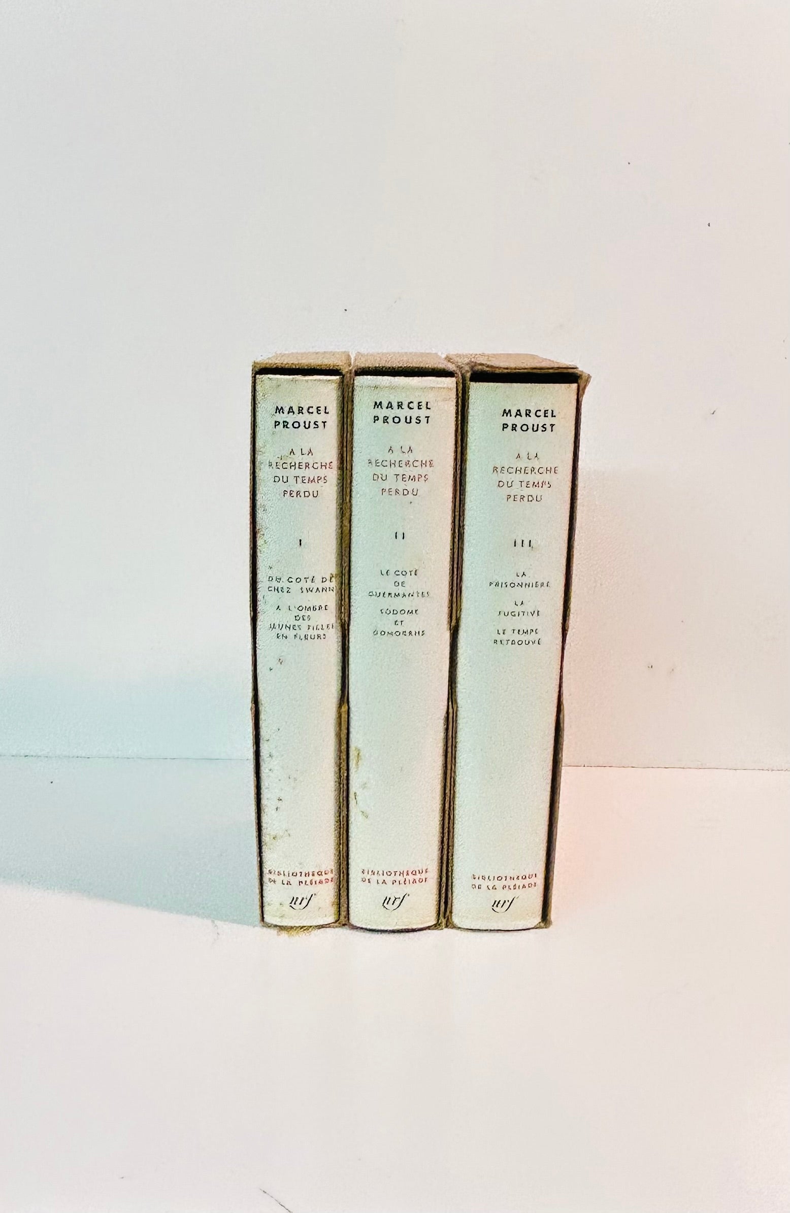 Marcel Proust. First editions. Paris, France: Éditions Gallimard. Bibliothèque de la Pléiade series. Three volume set each in a soft bookcase. All three editions are in Very Good+ condition. Only the first volume has Some writing on the title page, all other pages are clean. More than 3,000 total pages. Soft leather bindings with original dust jackets, beautifully preserved. Some foxing on dust jackets.