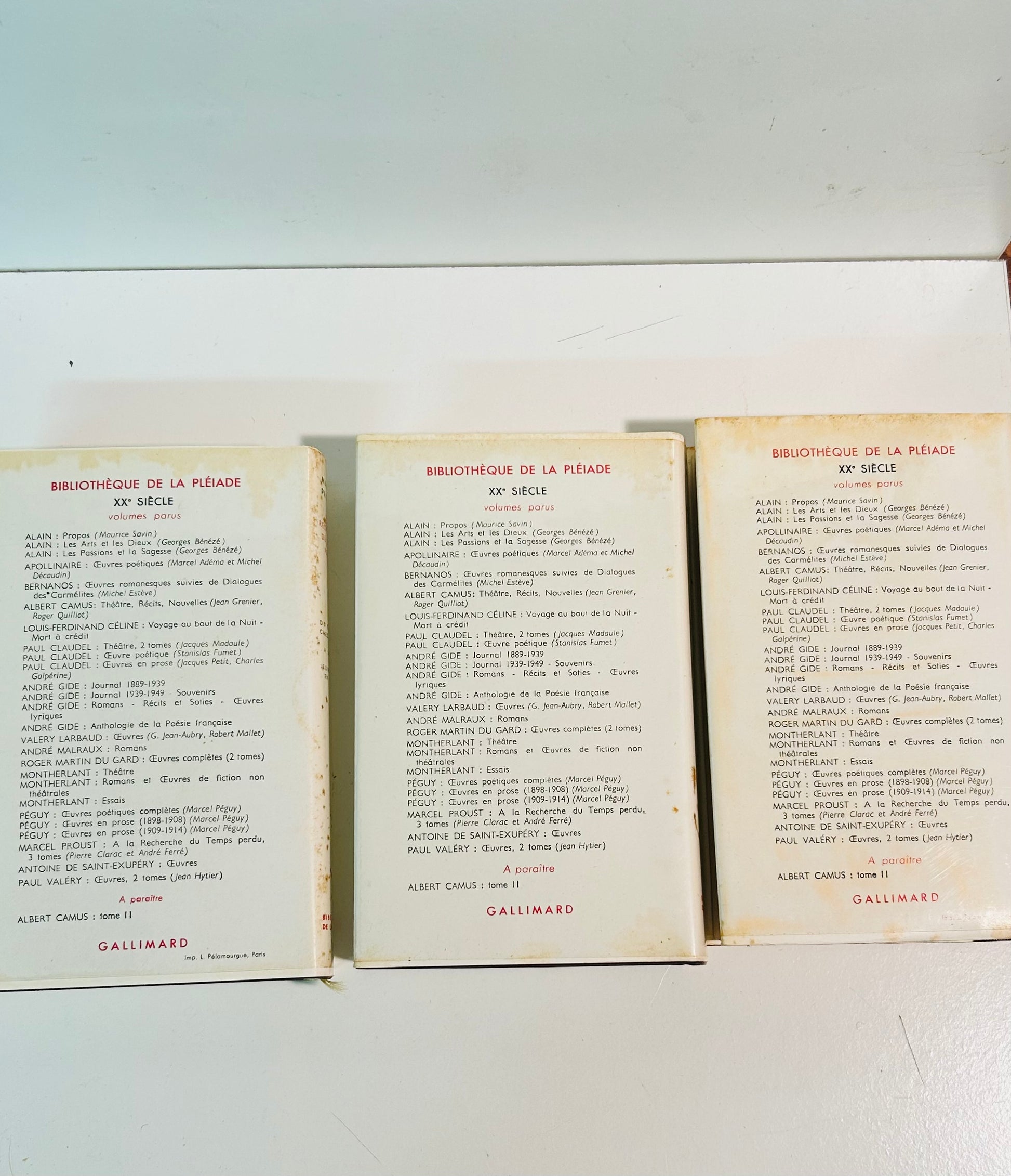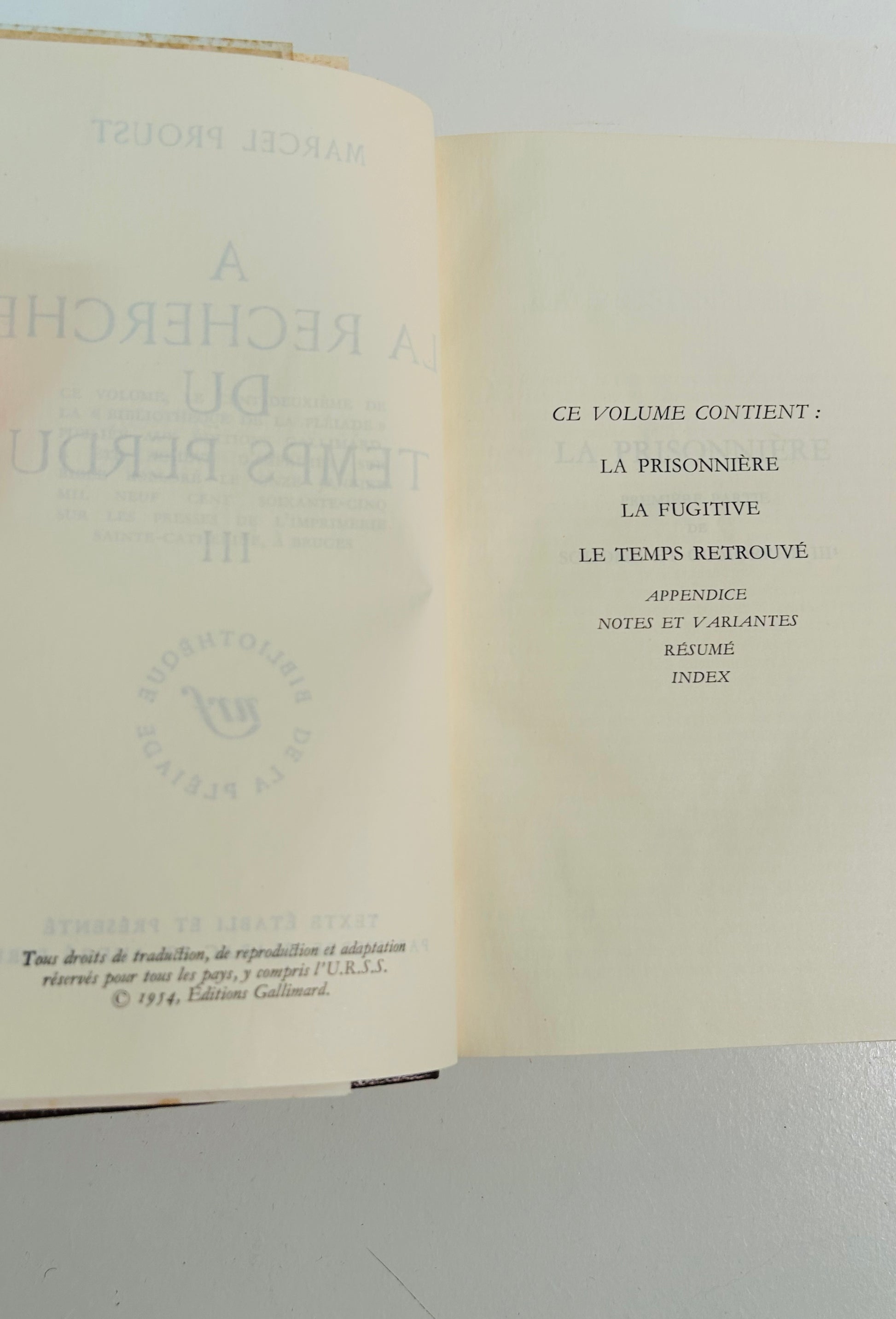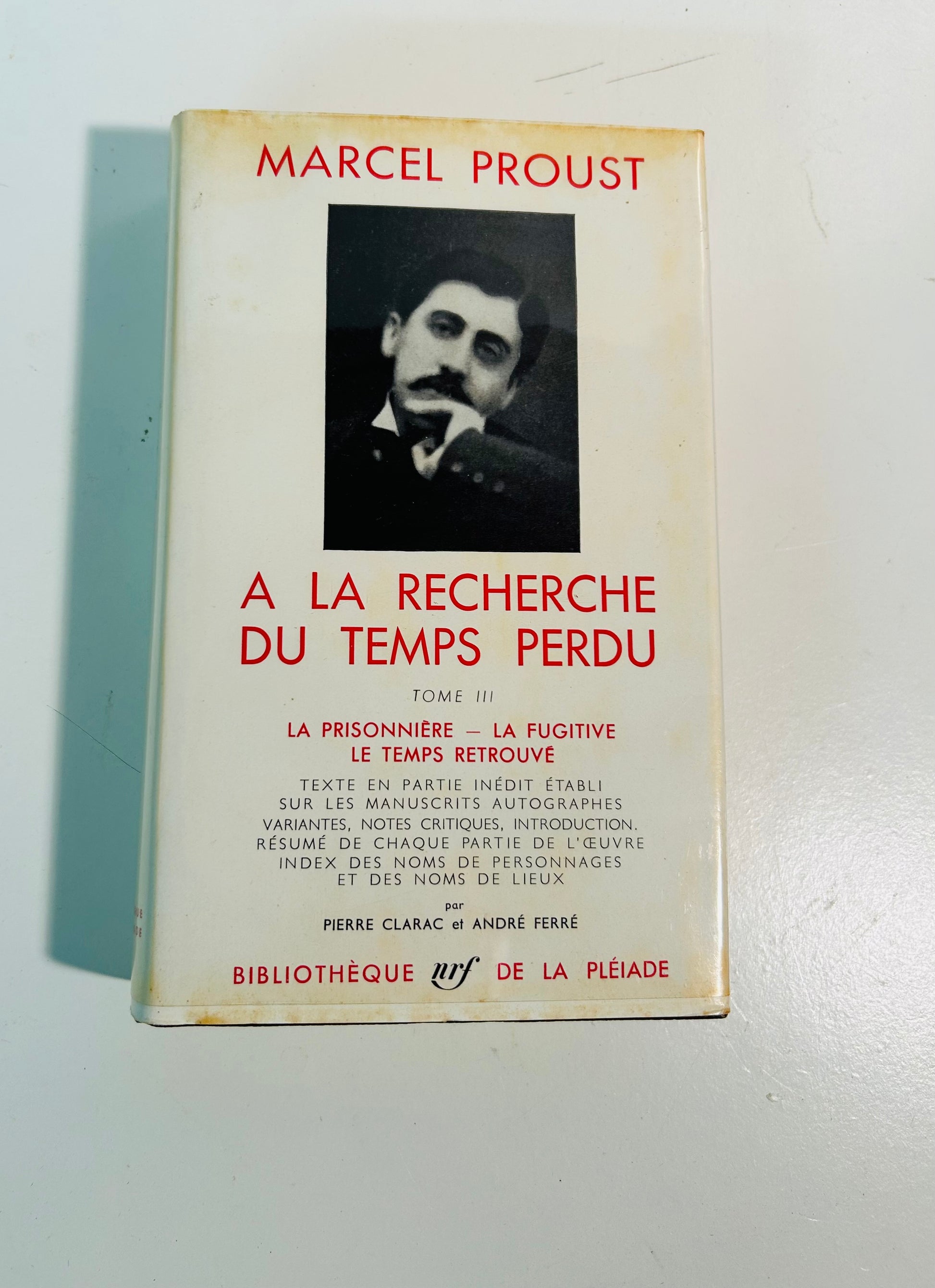 Marcel Proust. First editions. Paris, France: Éditions Gallimard. Bibliothèque de la Pléiade series. Three volume set each in a soft bookcase. All three editions are in Very Good+ condition. Only the first volume has Some writing on the title page, all other pages are clean. More than 3,000 total pages. Soft leather bindings with original dust jackets, beautifully preserved. Some foxing on dust jackets.
