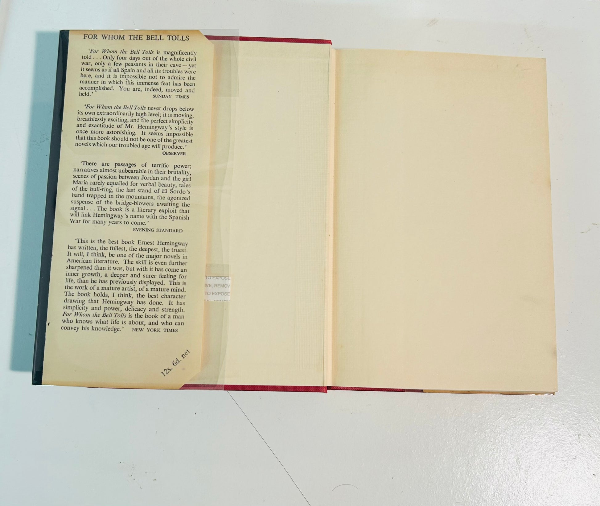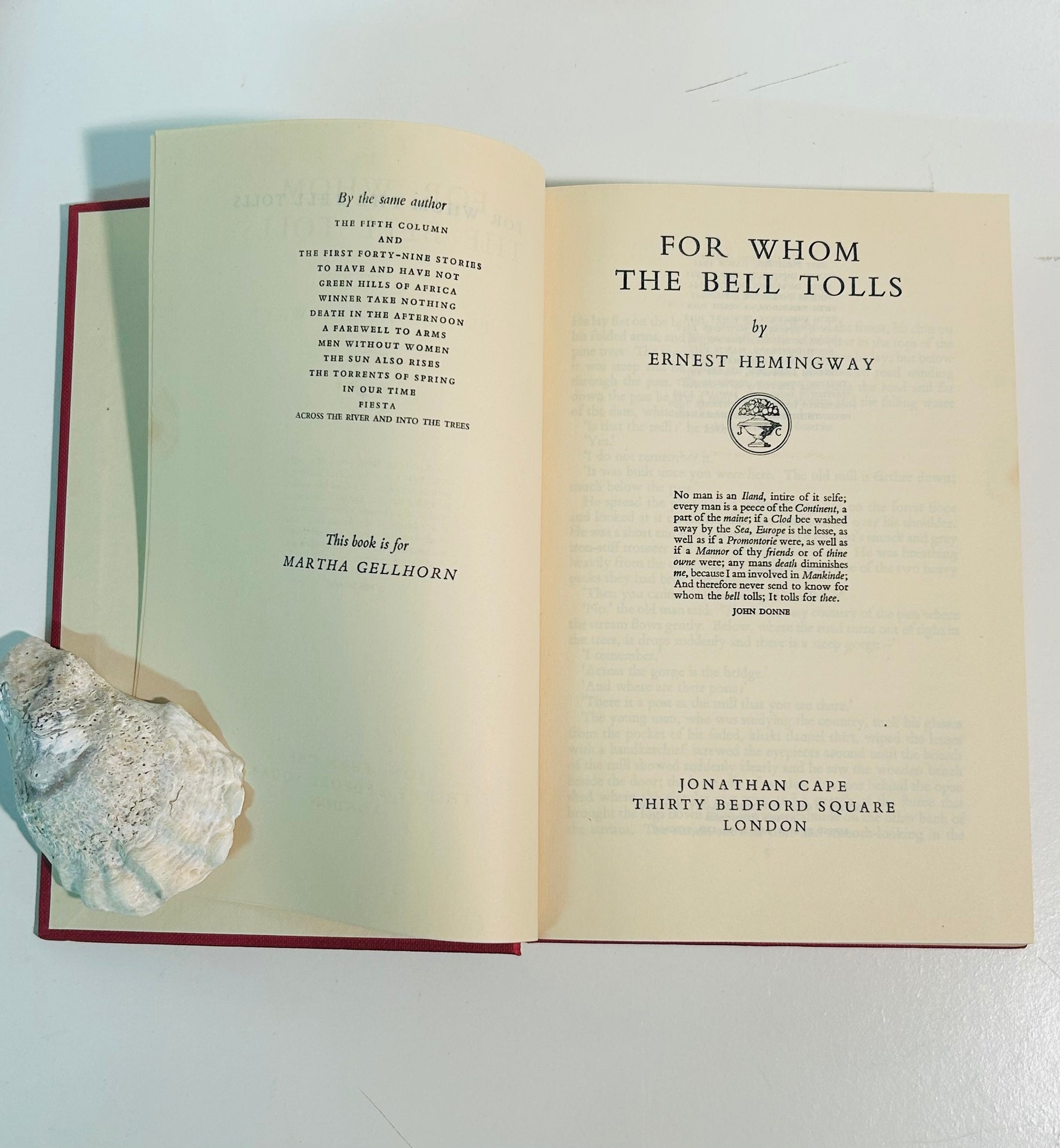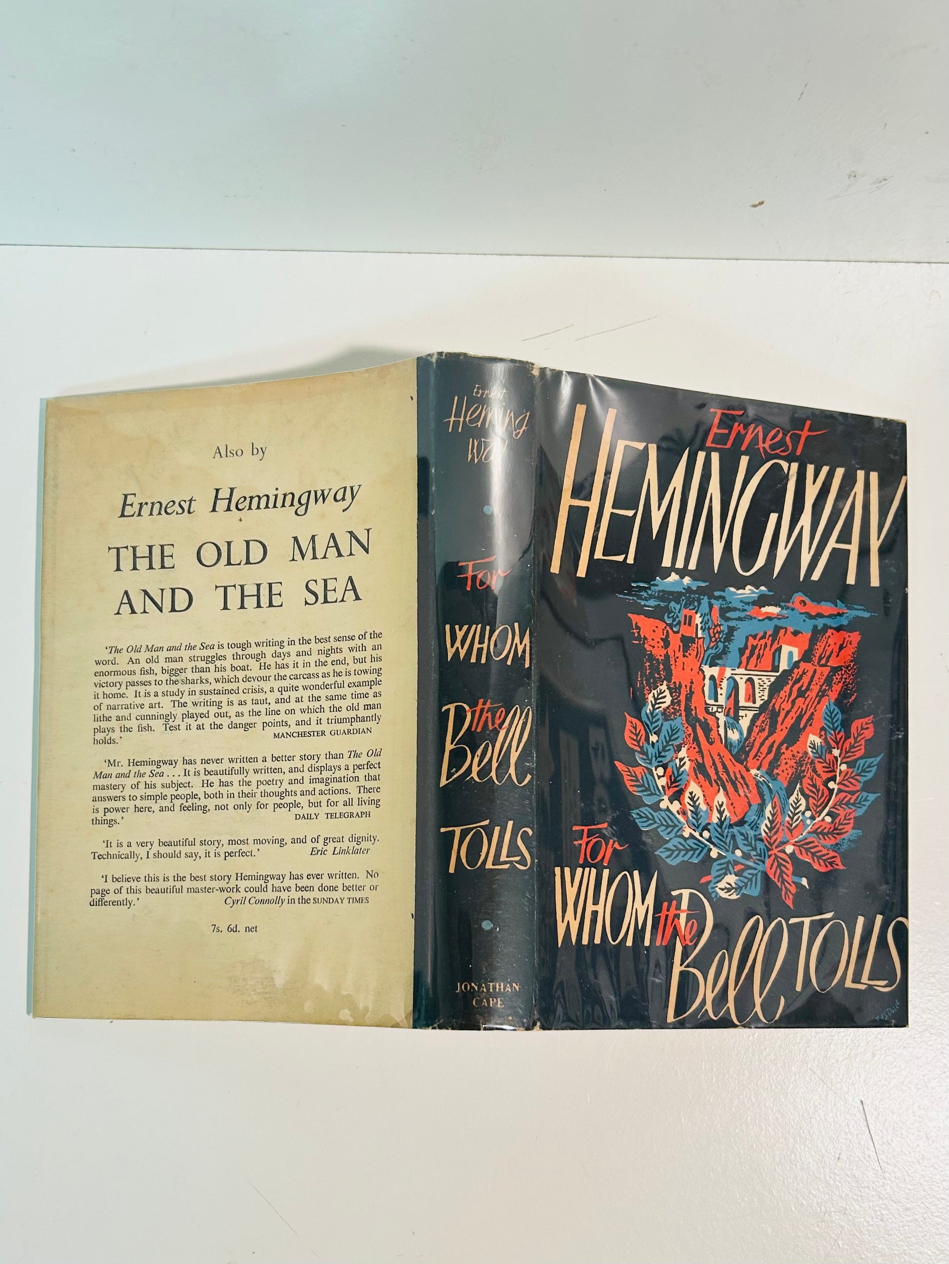 A handsome mid-century reprint of Hemingway’s powerful 1940 novel, For Whom the Bell Tolls, first published in the U.K. by Jonathan Cape in 1941. Set during the Spanish Civil War, the novel captures Hemingway’s spare, emotional prose and his deep understanding of love, loyalty, and the tragedy of war.