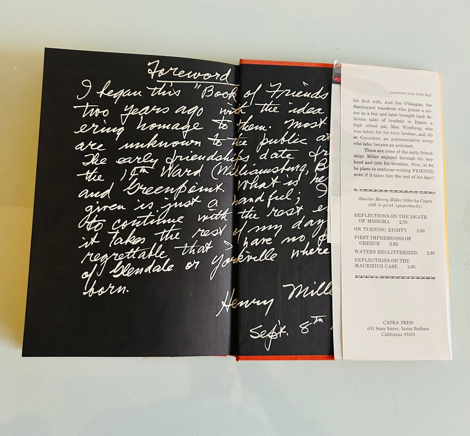 Henry Miller. First edition, stated first printing. Signed by the author. Santa Barbara: Capra Press, 1976. Both unclipped dust jacket (in a mylar wrapper) and hardcover are in Near Fine condition. No writing or markings found in the book, other than, author’s signature and written in pencil “first edition and signed,” 138 pp. Newspaper article on H. Miller laid in.