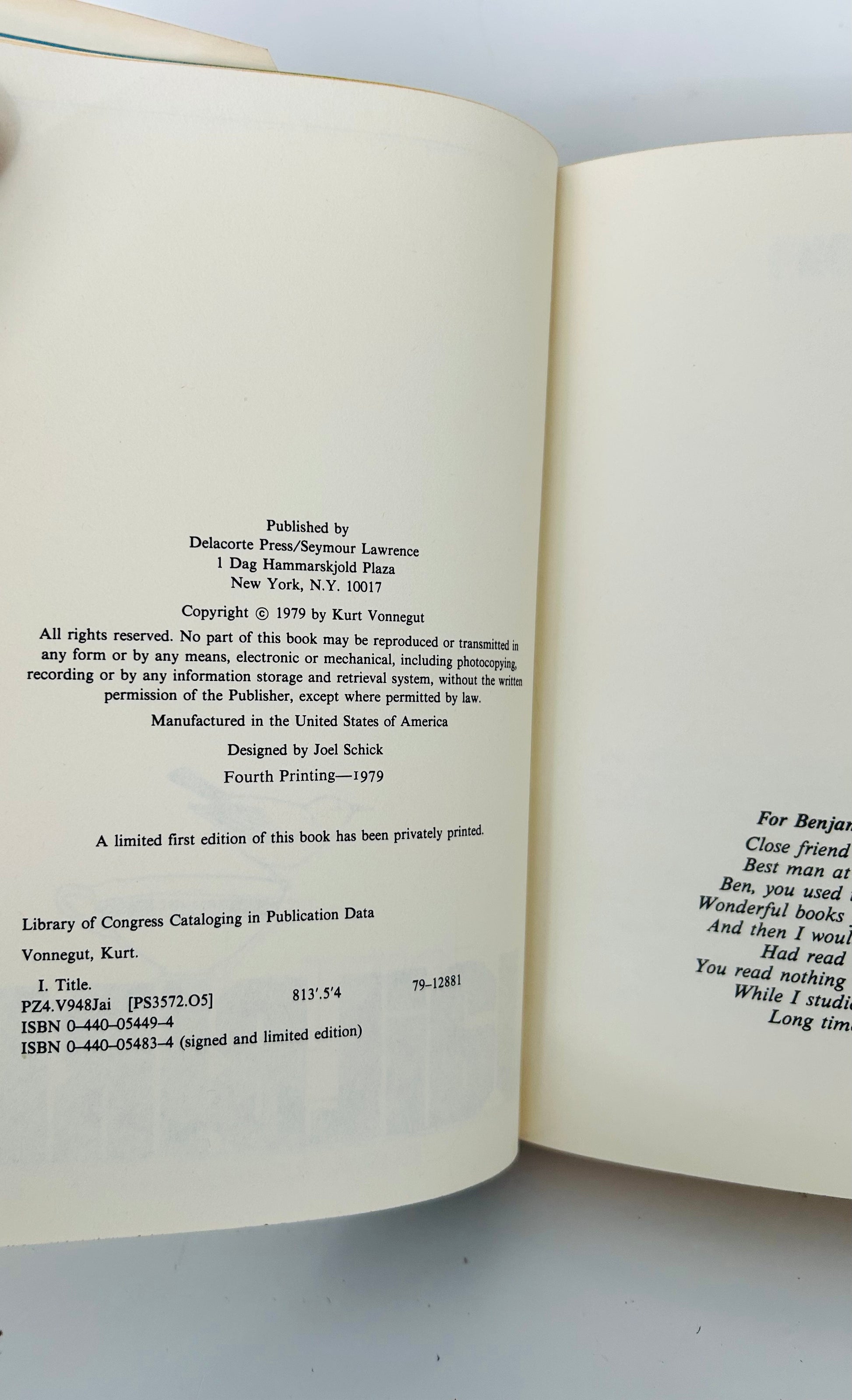 Kurt Vonnegut. First edition, stated fourth printing. New York: Delacourte Press/Seymour Lawrence, 1979. Both price-clipped dust jacket and hardcover are in Very Good condition. Jacket designed by the great Paul Bacon. No writing or markings found in the book, 246 pp.
