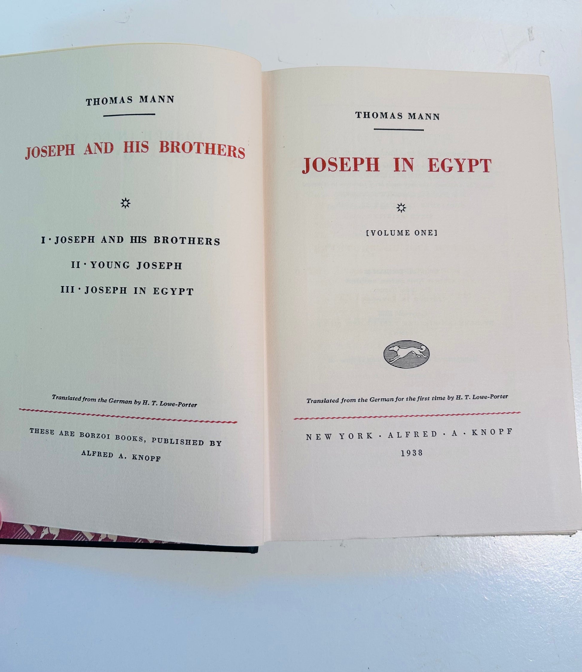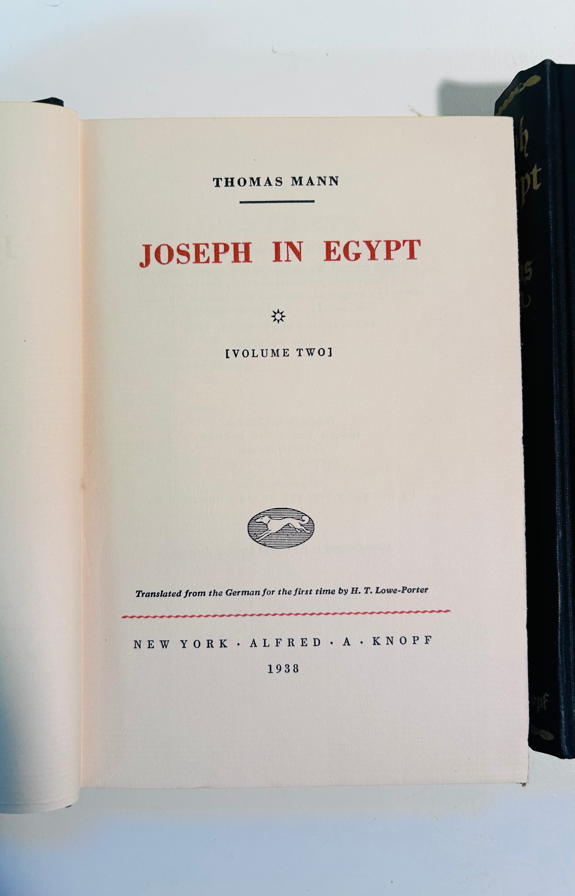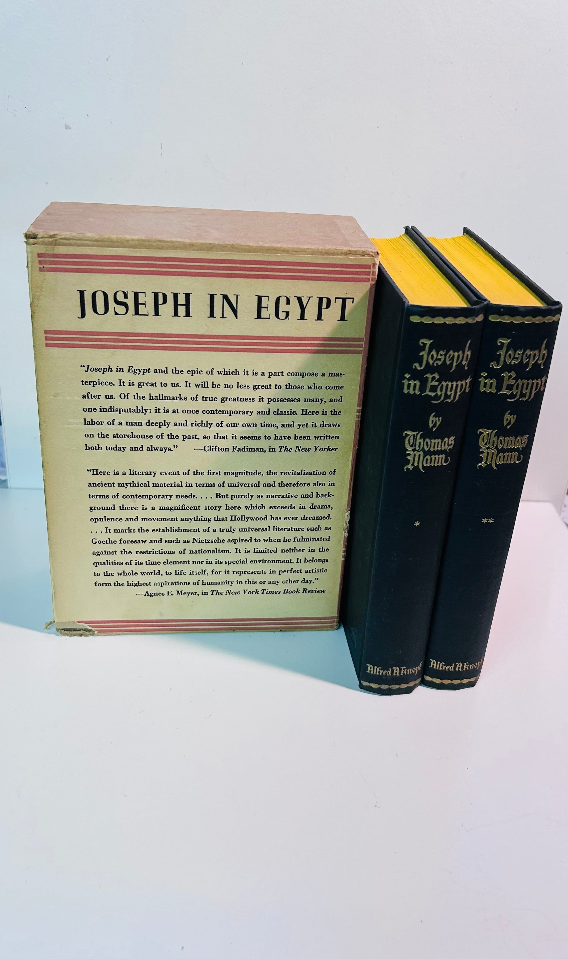 This handsome two-volume boxed set of Thomas Mann’s Joseph in Egypt (Joseph in Ägypten) presents one of the Nobel Prize–winning author’s most celebrated works of historical fiction. Published by Alfred A. Knopf in 1938, this set is a first edition, sixth printing, housed in its original publisher’s slipcase.