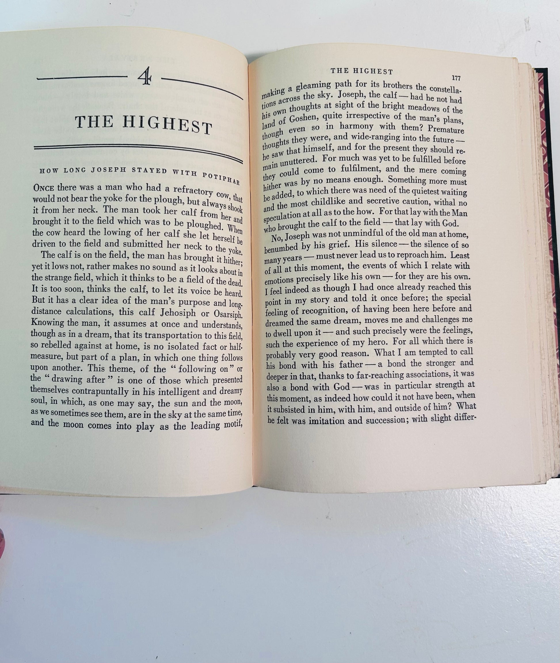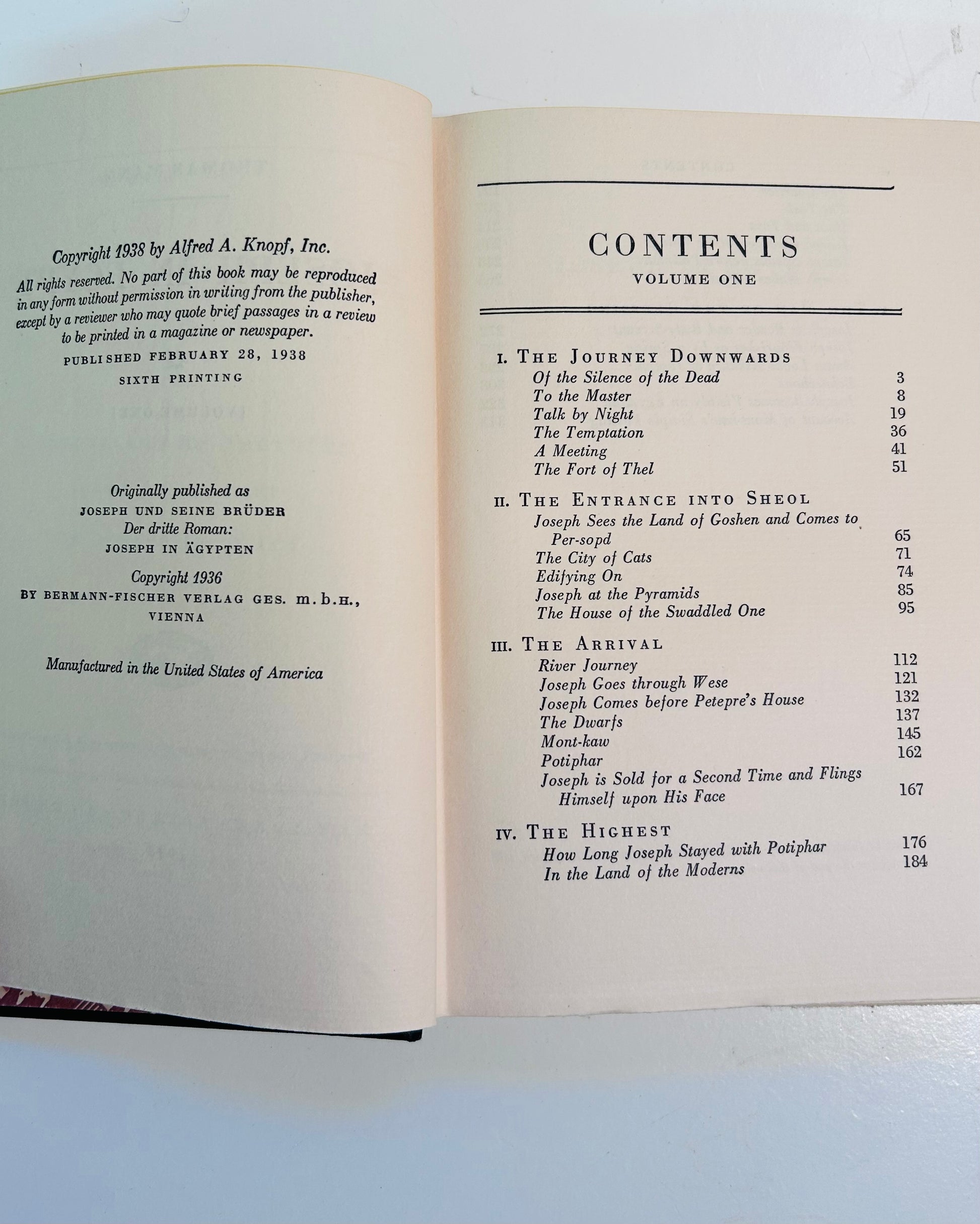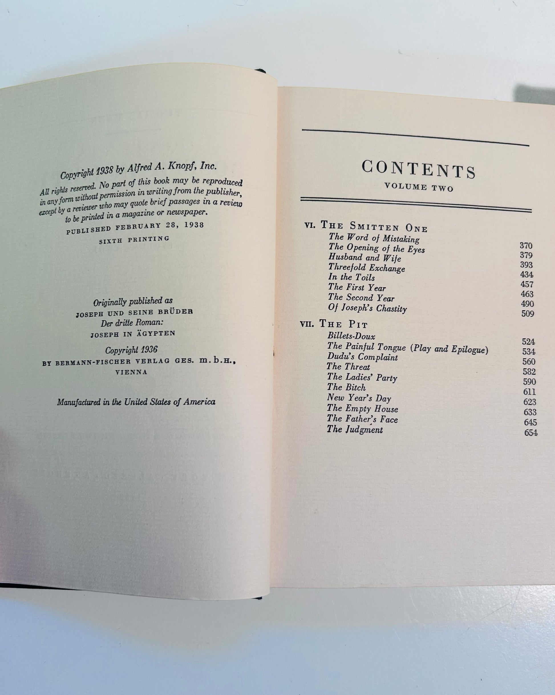 This handsome two-volume boxed set of Thomas Mann’s Joseph in Egypt (Joseph in Ägypten) presents one of the Nobel Prize–winning author’s most celebrated works of historical fiction. Published by Alfred A. Knopf in 1938, this set is a first edition, sixth printing, housed in its original publisher’s slipcase.