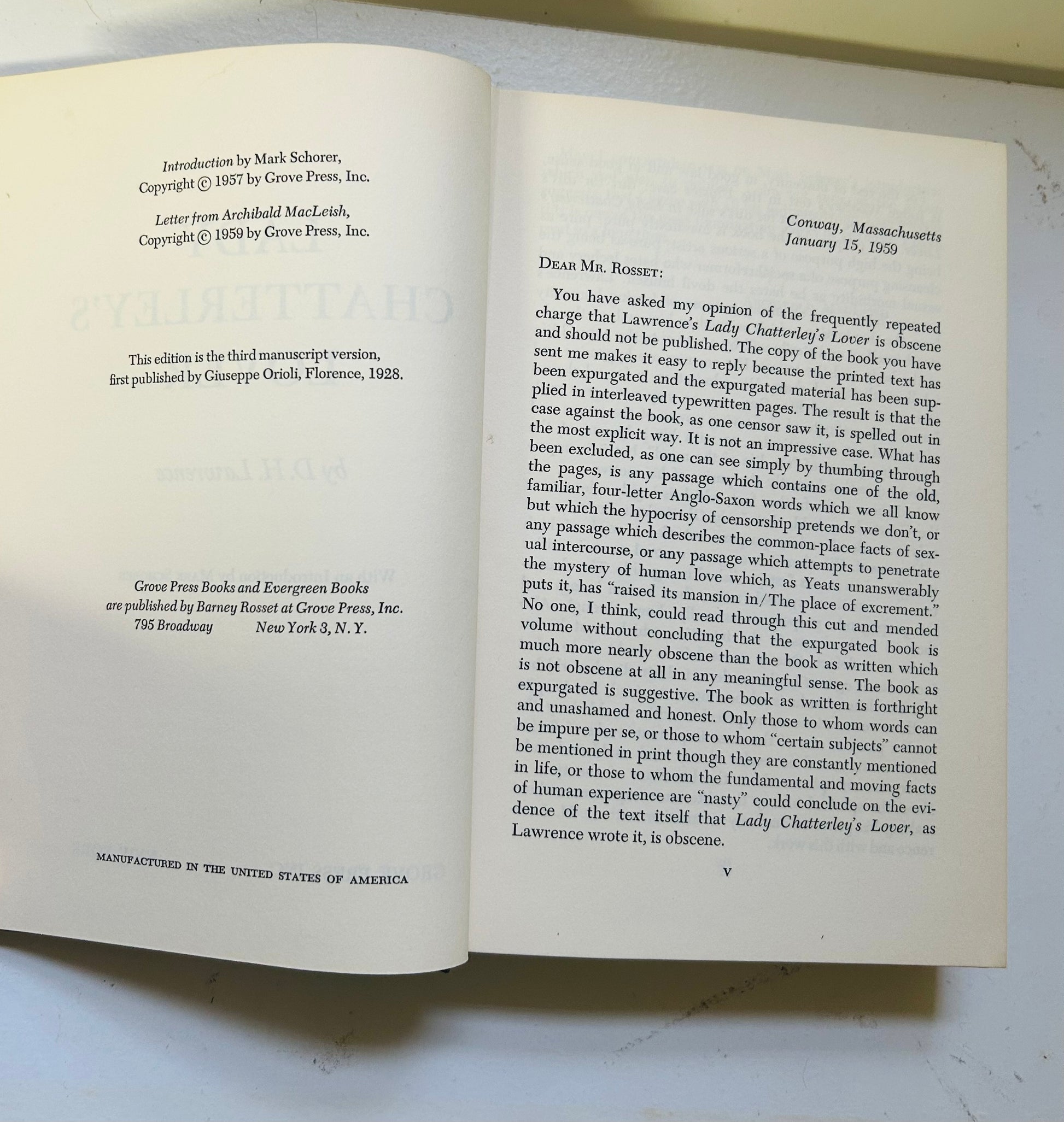 DH Lawrence. First American edition, later printing (third manuscript version). New York: Grove Press, 1959. Unclipped dust jacket is in Very Good+ condition, with original price $6.00 on inside flap. Hardcover is in Very Good+ condition. Former owner signature on flyleaf, otherwise, no markings or additional writing found in this well preserved copy, 368 pp. Introduction written by Mark Schorer. Preface by Archibald MacLeish.