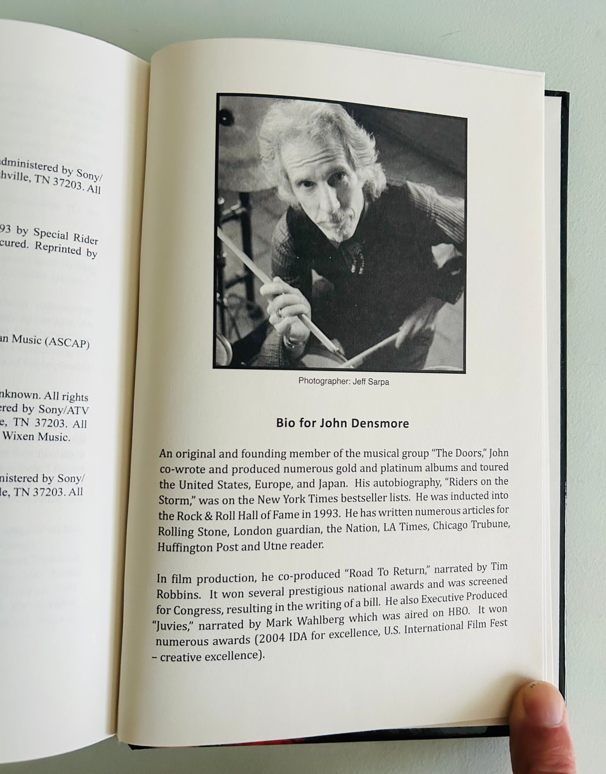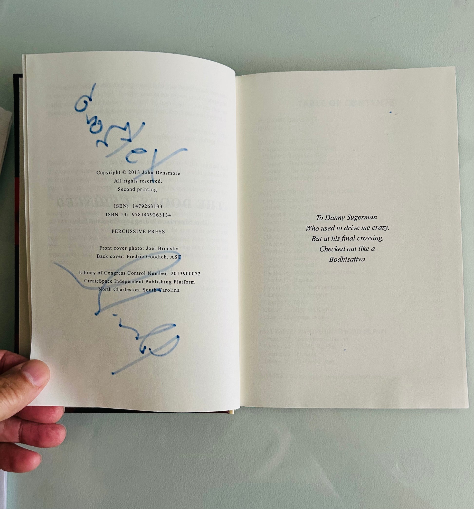 John Densmore. Signed copy. First edition, stated second printing. South Carolina: Percussive Press, 2013. Hardcopy is in Very Good+ condition. No dust jacket. No writing or markings found in the book, other than author’s signature on title page, 270 pp.