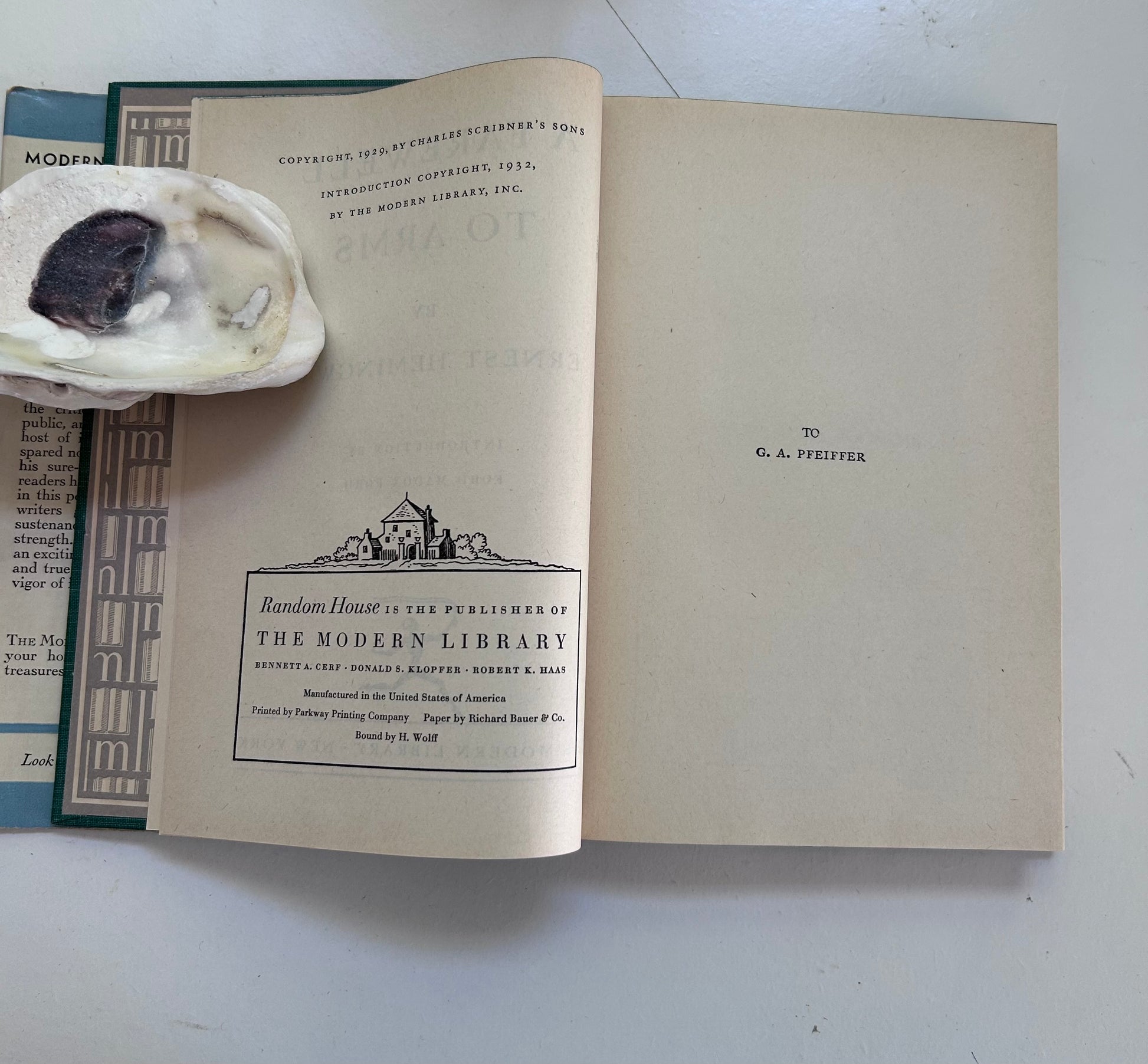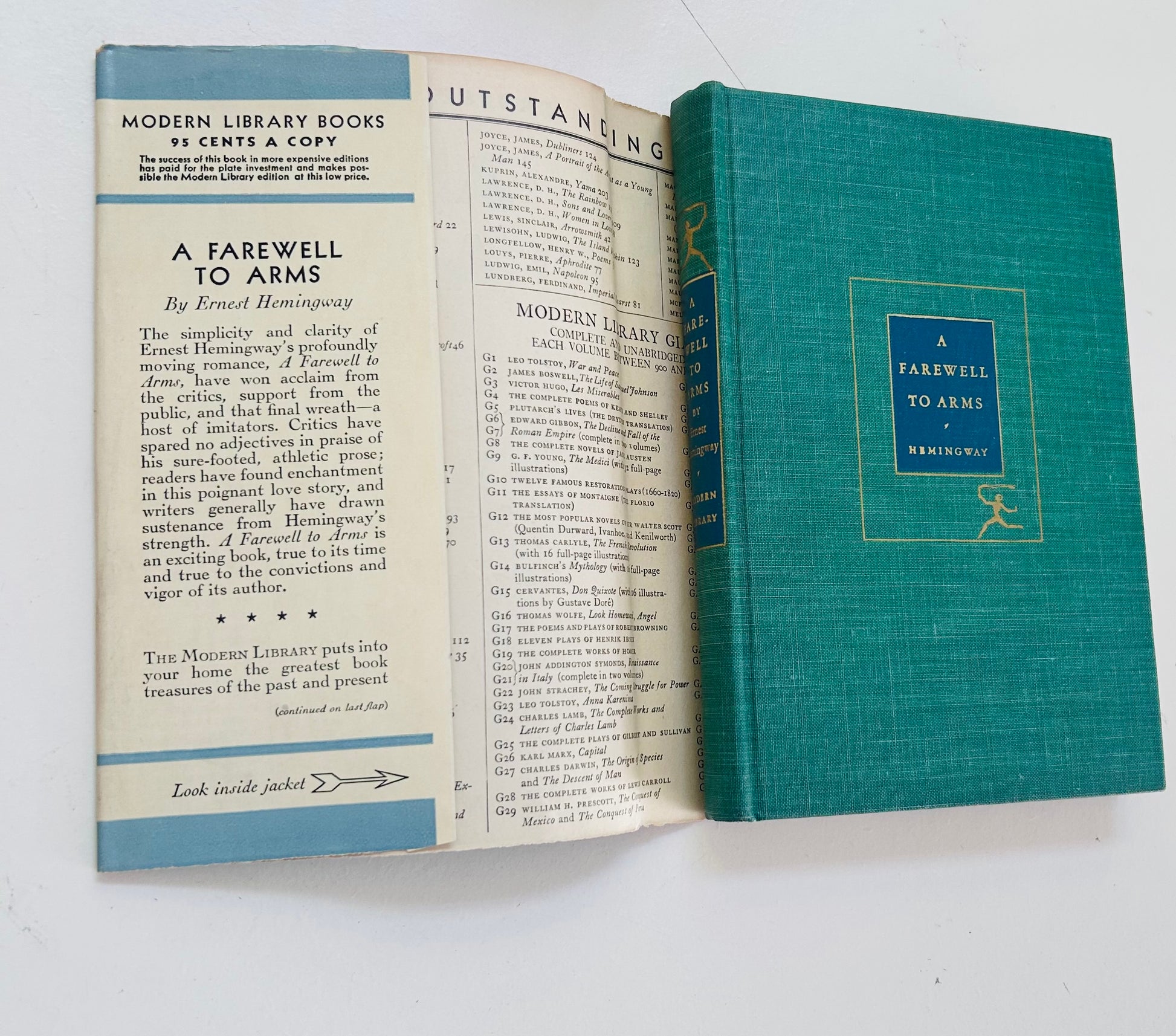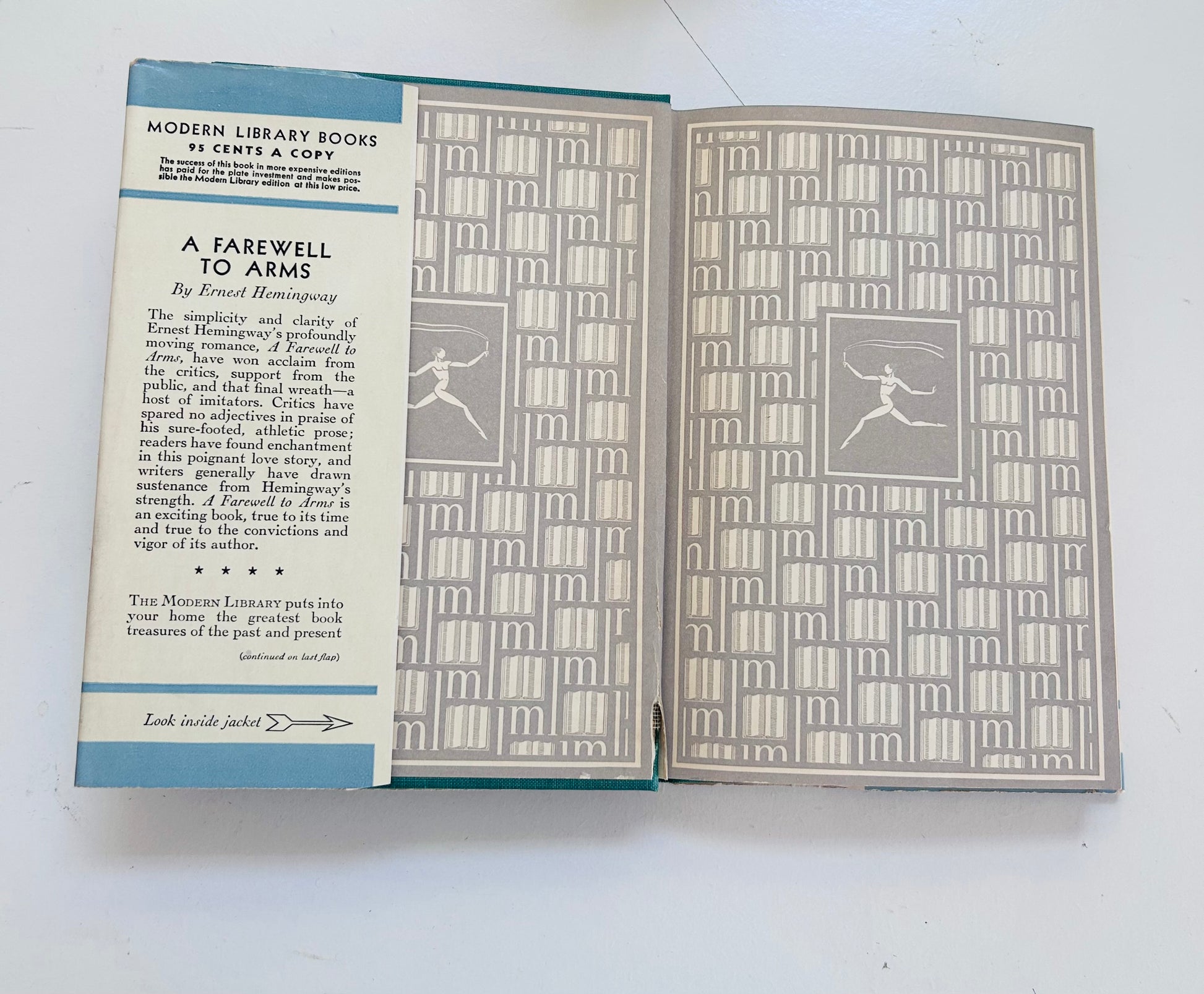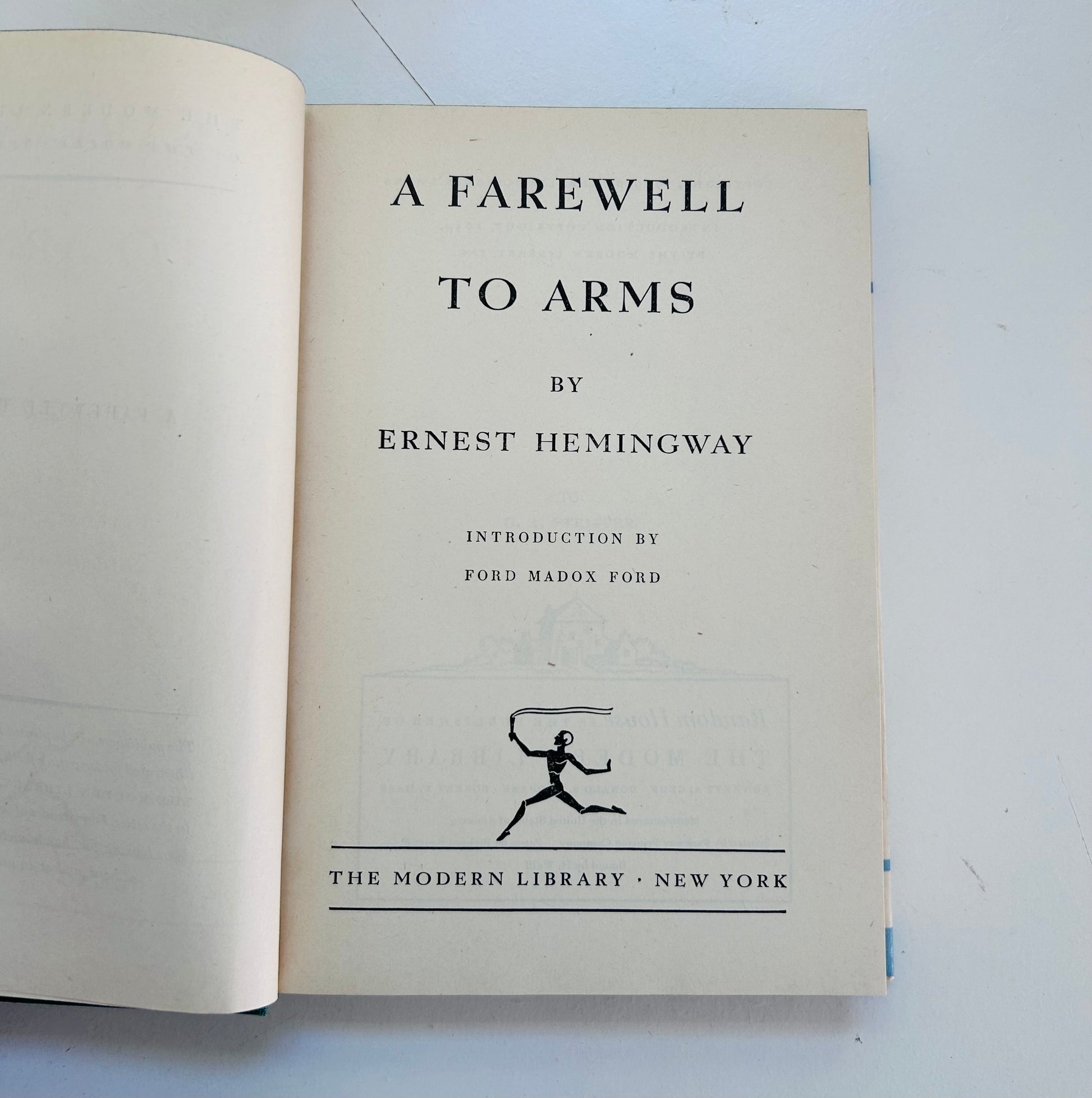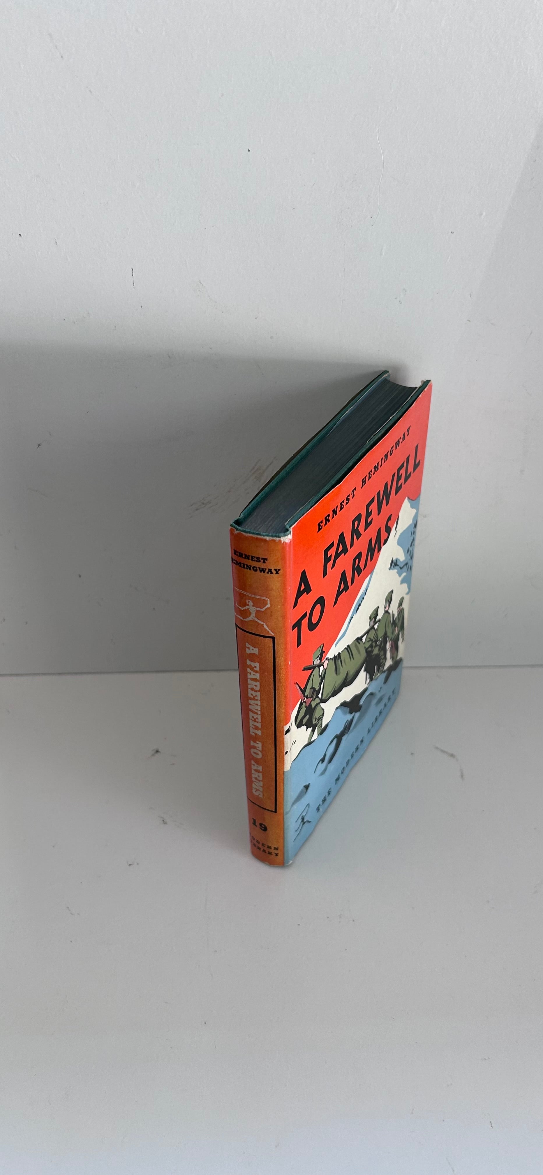 Ernest Hemingway. First Modern Library edition (#19). New York: The Modern Library, 1932. NAP. Both unclipped, iconic dust jacket and hardcover are in Near Fine condition. Original price (95 cents) still on inside flap. No writing or markings found in this extremely clean, square, tight, and well-preserved edition, 355 pp. Some minor chipping on top of spine, and edges, otherwise, the nicest DJ we've seen for this edition! Kent-style endpapers. Introduction written by Ford Maddox Ford.