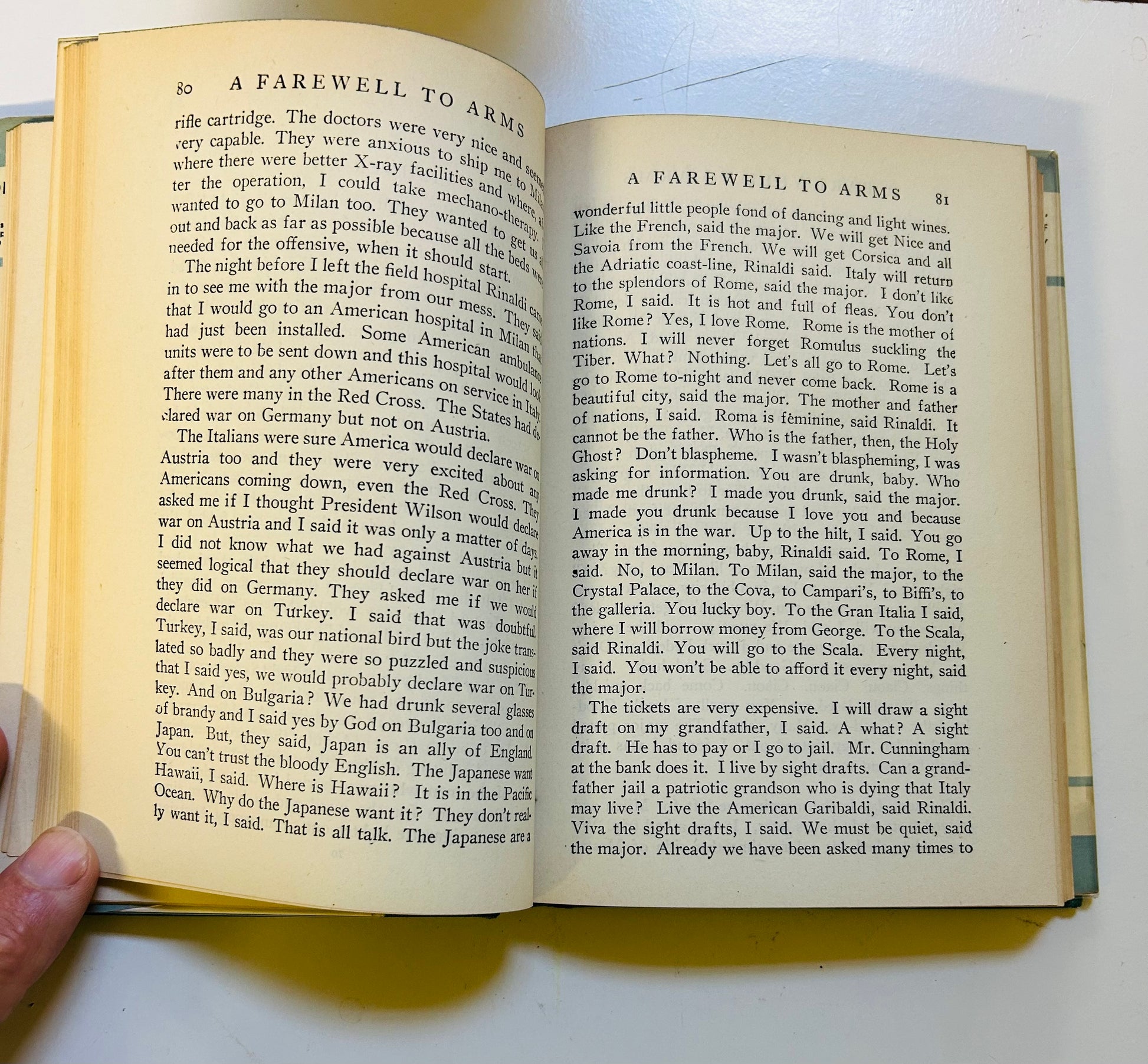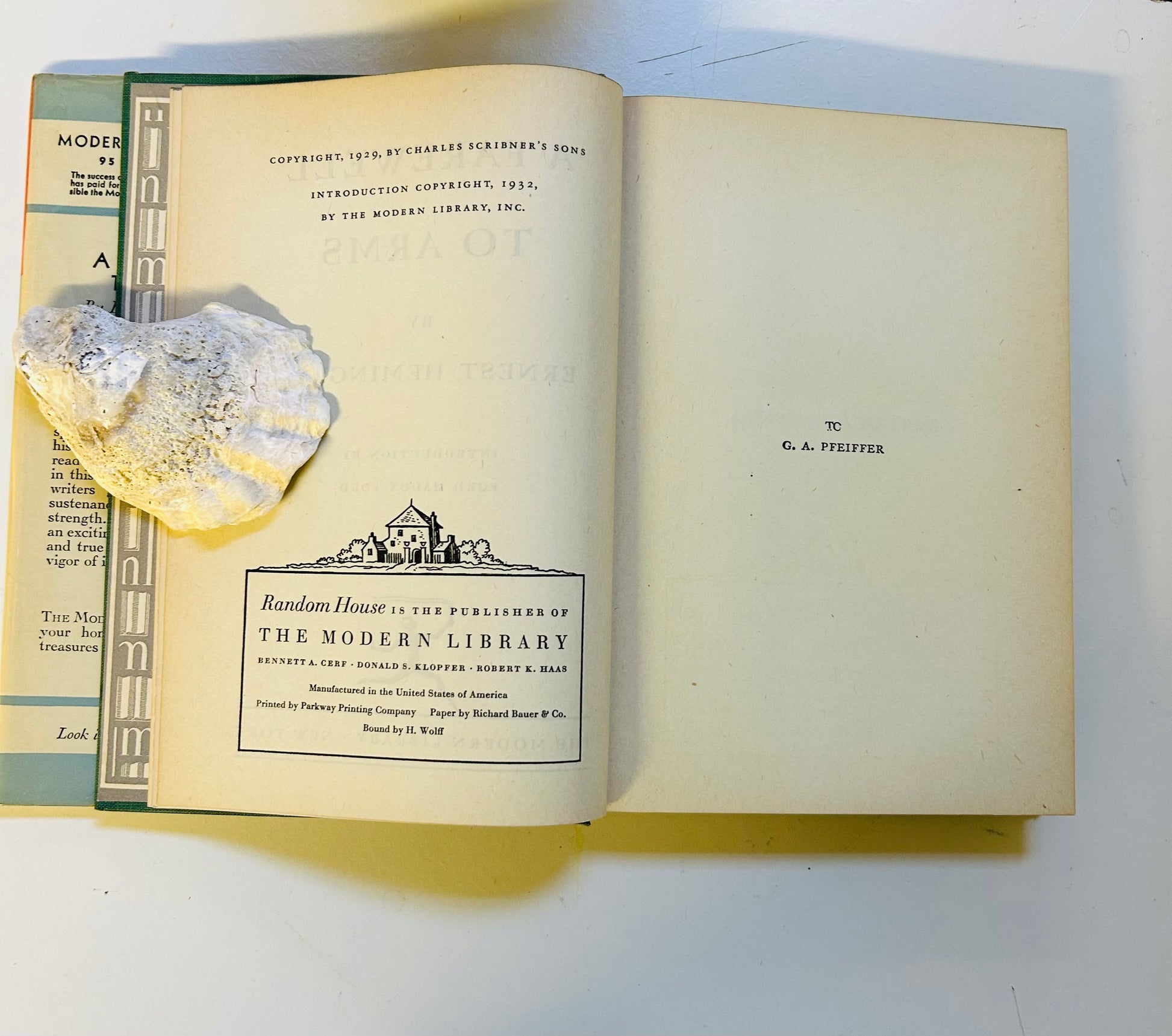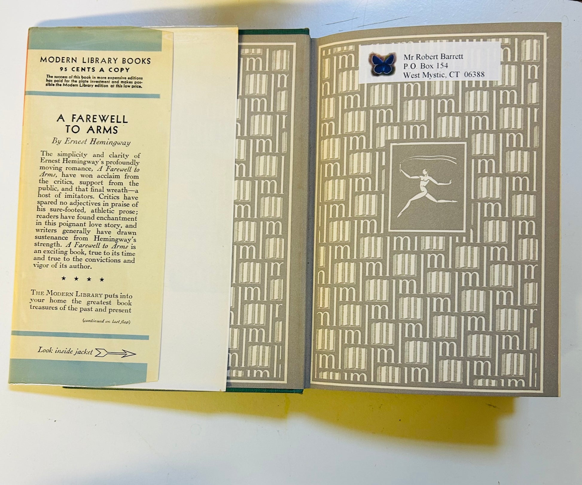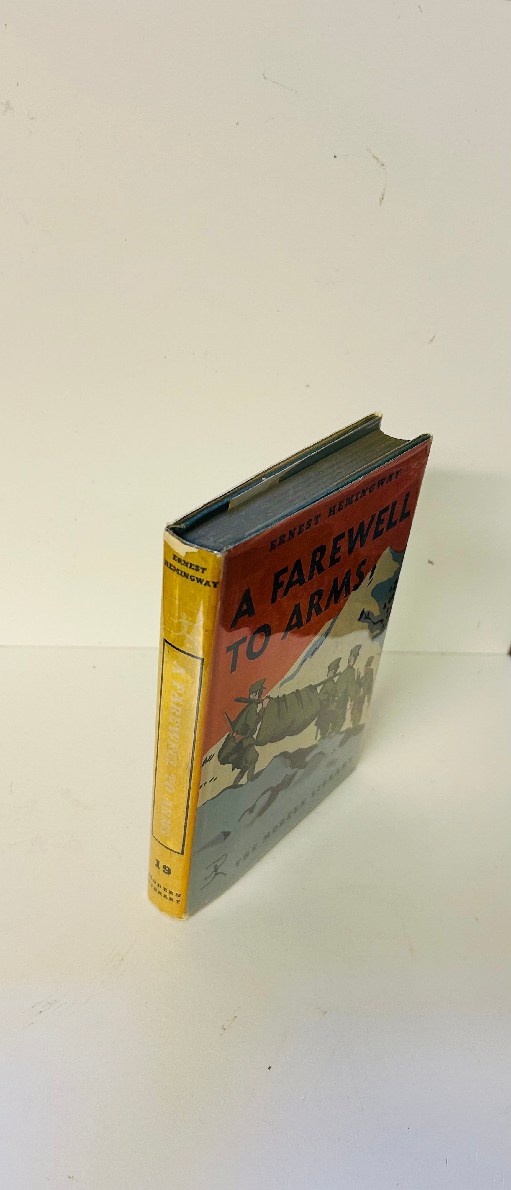 Ernest Hemingway. First Modern Library edition (#19). New York: The Modern Library, 1932. NAP. Both unclipped, iconic dust jacket (in a Mylar wrapper) and hardcover are in Very Good+ condition. Original price (95 cents) still on inside flap. No writing or markings found in this extremely clean, square, tight, and well-preserved edition, 355 pp. Some minor chipping on top of spine, and edges. Kent-style endpapers. Introduction written by Ford Maddox Ford. Former owner signature on inside flyleaf.