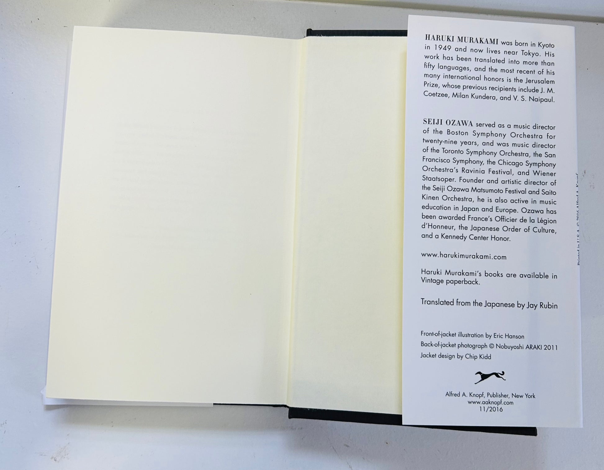 Haruki Murakami. Stated first U.S. edition, first printing. New York: Alfred A. Knopf, 2016. Jacket design by the great Chip Kidd. Unclipped dust jacket is in Very Good+ condition. The only blemish is a small chip on the front lower right side. The hardcover is in Fine condition. No writing or markings in this very clean, well preserved edition, 325 pp. Translated from Japanese by Jay Rubin.