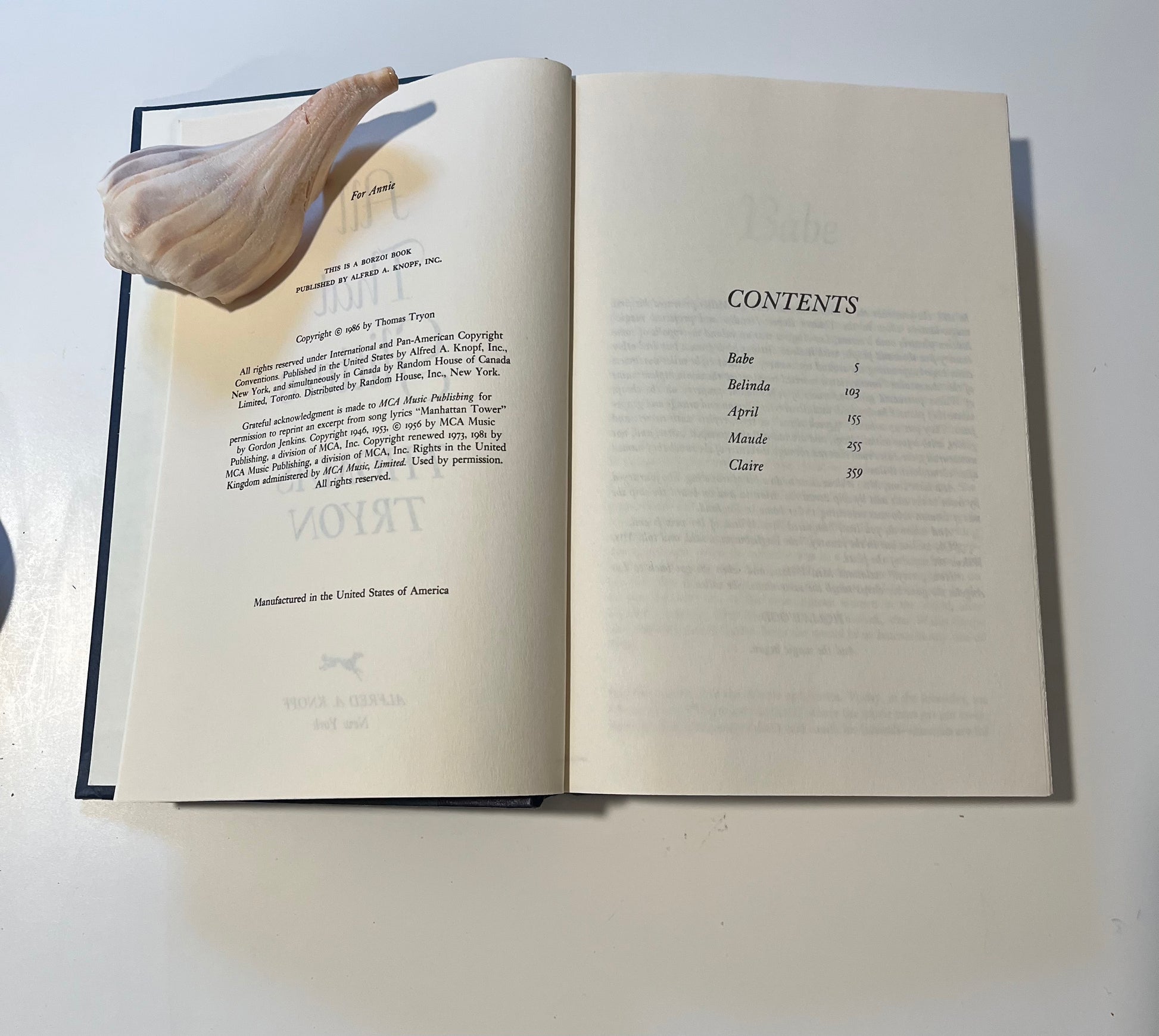 Thomas Tryon. First edition, later printing. BCE. Dust Jacket: Very Good. An unclipped jacket designed by the great Paul Bacon. A small 1/4 inch tear on spine with some chipping. Hardcover: Very Good+ New York: Alfred A. Knopf, 1986. Blue cloth with gold lettering on spine. No markings or writing in the book, 479 pp.