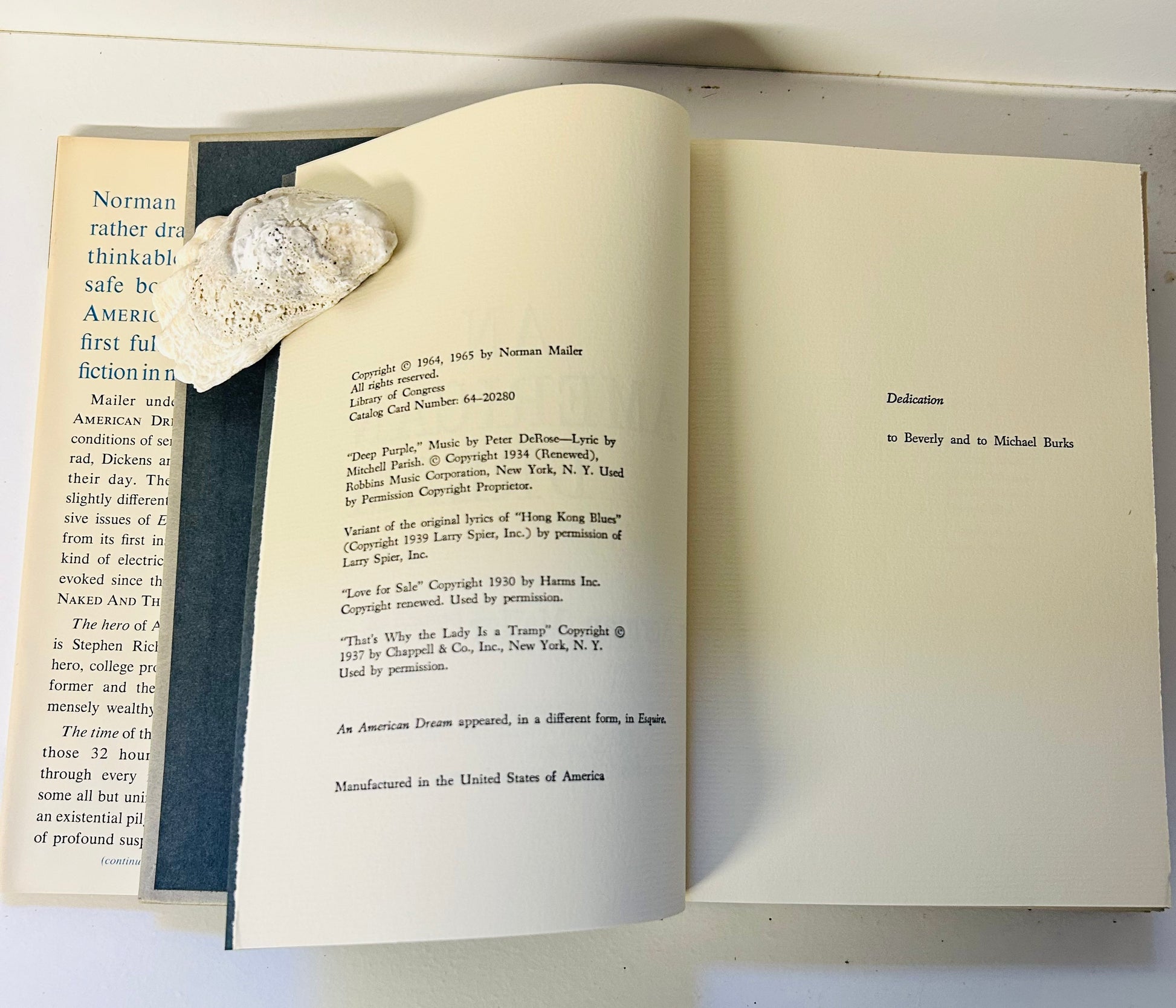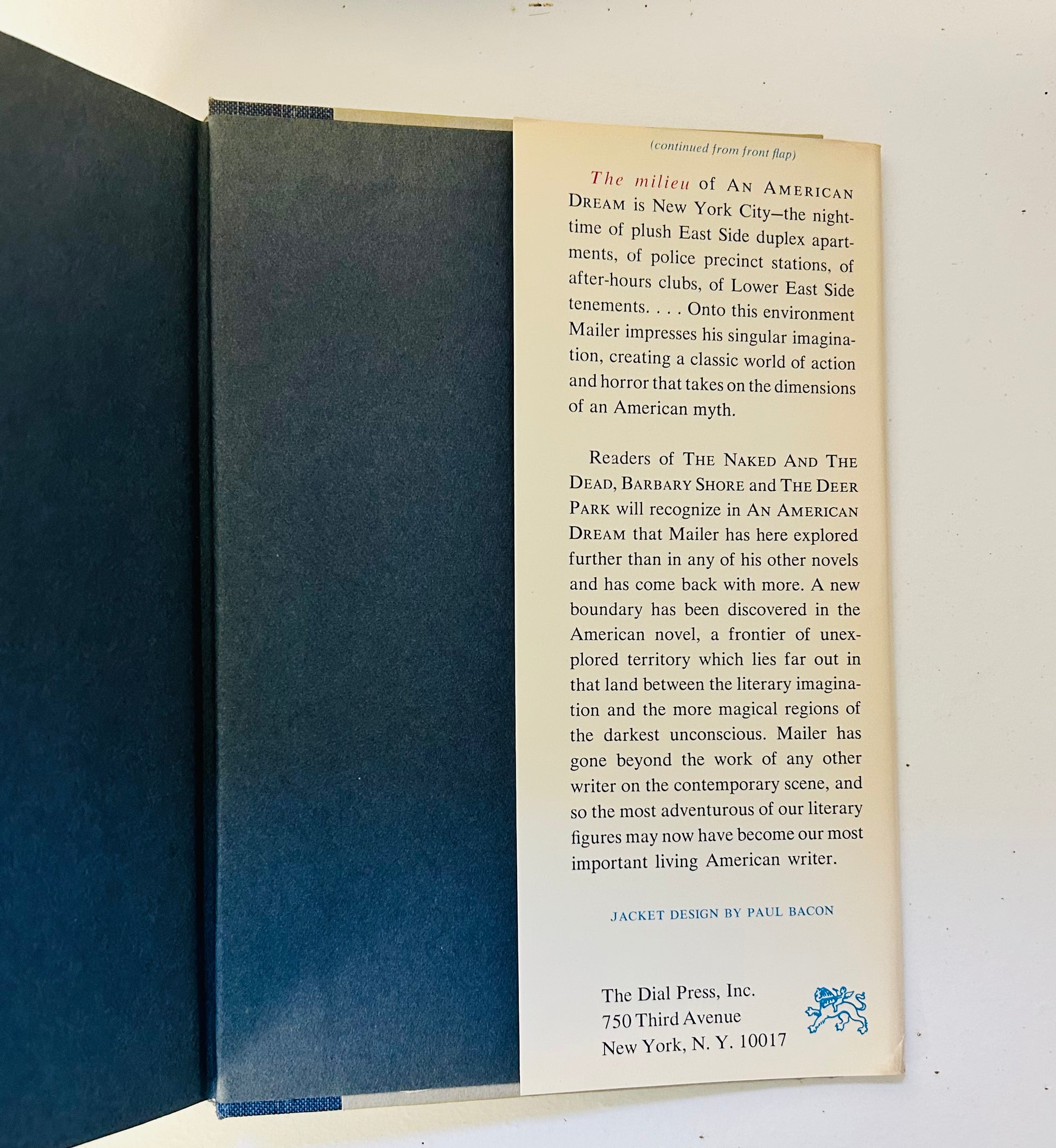 "The milieu of An American Dream is New York City; the nighttime of plush East Side duplex apartments, of police precinct stations, of after-hours clubs, of Lower East side tenements. Onto this environment Mailer impresses his singular imagination, creating a classic world of action and horror that takes on the dimensions of an American myth."