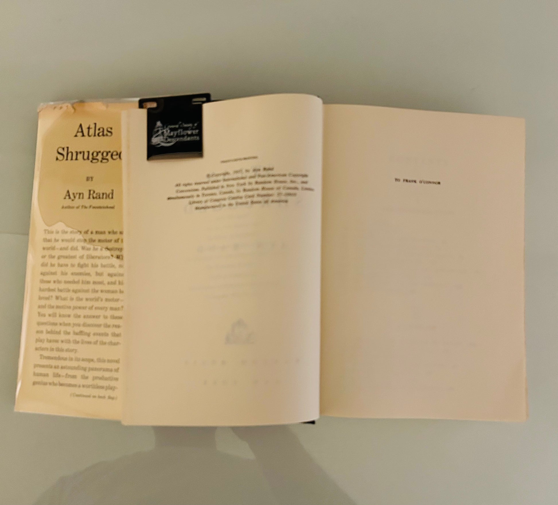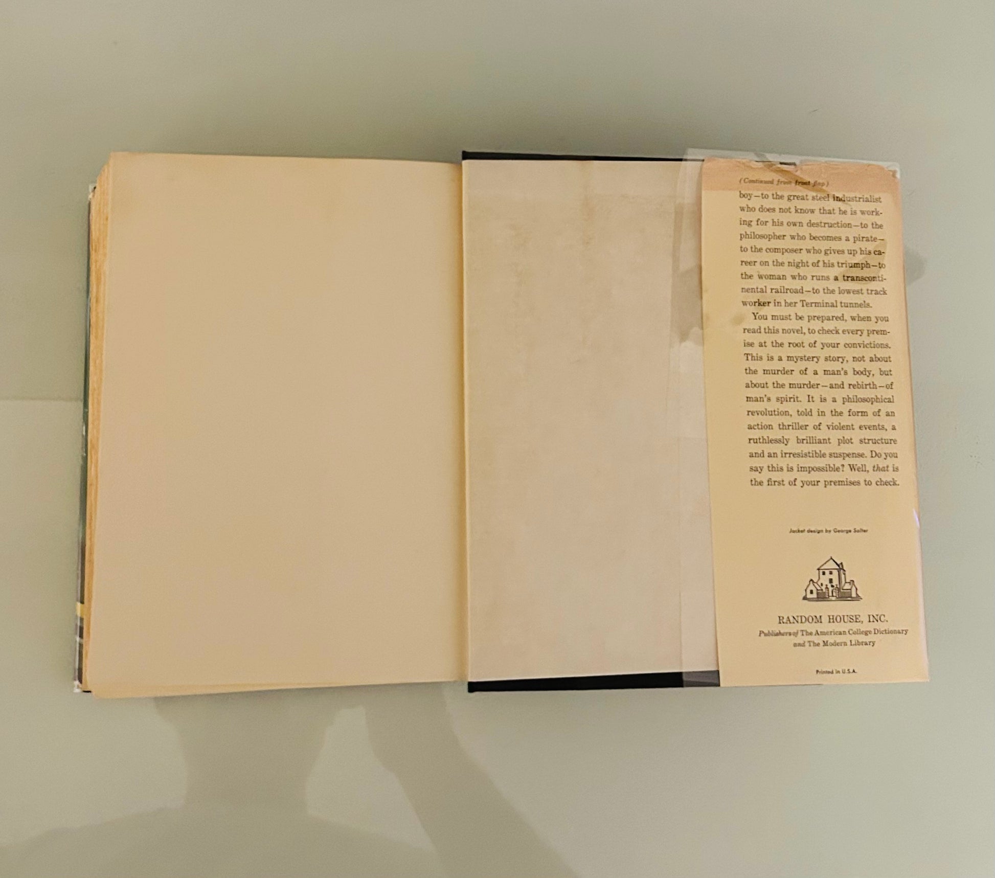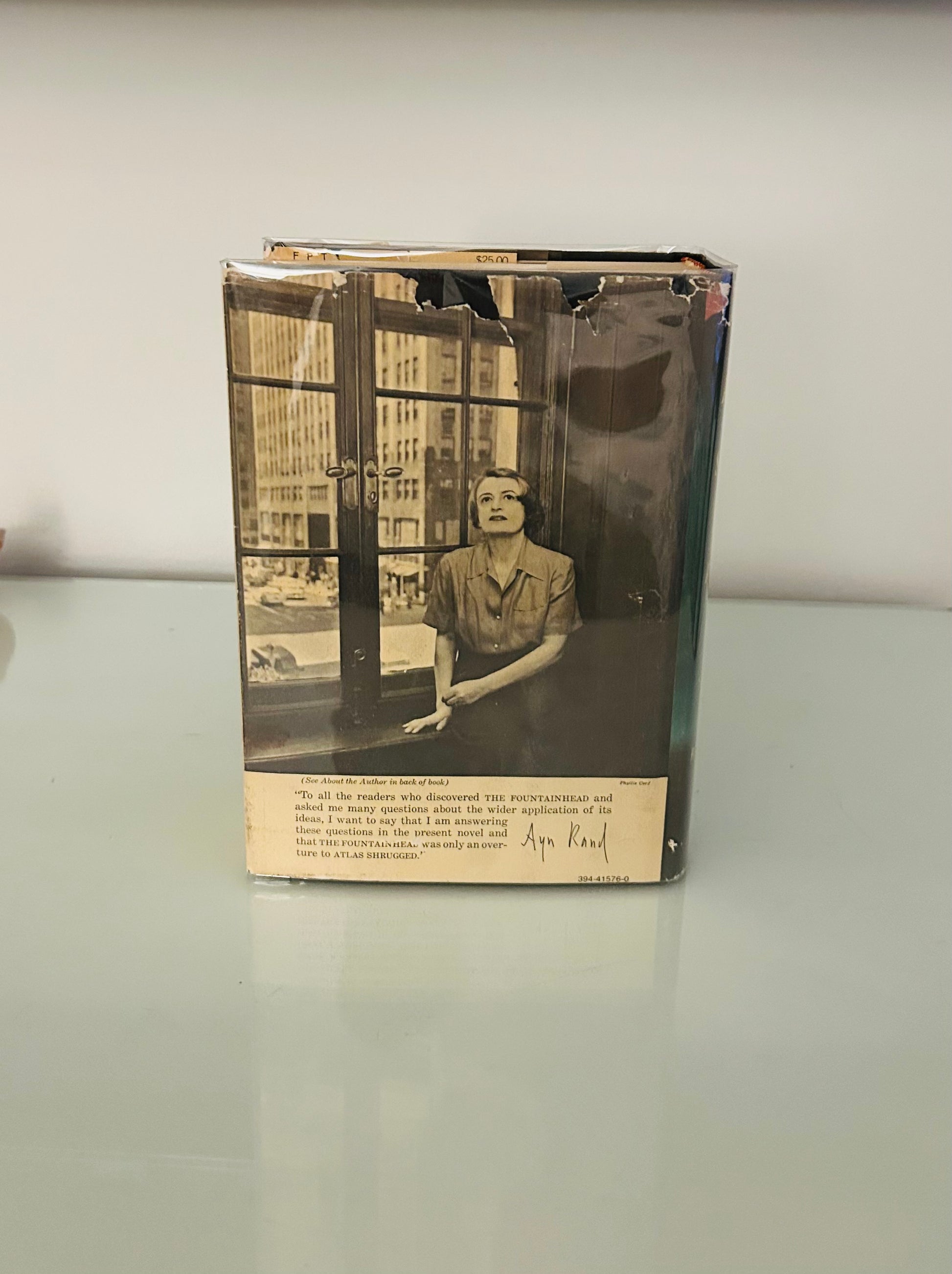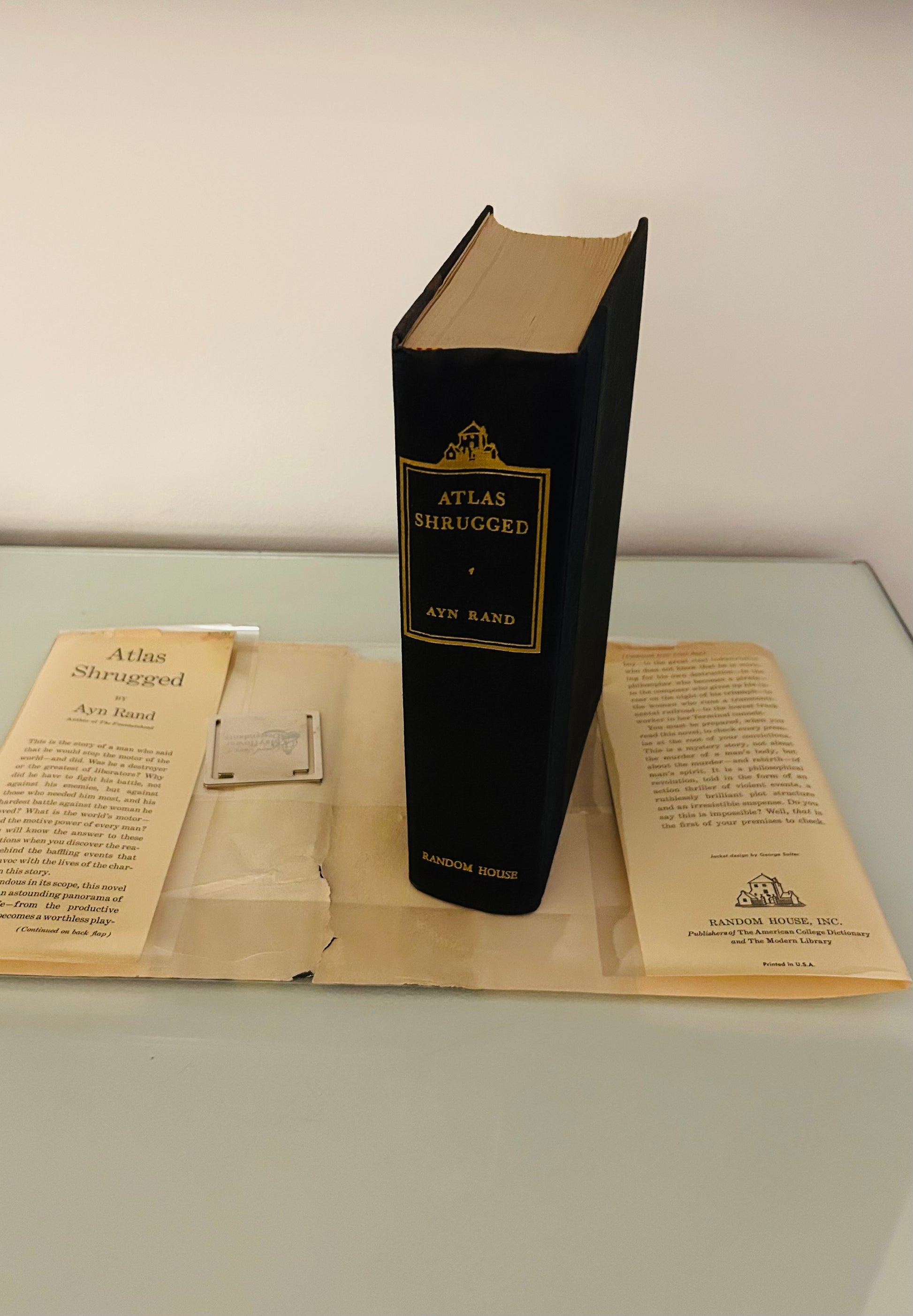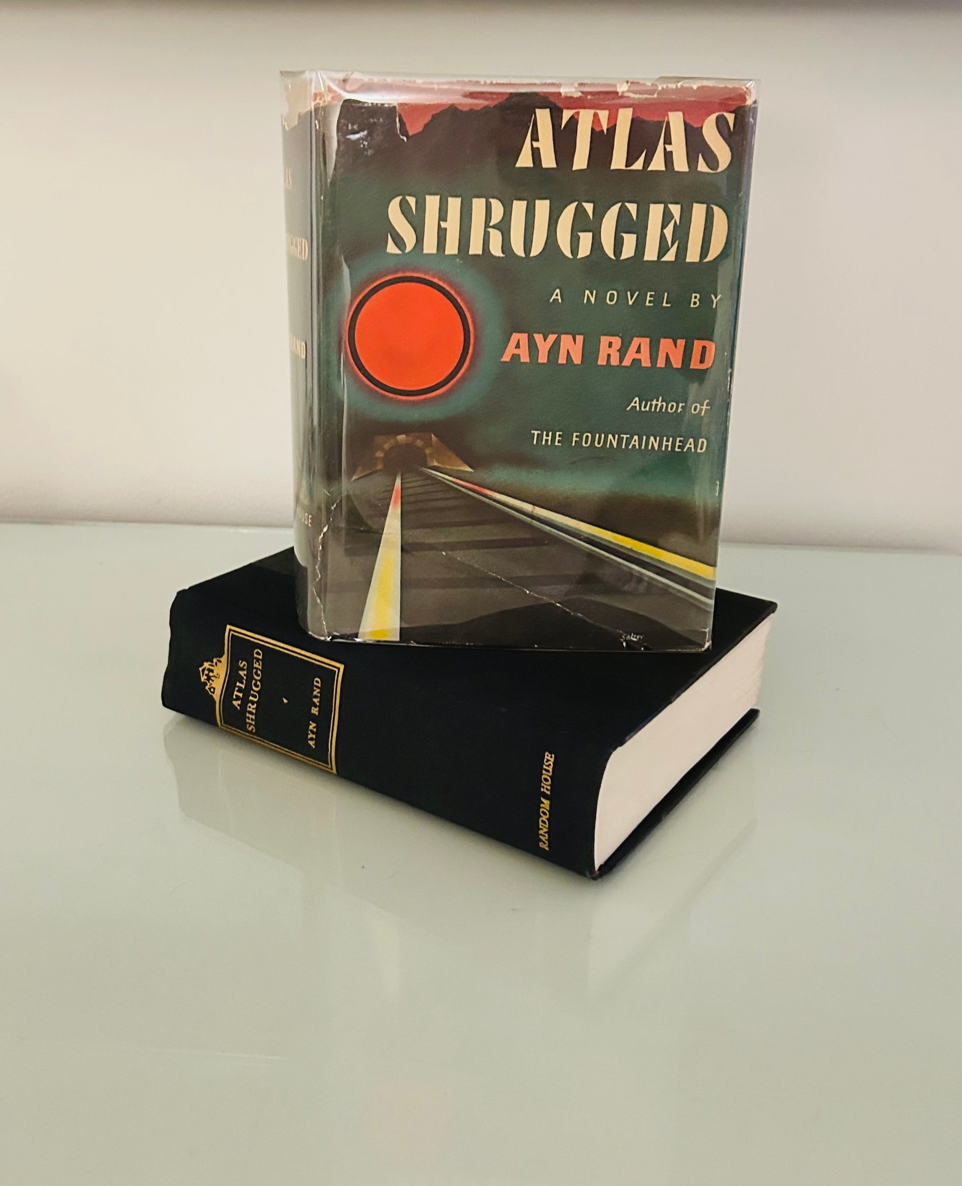 Ayn Rand. First edition, twenty-fifth printing (stated). New York: Random House, 1957. Unclipped dust jacket, in a mylar wrapper, is in Very Good condition. There is a piece missing and a tear along the crease and the top of spine as well on a few of the edges. Jacket designed by the great George Salter. The hardcover is in Very Good+ condition. There is no writing or markings found in the book, 1168 pp.
