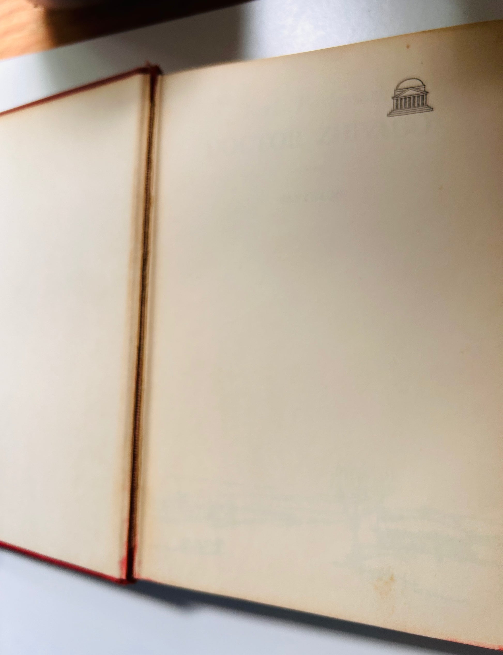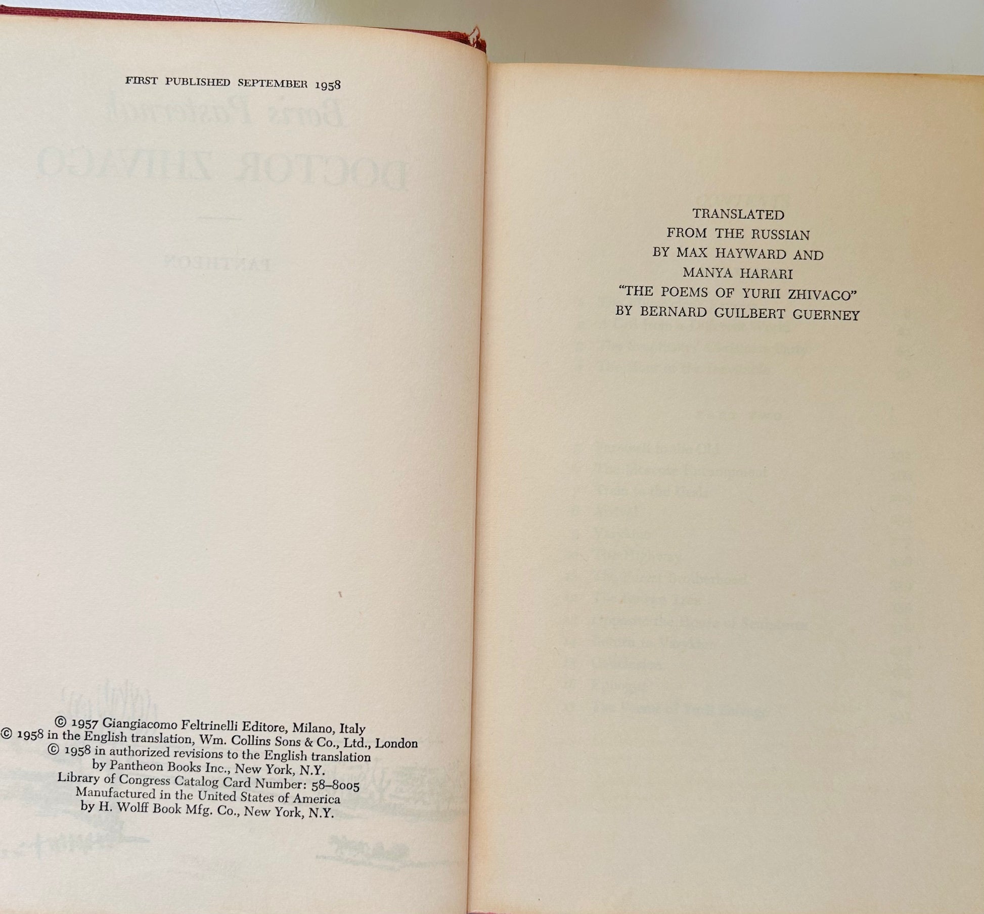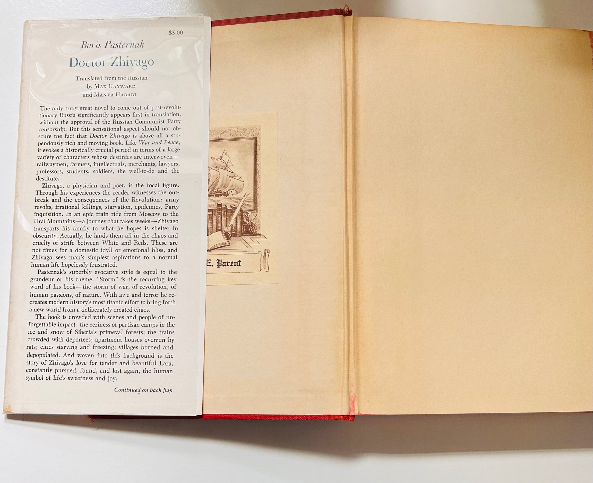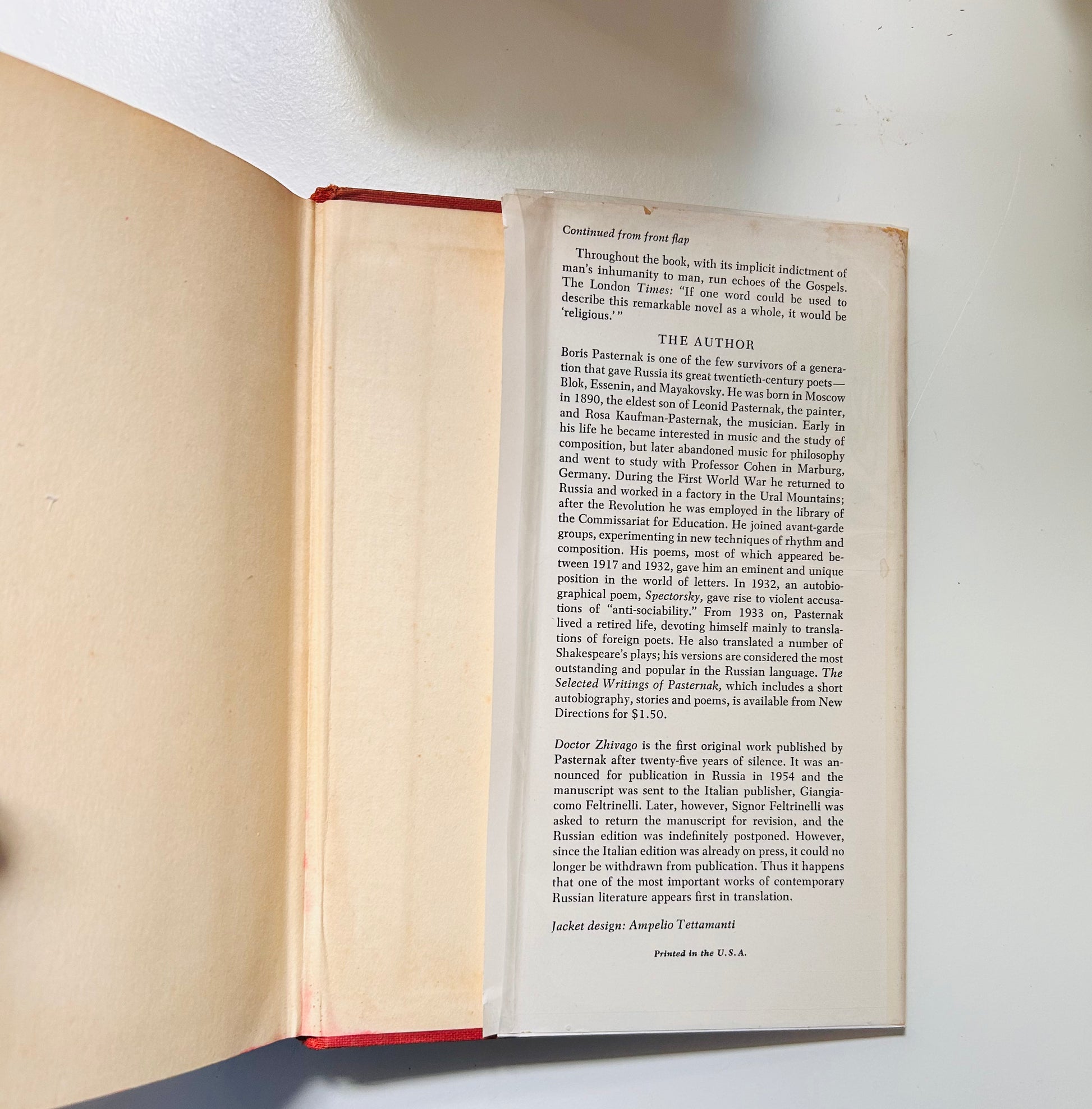 Boris Pasternak. First American edition, first printing. New York: Pantheon, 1958. Dust jacket is unclipped and in Very Good+ condition with original price $5.00 on inside flap. In a mylar protective wrapper. Jacket design by Ampelio Tettamante. Hardcover is in Very Good condition with some light discoloration on front cover. No writing or markings in the book, 558 pp.