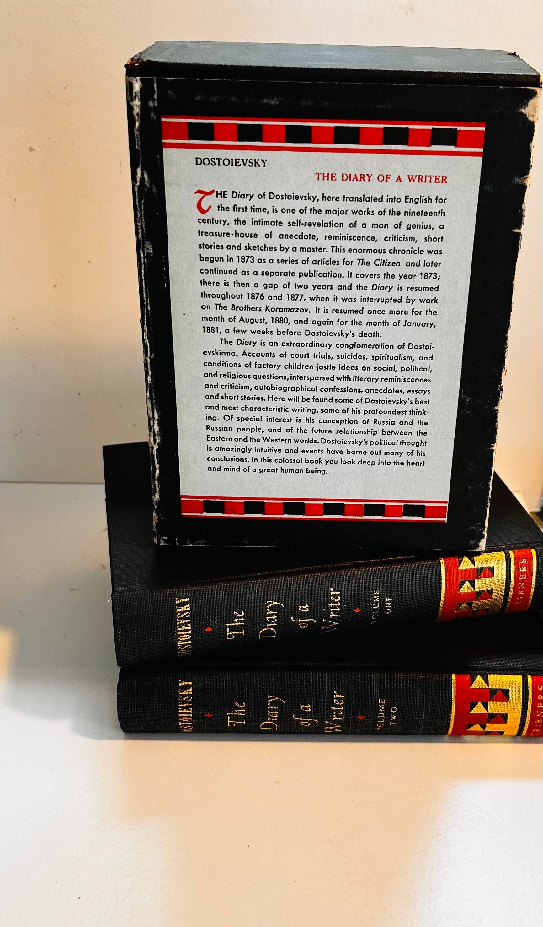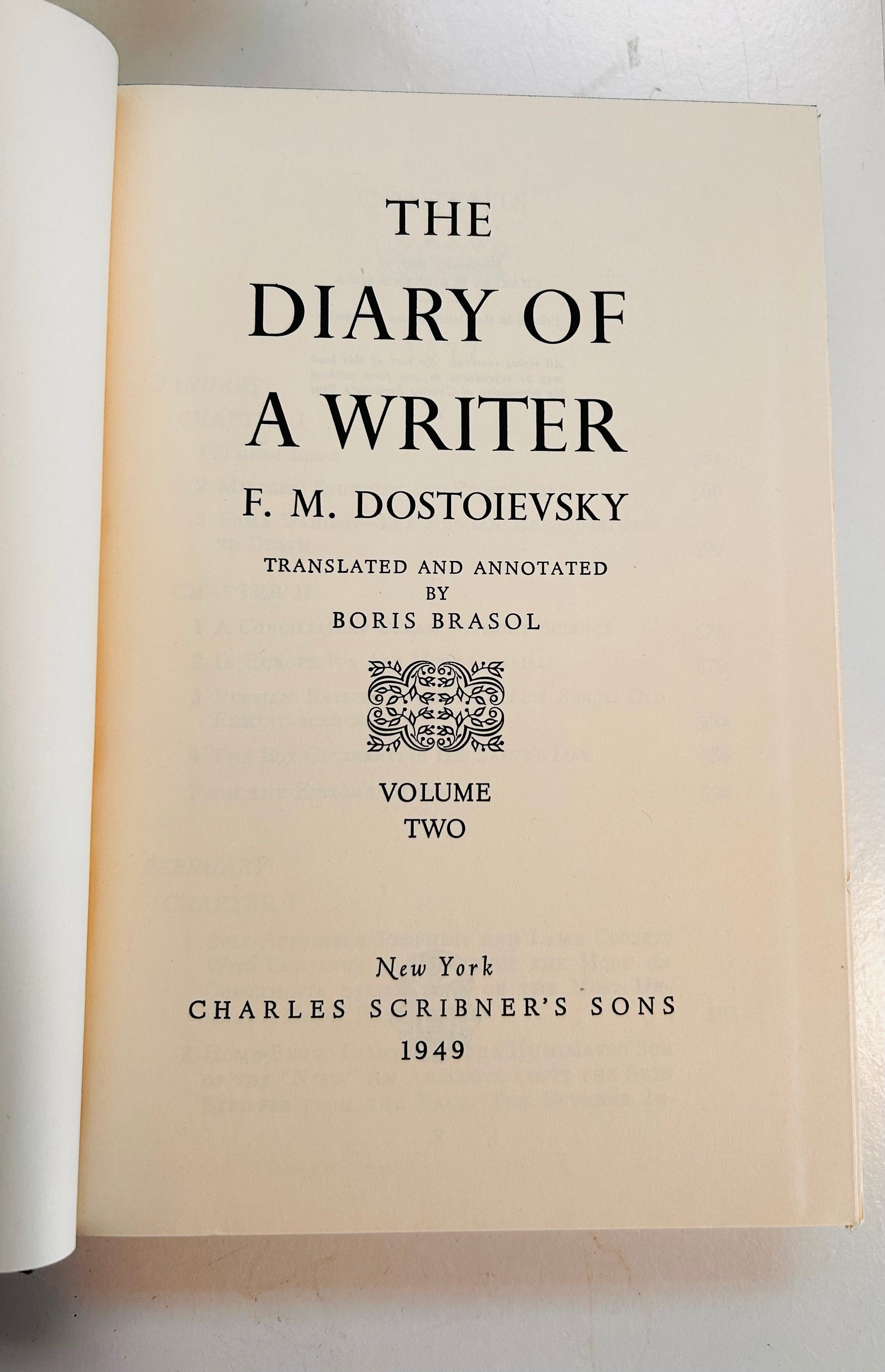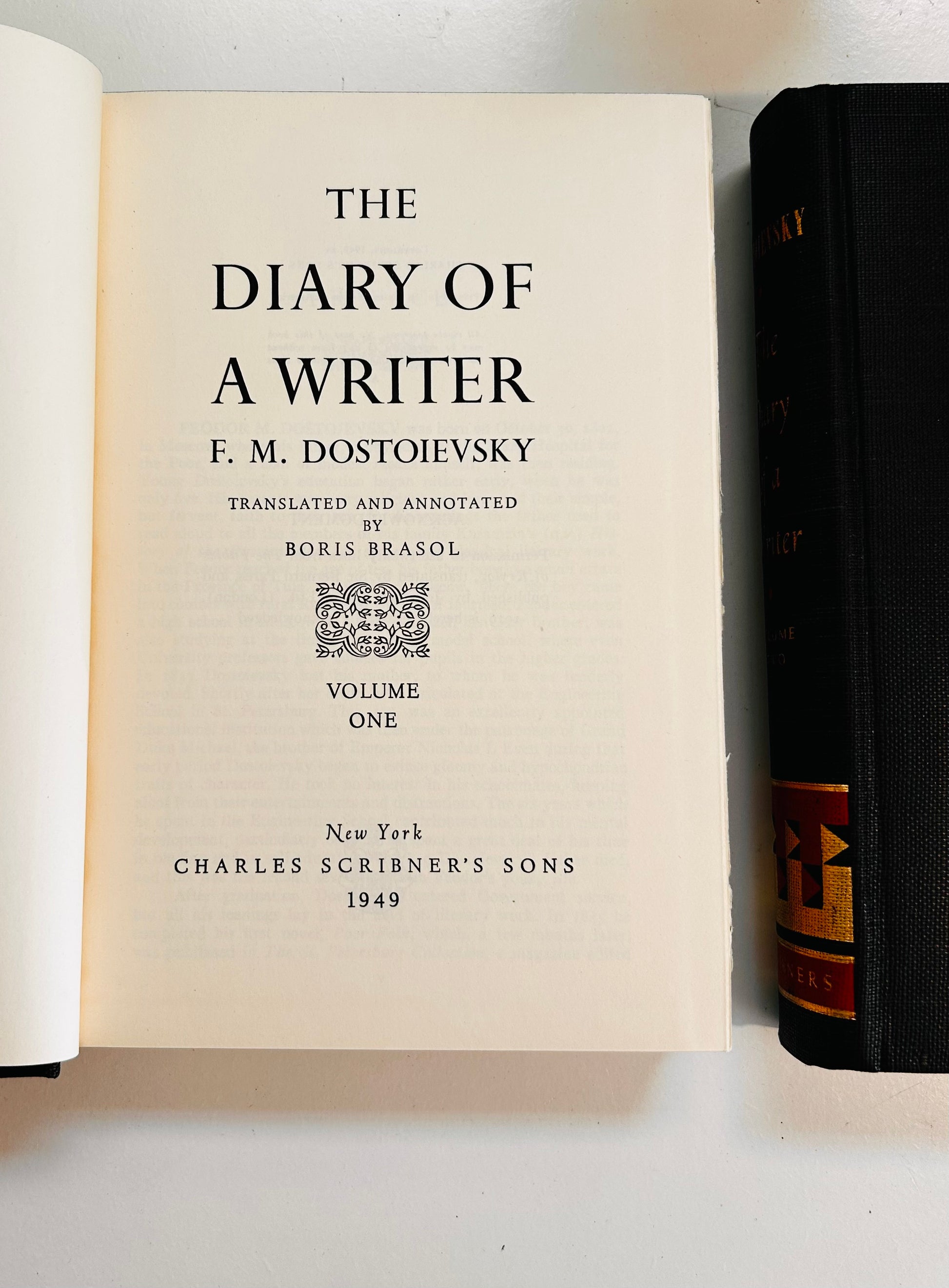 A near fine two-volume first edition set of The Diary of a Writer by Fyodor Dostoievsky, translated by Boris Brasol. Originally published in installments in Russia, this collection of essays, reflections, and commentary offers a rare window into Dostoievsky’s thoughts on politics, philosophy, literature, and the moral questions of his age.