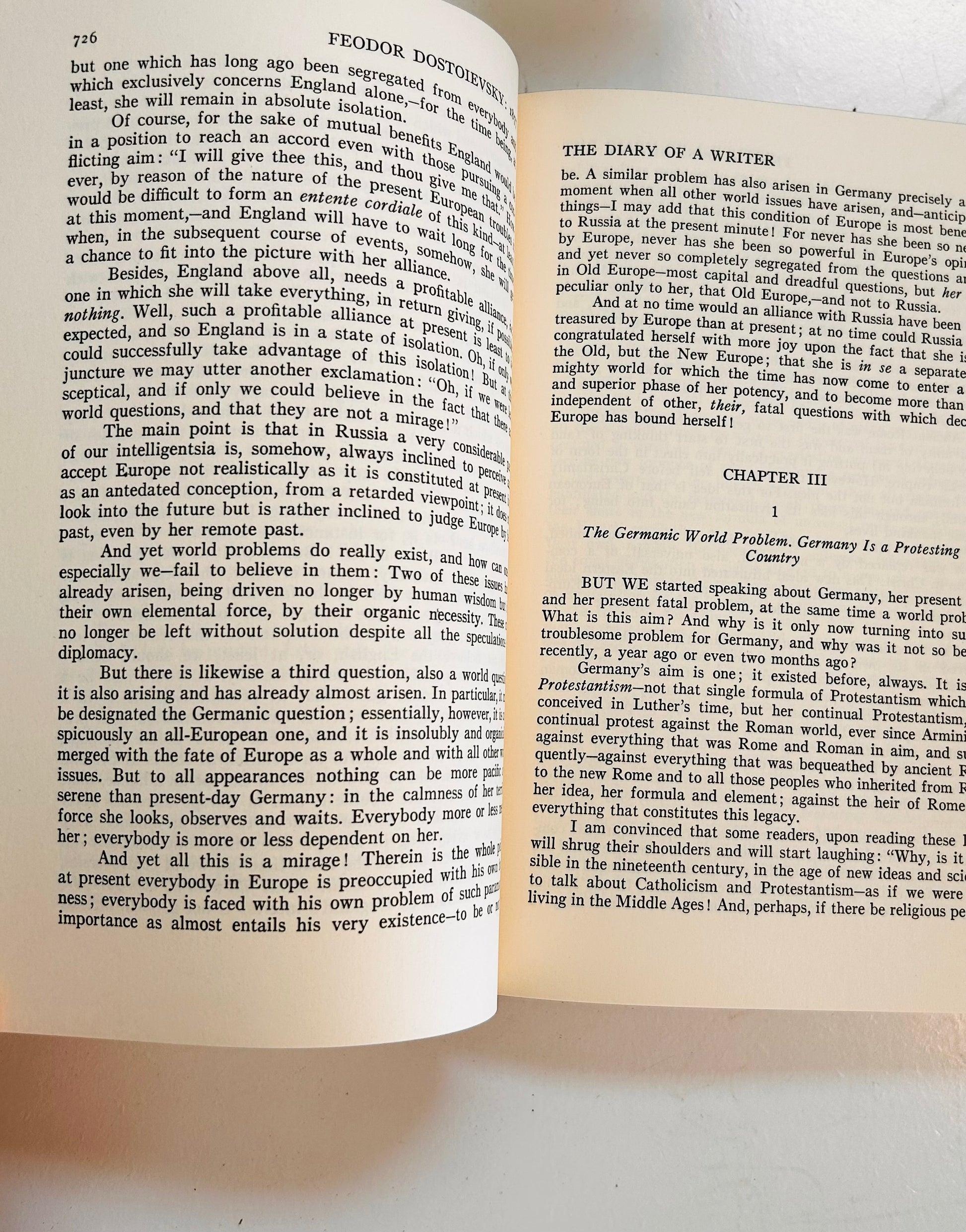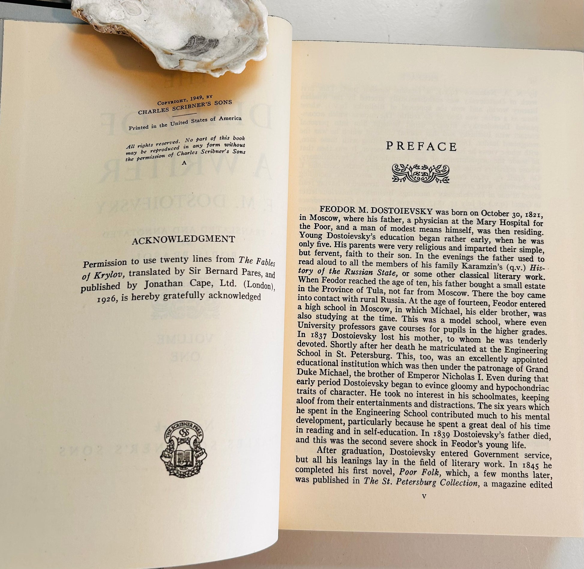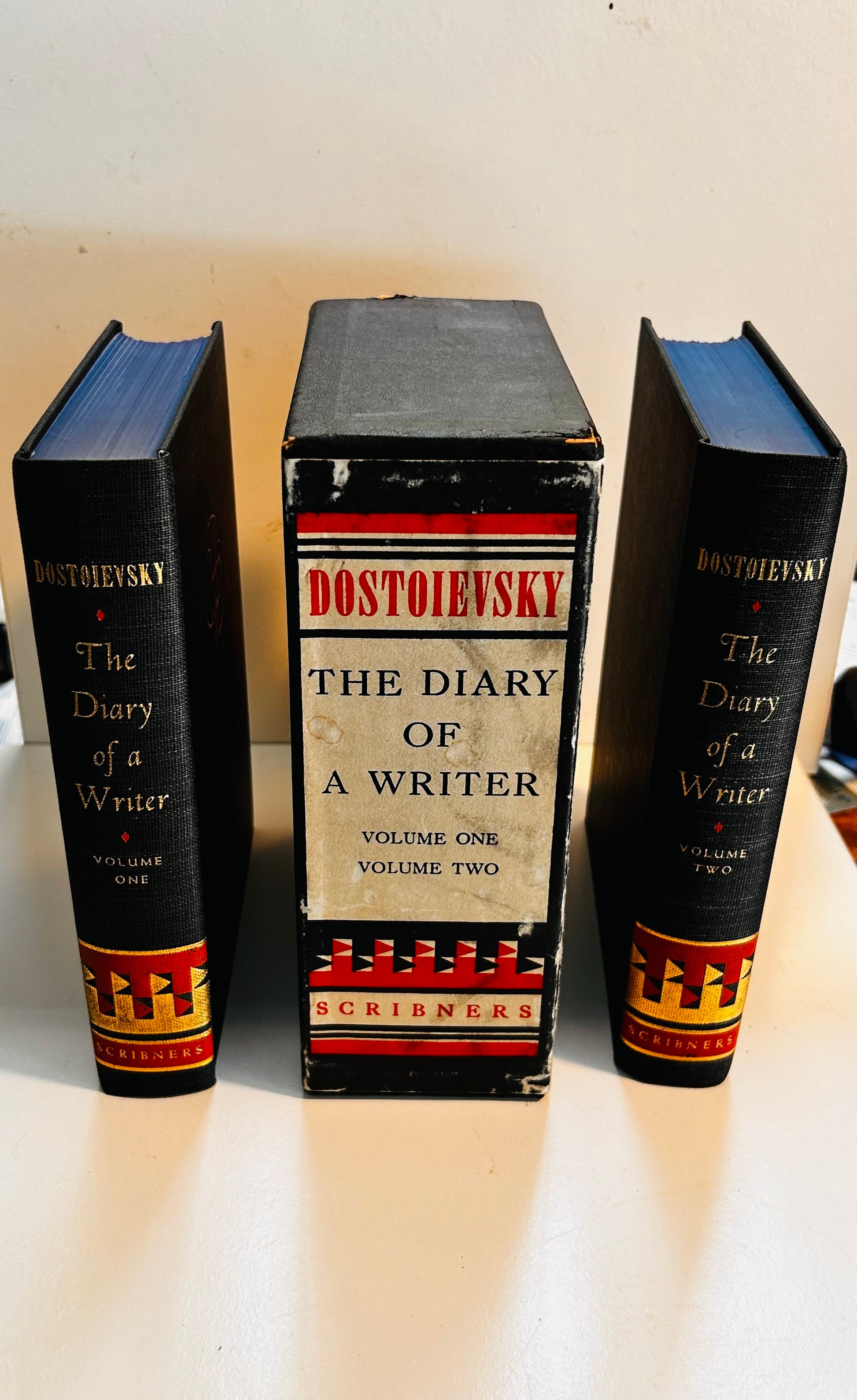 A near fine two-volume first edition set of The Diary of a Writer by Fyodor Dostoievsky, translated by Boris Brasol. Originally published in installments in Russia, this collection of essays, reflections, and commentary offers a rare window into Dostoievsky’s thoughts on politics, philosophy, literature, and the moral questions of his age.