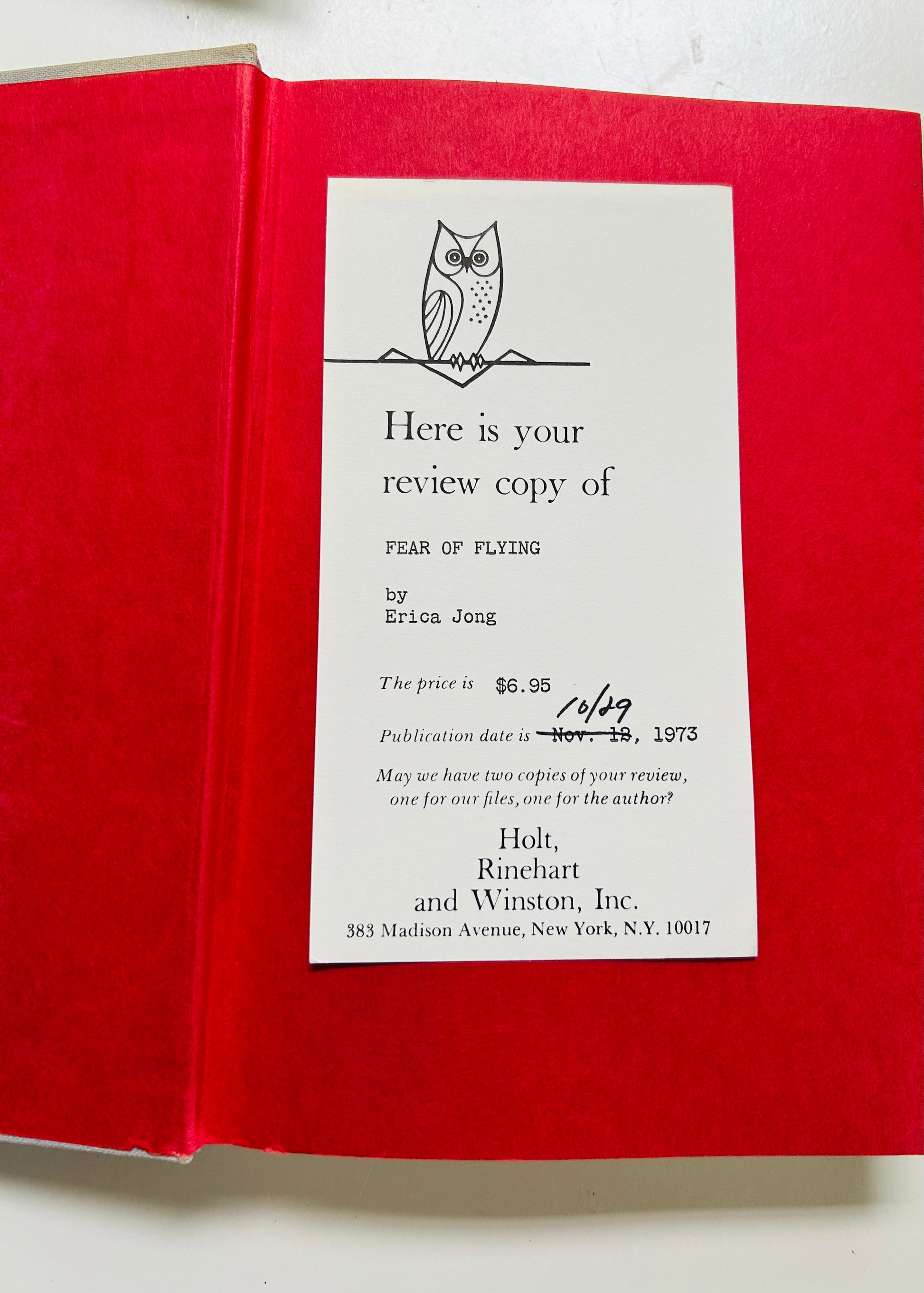 A modern feminist classic, Fear of Flying burst onto the literary scene in 1973 with its candid exploration of female desire, independence, and identity. This is a rare Advance Review Copy of the First Edition, complete with the original review slip laid in—a scarce collectible from the earliest promotion of this groundbreaking novel.