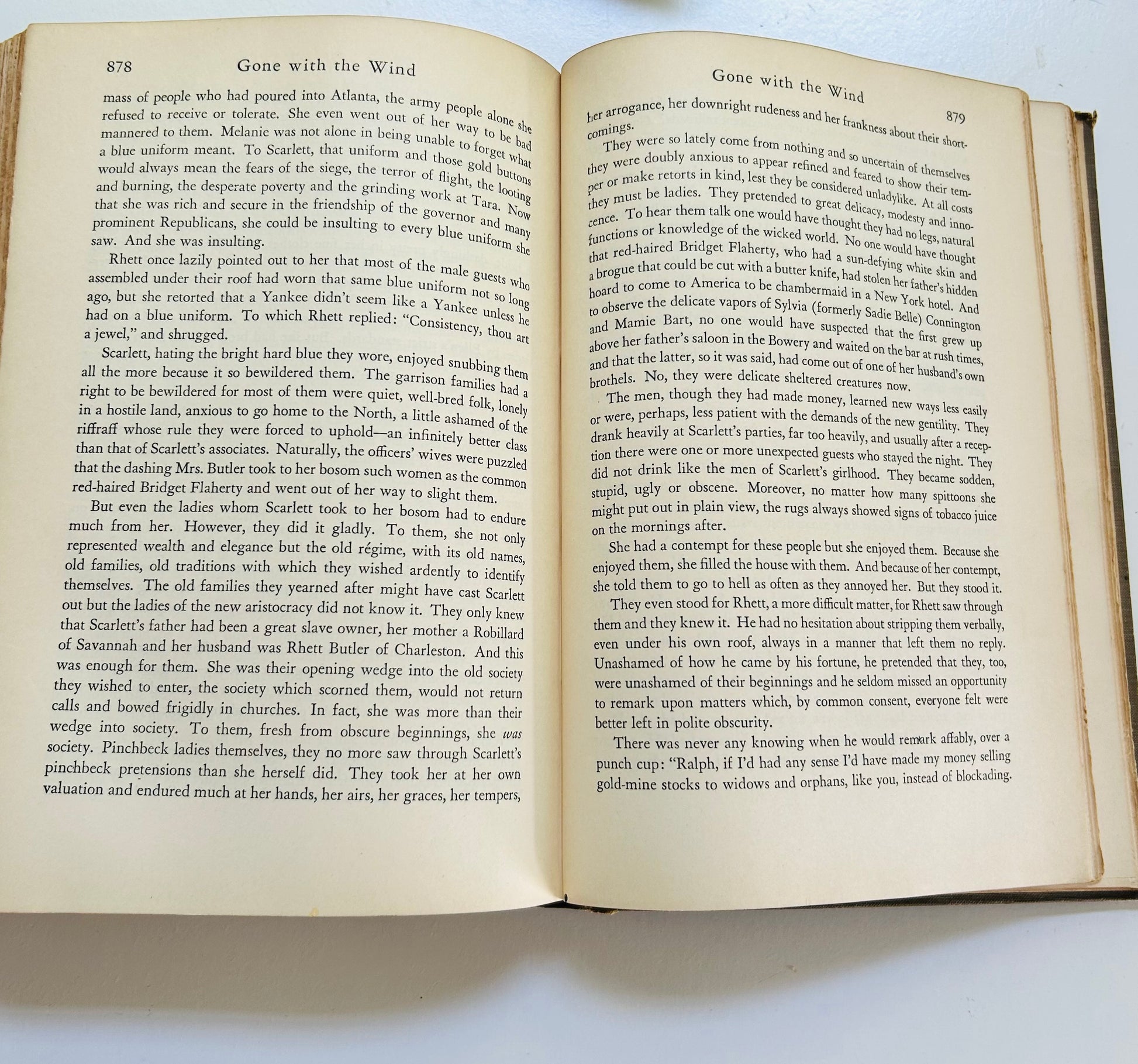 Margaret Mitchell. First edition, eighth printing. Missing dust jacket (we may get a facsimile for this). The book is in Beey Good condition, binding is sturdy and pages are clean. Former owner signature on flyleaf, otherwise, no additional writing or markings found on the book, 1035 pp. The 8th printing is still part of the first edition run, making it collectible.
