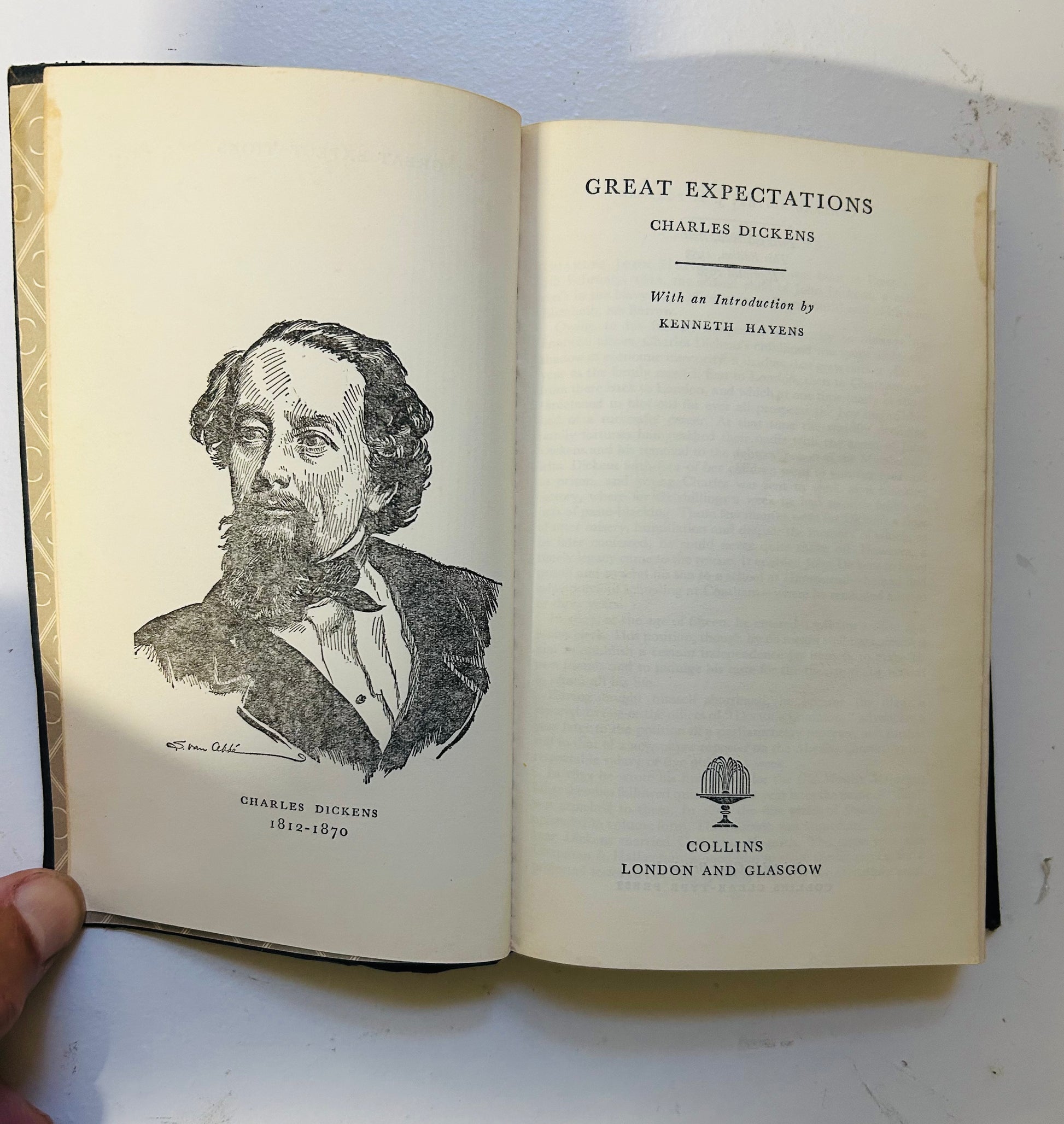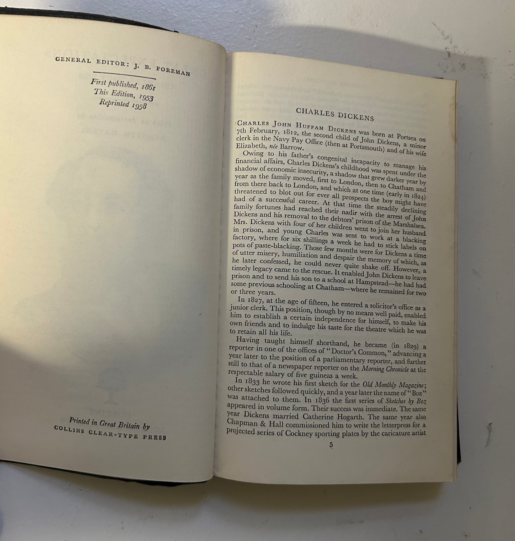 Charles Dickens. First edition thus, later printing. London: Collins, 1958. Edited by J.B. Foreman. Black leather bound edition in Very Good+ condition. Other than a small stain on pages (see photo), there is no writing or markings inside, 414 pp.