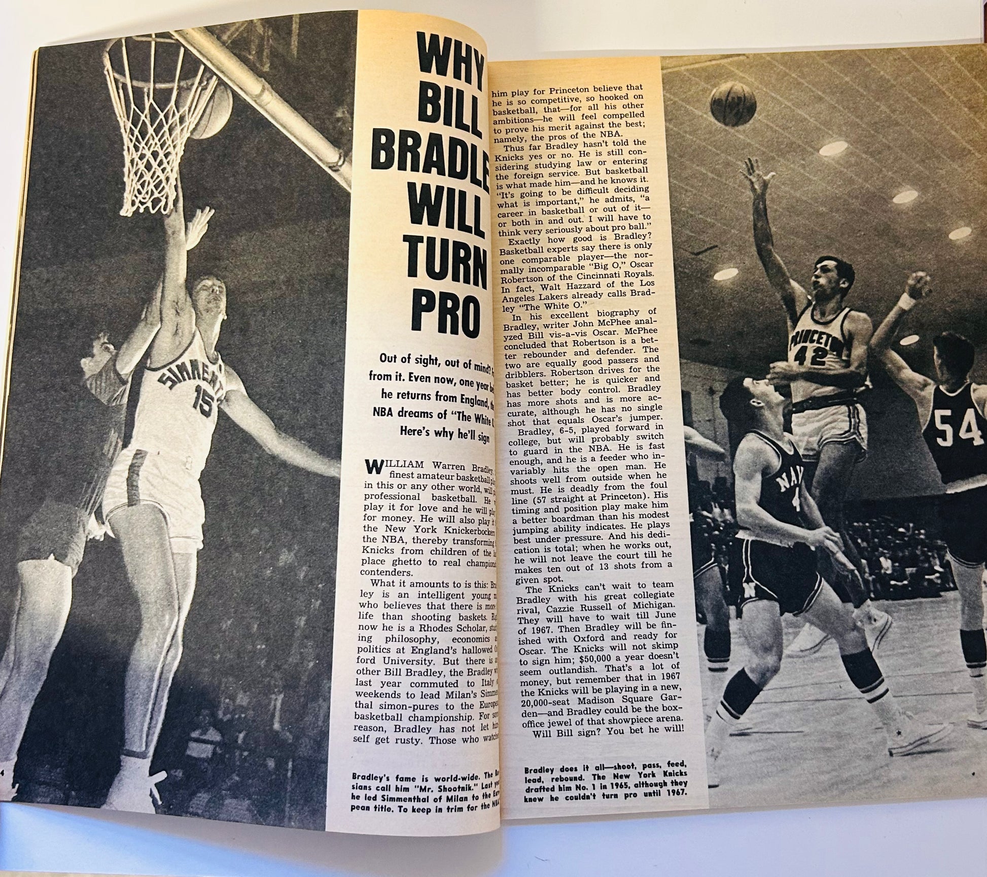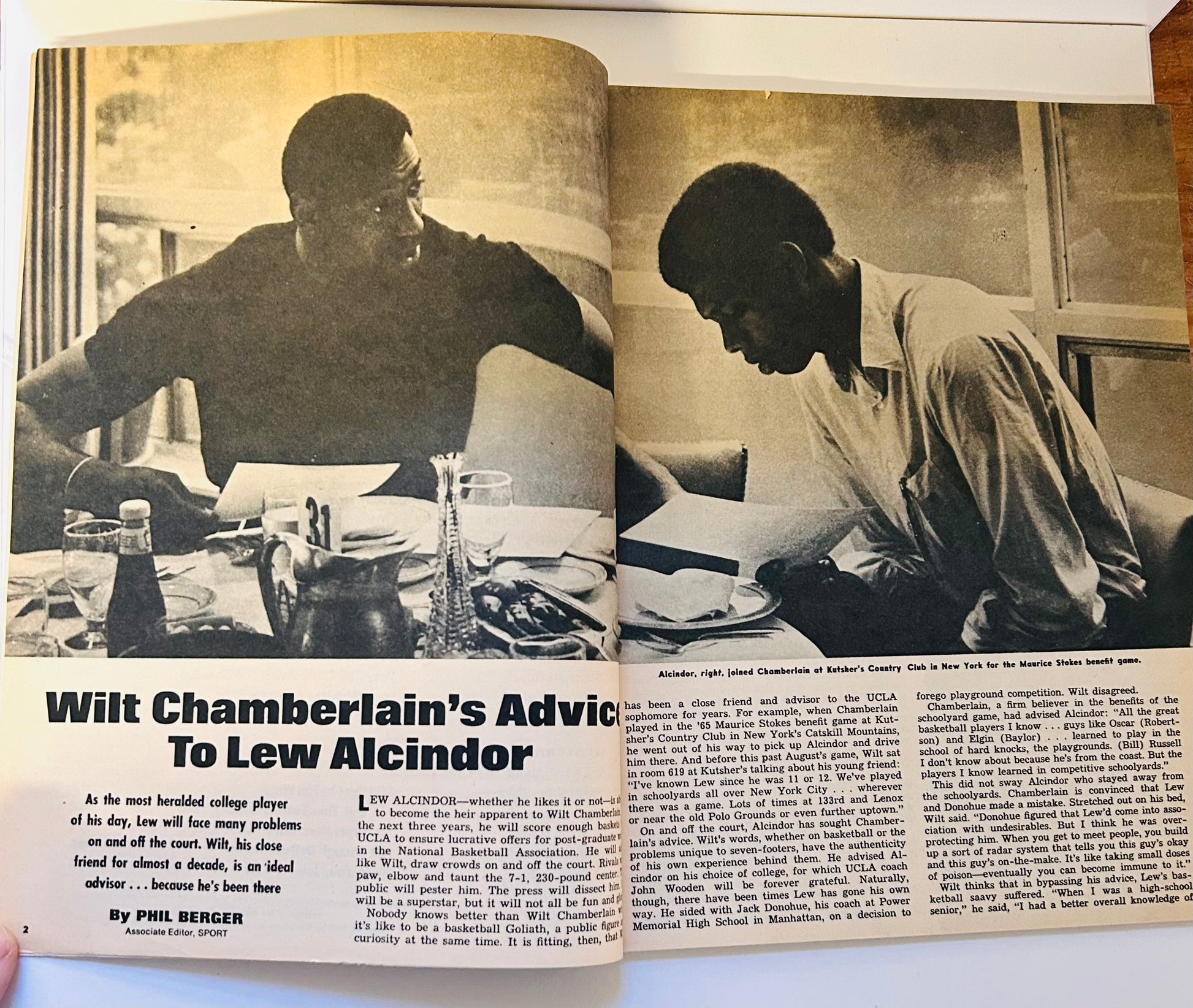 A 1967 copy of Inside Basketball magazine. In Very Good+ condition in a clear, mylar envelope. Has both Lew Alcindor and Wilt Chamberlin on the cover.