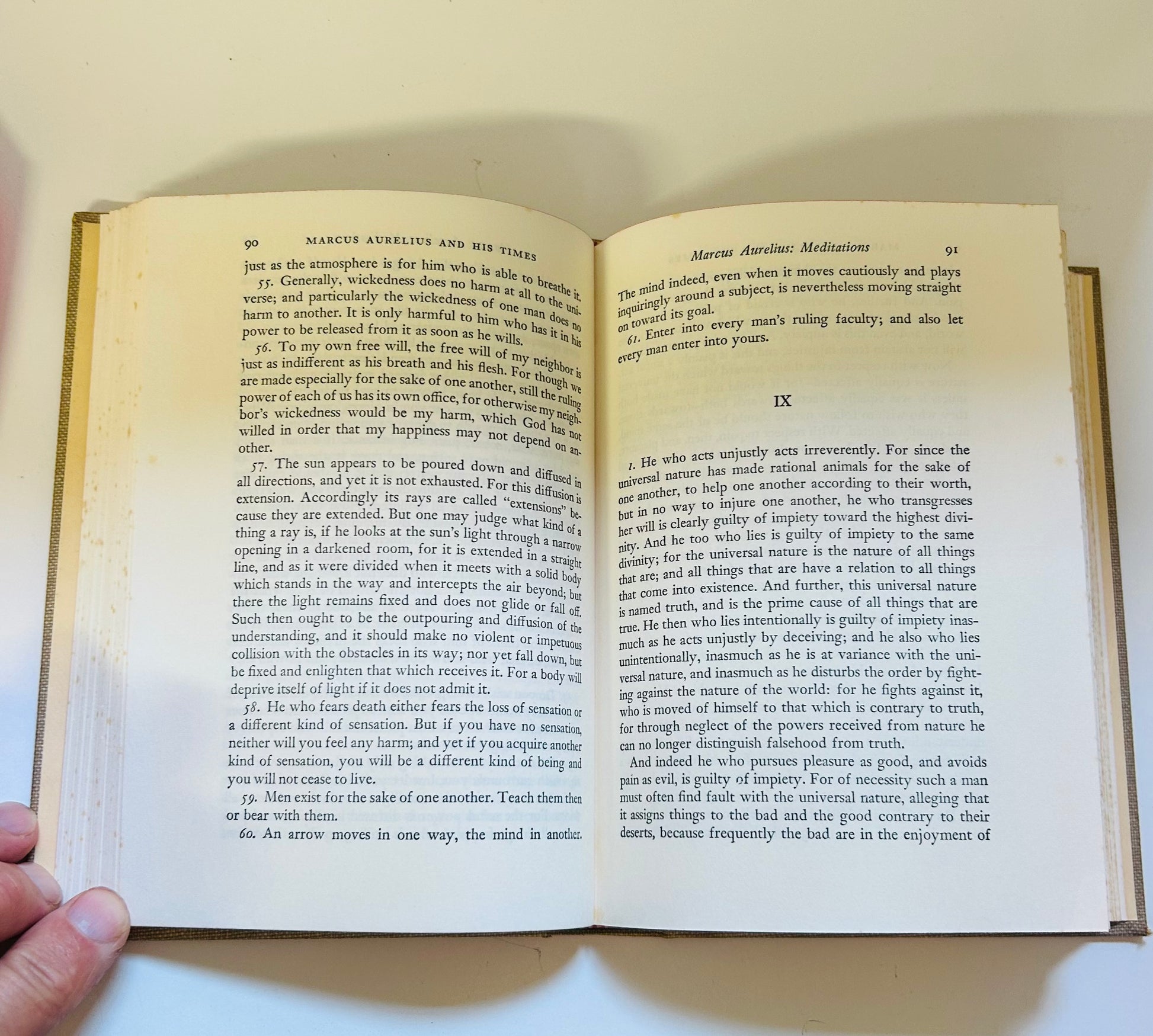 Bound in durable dark cloth with gilt spine titling, this volume offers clean pages, tight binding, and minimal wear—a well-preserved example of mid-20th century American publishing. While not a rare first edition in the traditional collector’s sense, this copy holds strong value for readers of Stoicism, collectors of the Classics Club series, or those curating a philosophical library on a budget.