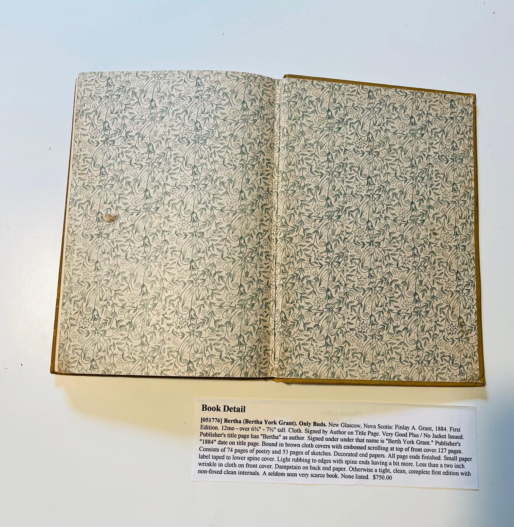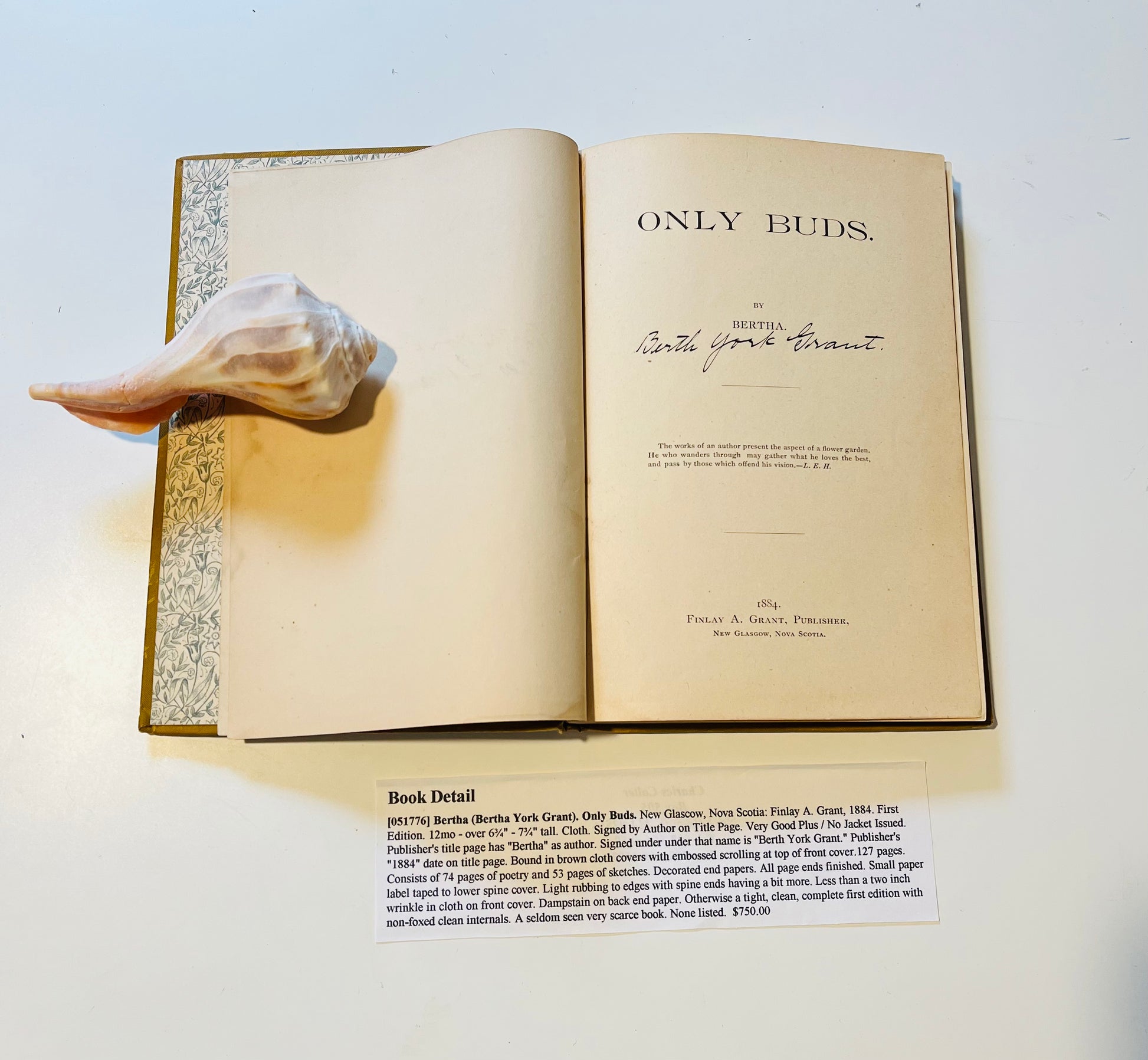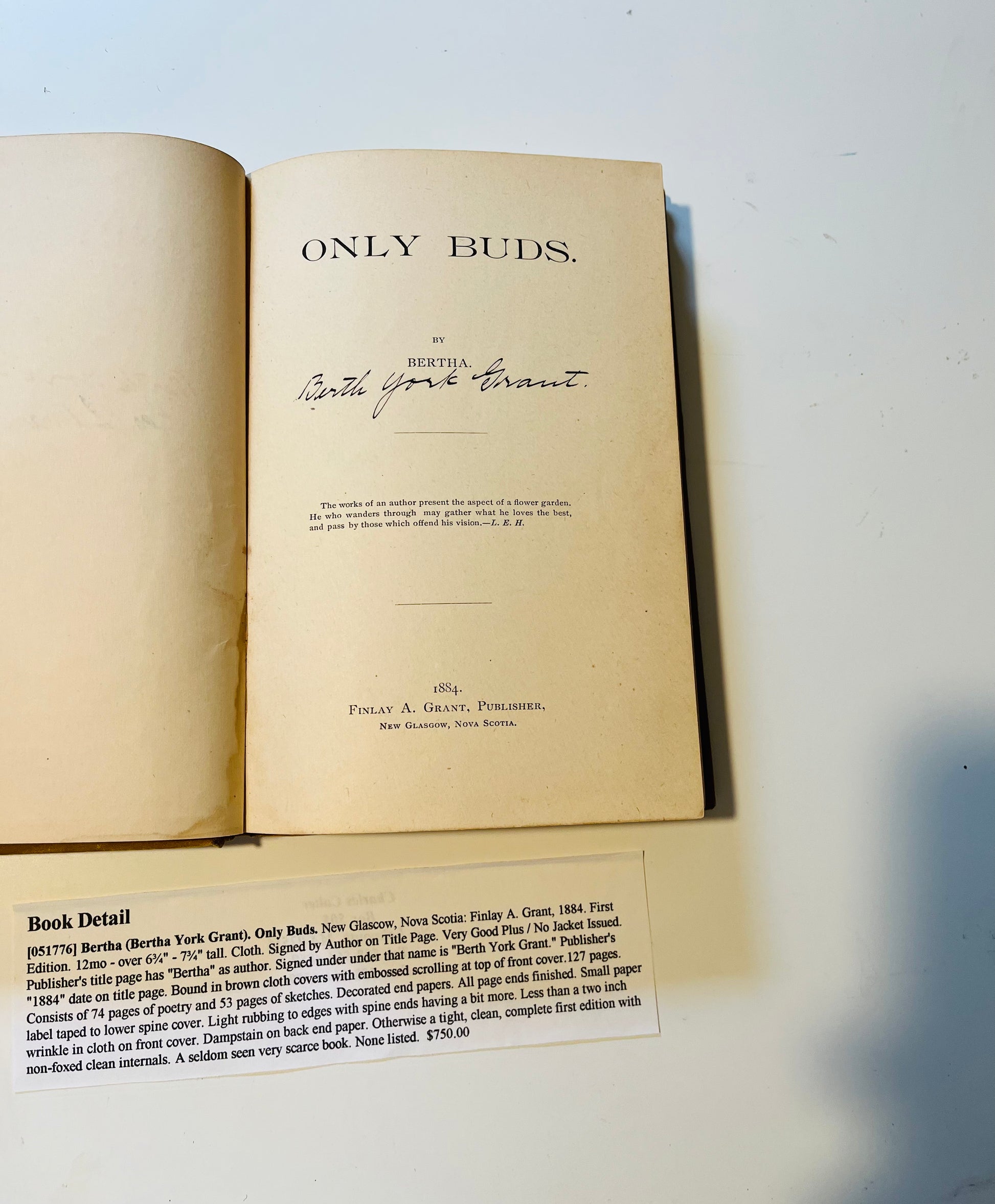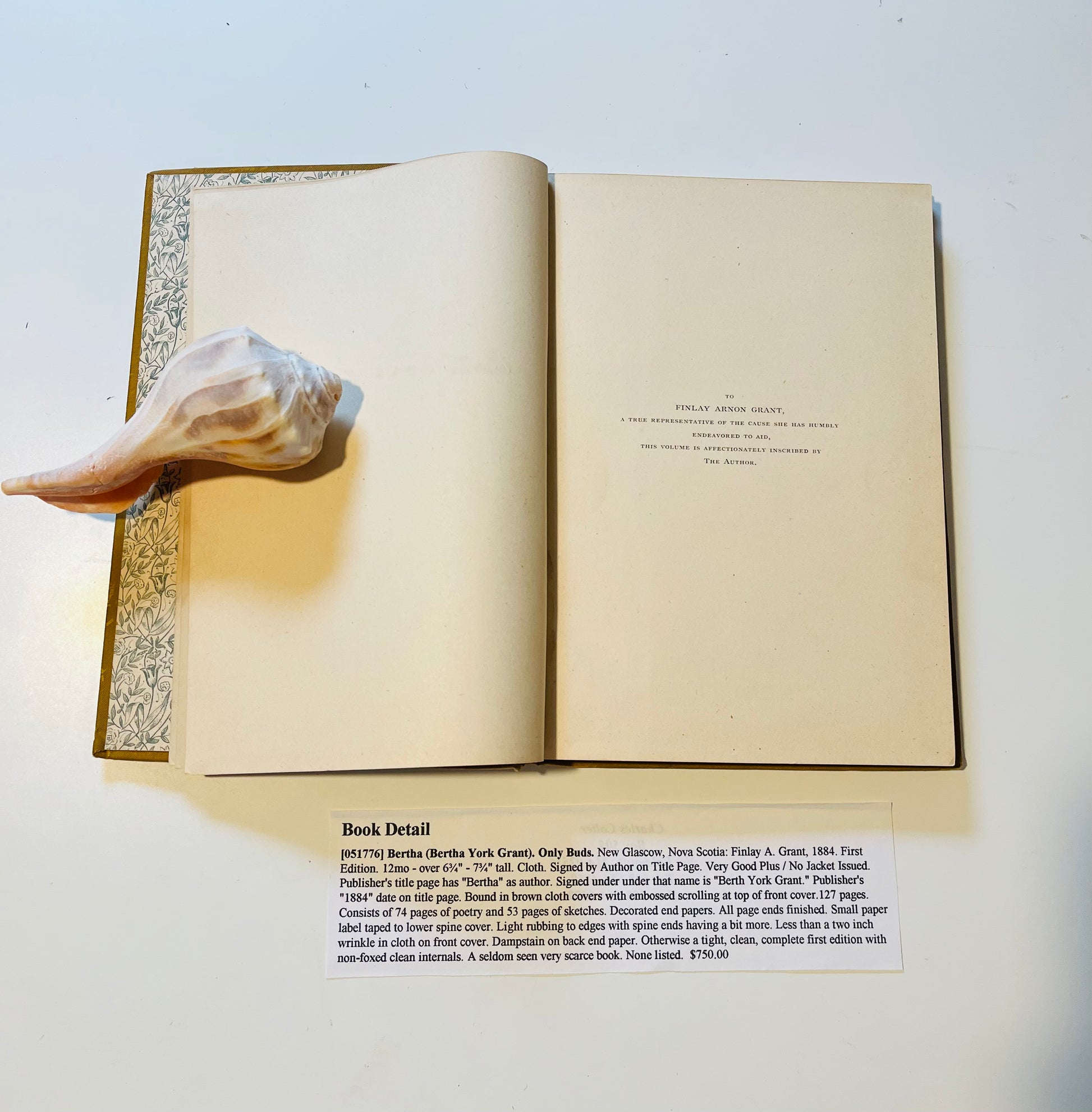 Bertha York Grant. First edition. Signed by the author on the title page. Very Good+ hardcover with no dust jacket issued. Nova Scotia: Findlay A. Grant, 1884.