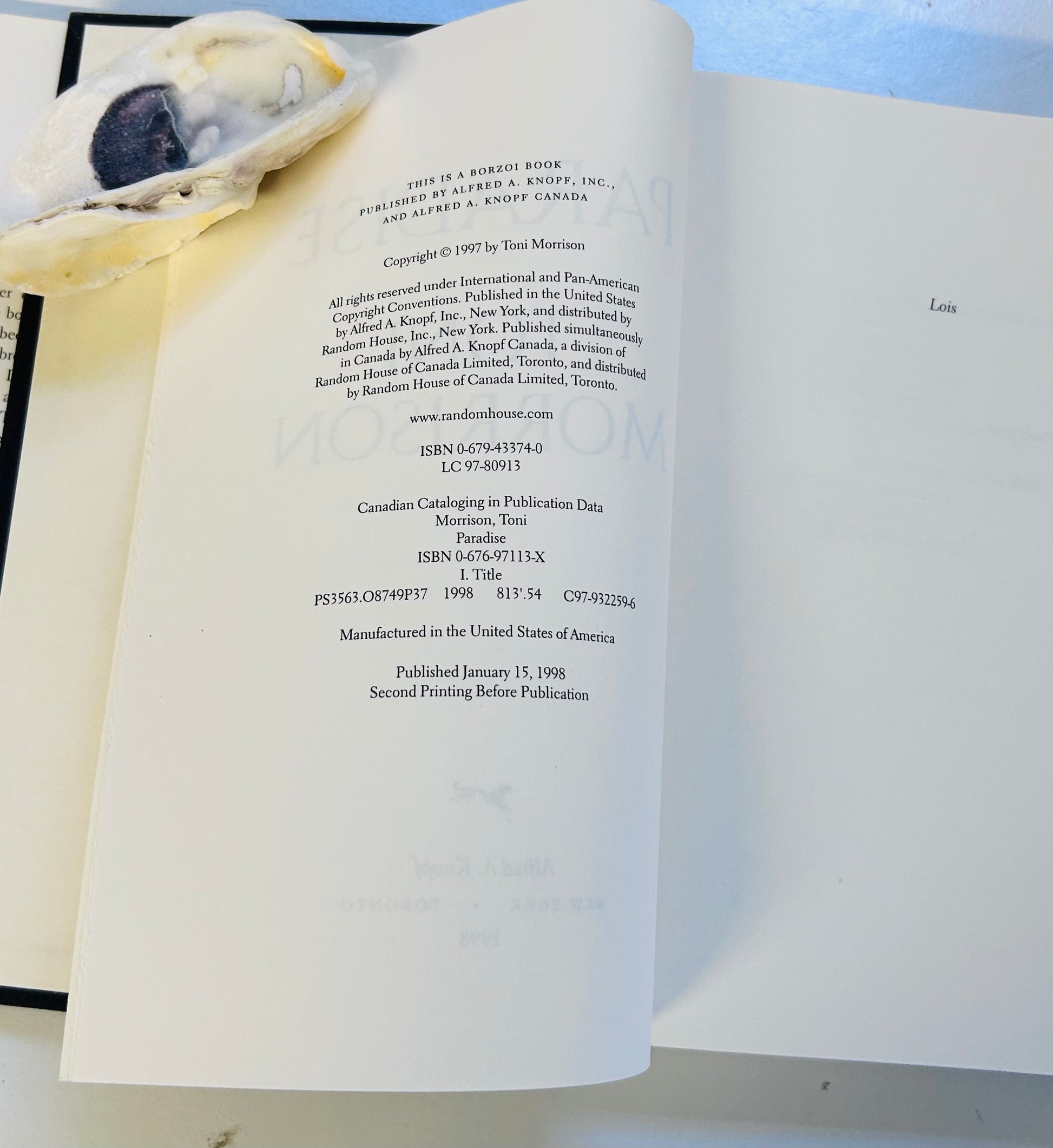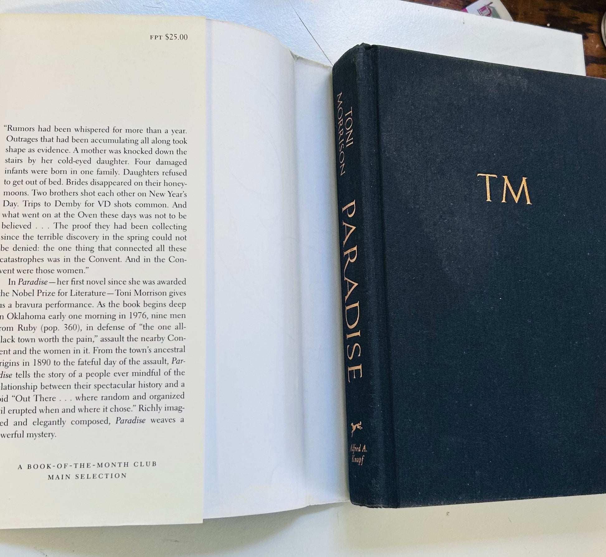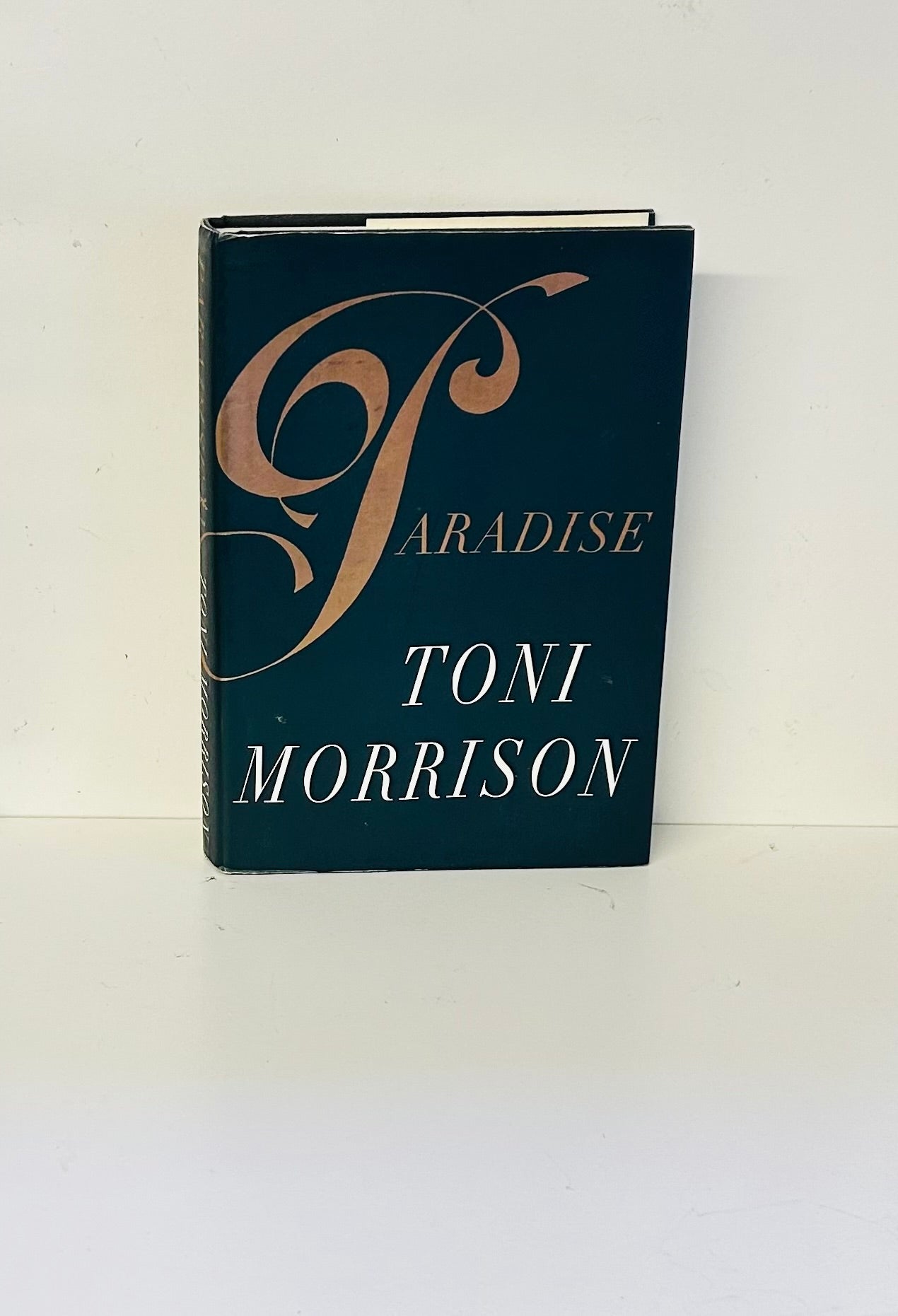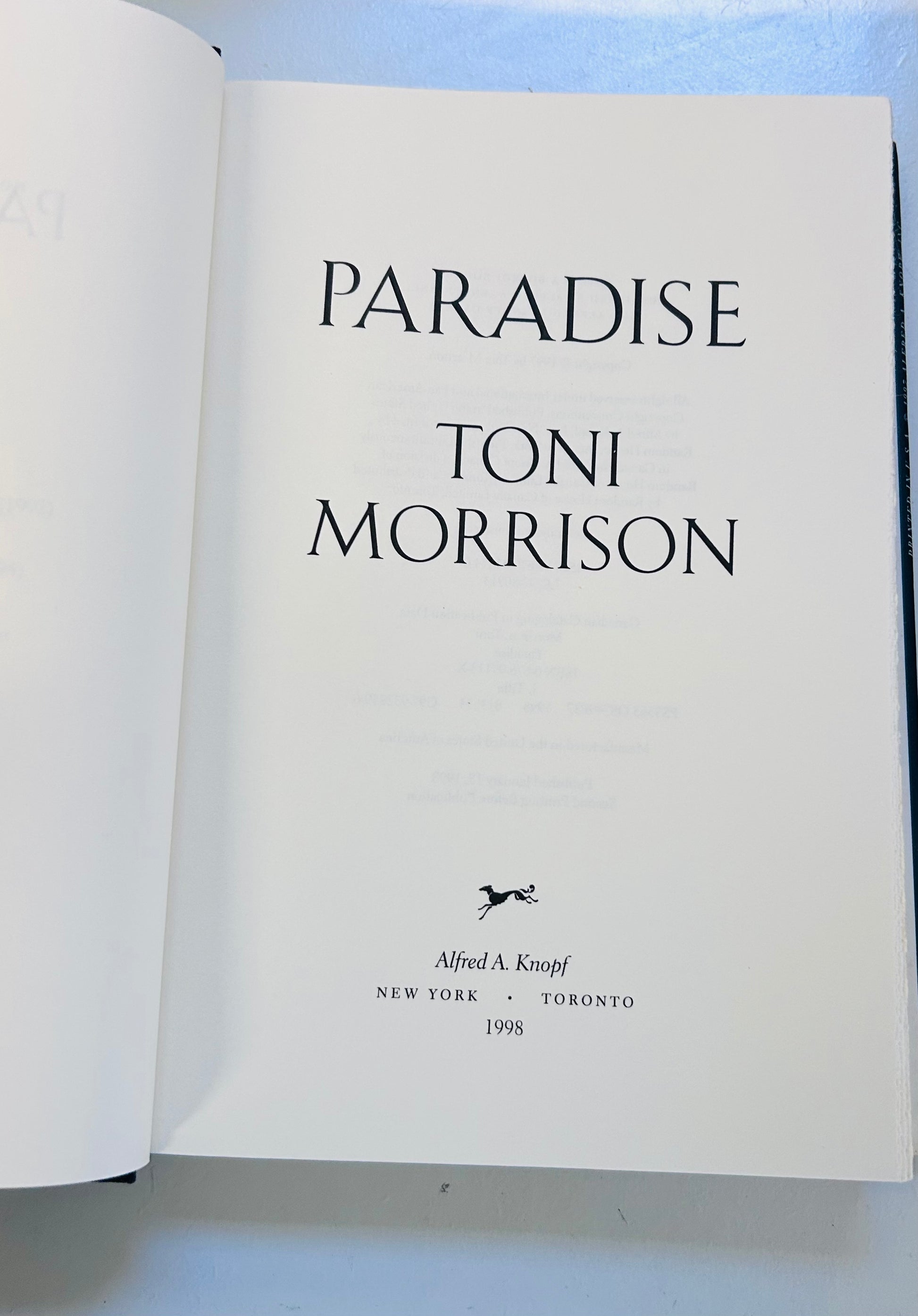 A scarce early printing of Toni Morrison’s acclaimed novel Paradise, marked as a “second printing before publication”—a unique state often reserved for promotional distribution to booksellers and reviewers before the official release date. Bound in deep burgundy boards with gilt spine lettering, the book remains clean and tight, with no writing or remainder marks. The unclipped dust jacket is bright and crisp, showing only minimal shelf wear.