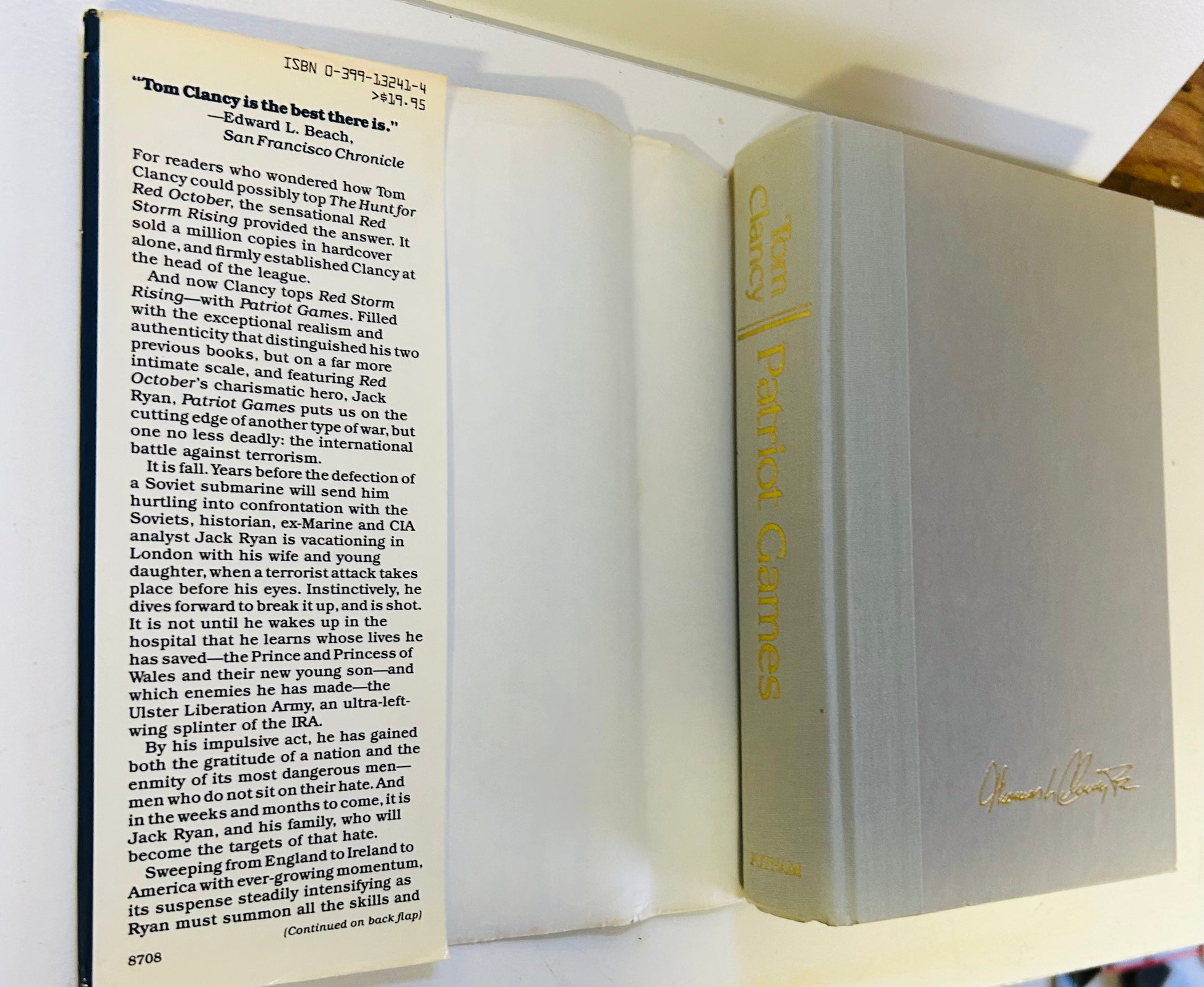 Tom Clancy. First edition, first printing. New York: G.P. Putnam's Sons, 1987. The unclipped dust jacket is in Very Good condition. There is chipping on top of spine and a small one inch tear on upper, right corner. Jacket was designed by the great Lawrence Ratzkin. The grey cloth hardcover is in Very Good+ condition. Former owner signature is written, in black marker, on the top/bottom of pages. Otherwise, no other writing or markings in this first state edition, 540 pp.