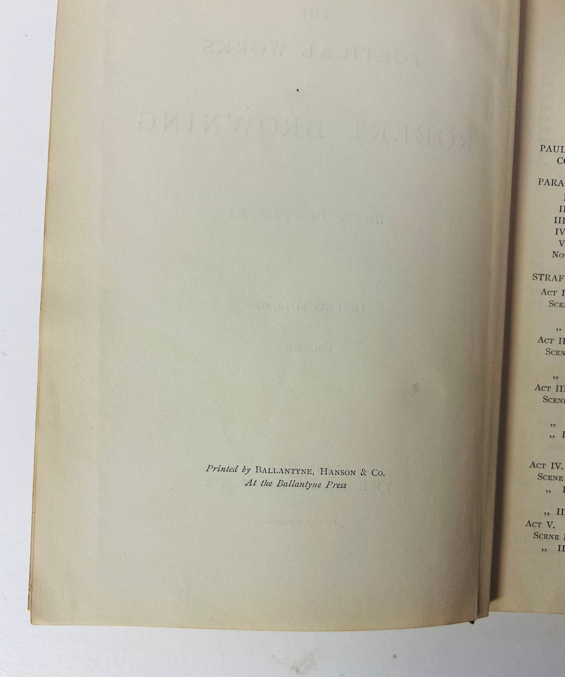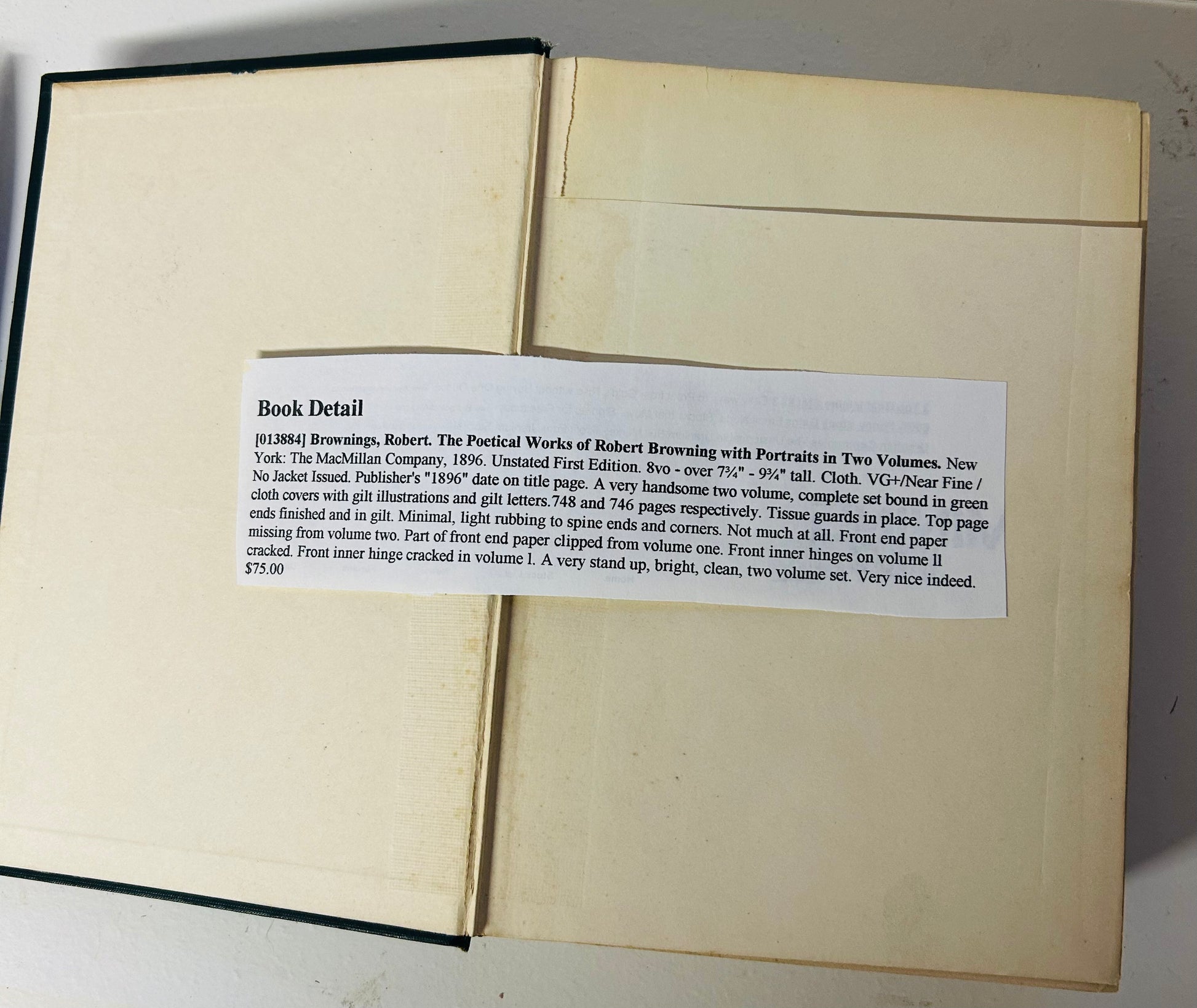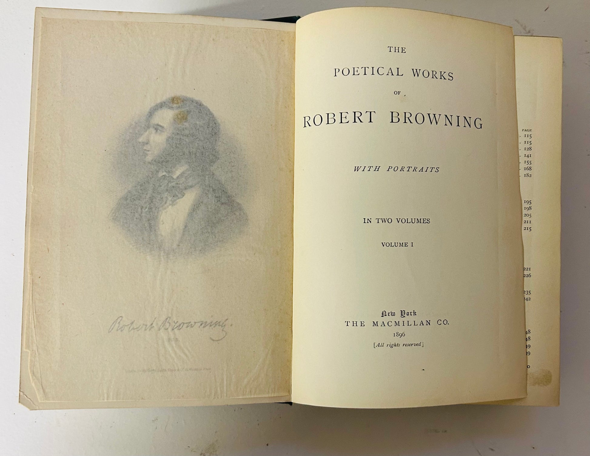Robert Browning. Unstated first editions. New York: The MacMillan Company, 1896. Two volumes. No dust jacket issued. Both hardcovers are in Very Good+ condition. The flyleaf page in one volume is partially missing and inner hinge is cracked in volume one. No writing or markings in the books, 746 and 748 pp. respectively.