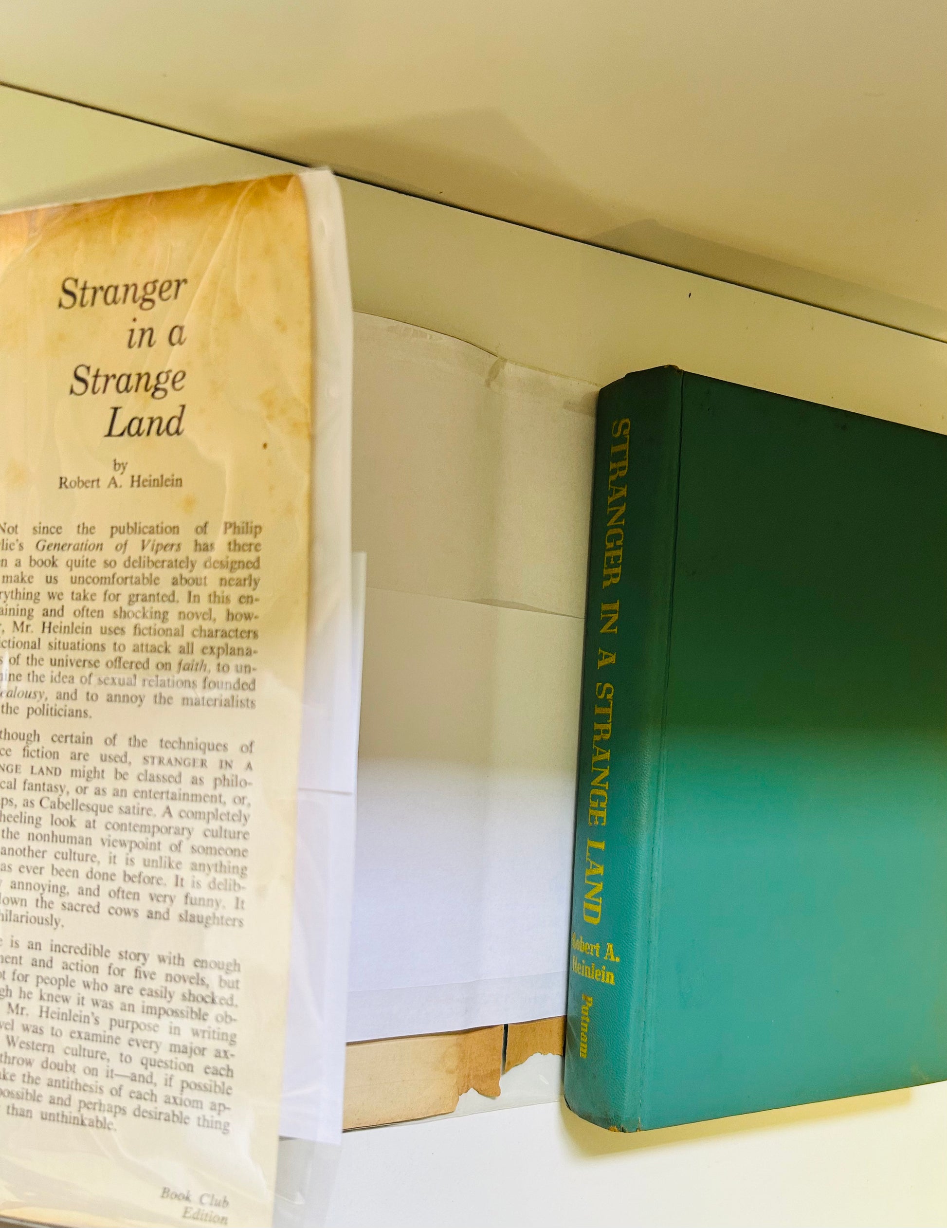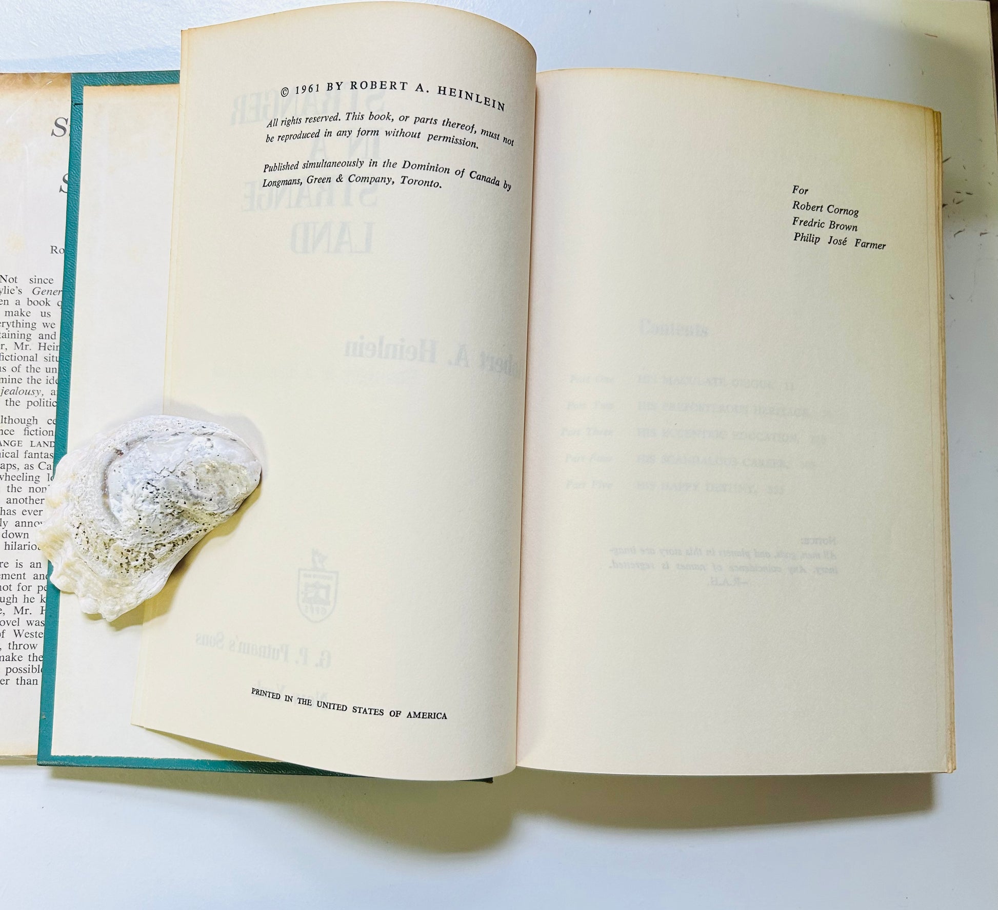 Robert A. Heinlein. First book club edition. New York: G.P. Putnam's Sons, 1961. The unclipped jacket is in Very Good condition in a mylar protective wrapper. Jacket design by Ben Feder. Jacket has small piece missing from top/bottom of spine. Foxing on rear jacket around photo of the author. Hardcover in Very Good+ condition. No writing or markings in the book, 414 pp. A book club edition. Has gutter code 37 L on page 411. The DJ has the # 1881 on the bottom rear leaf.