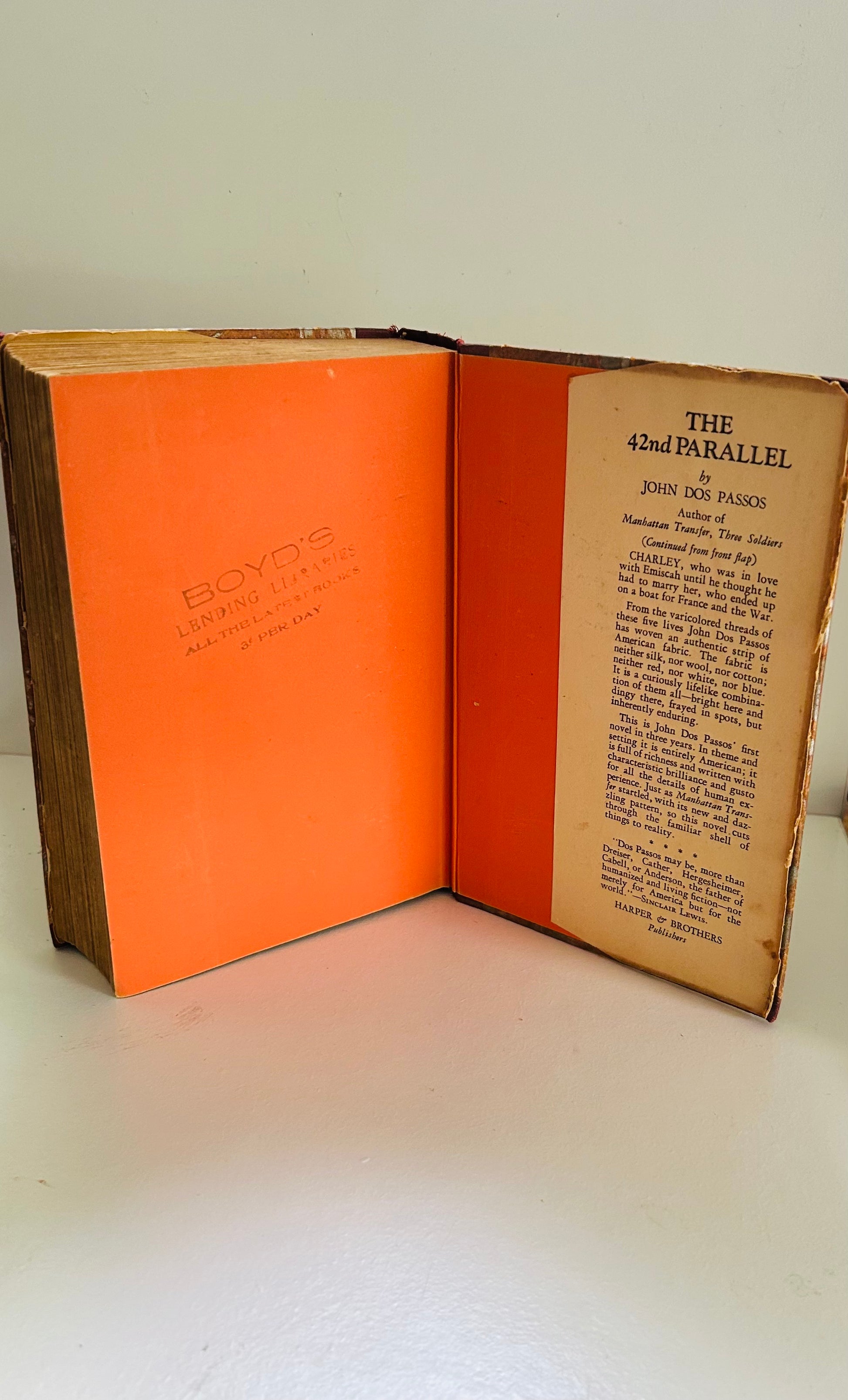 John Dos Passos. Stated first edition, first printing. New York: Harper & Brothers Publishers, 1930. Missing dust jacket, though it does have both front/back flaps of original jacket pasted down on the inside covers. There are also some markings on the inside front/back flyleaf pages. Otherwise, no additional markings or writing found in the book, 426 pp.