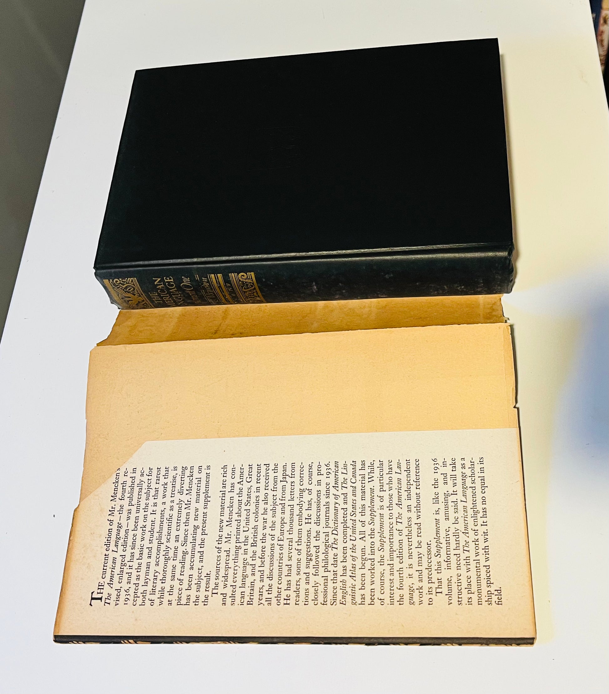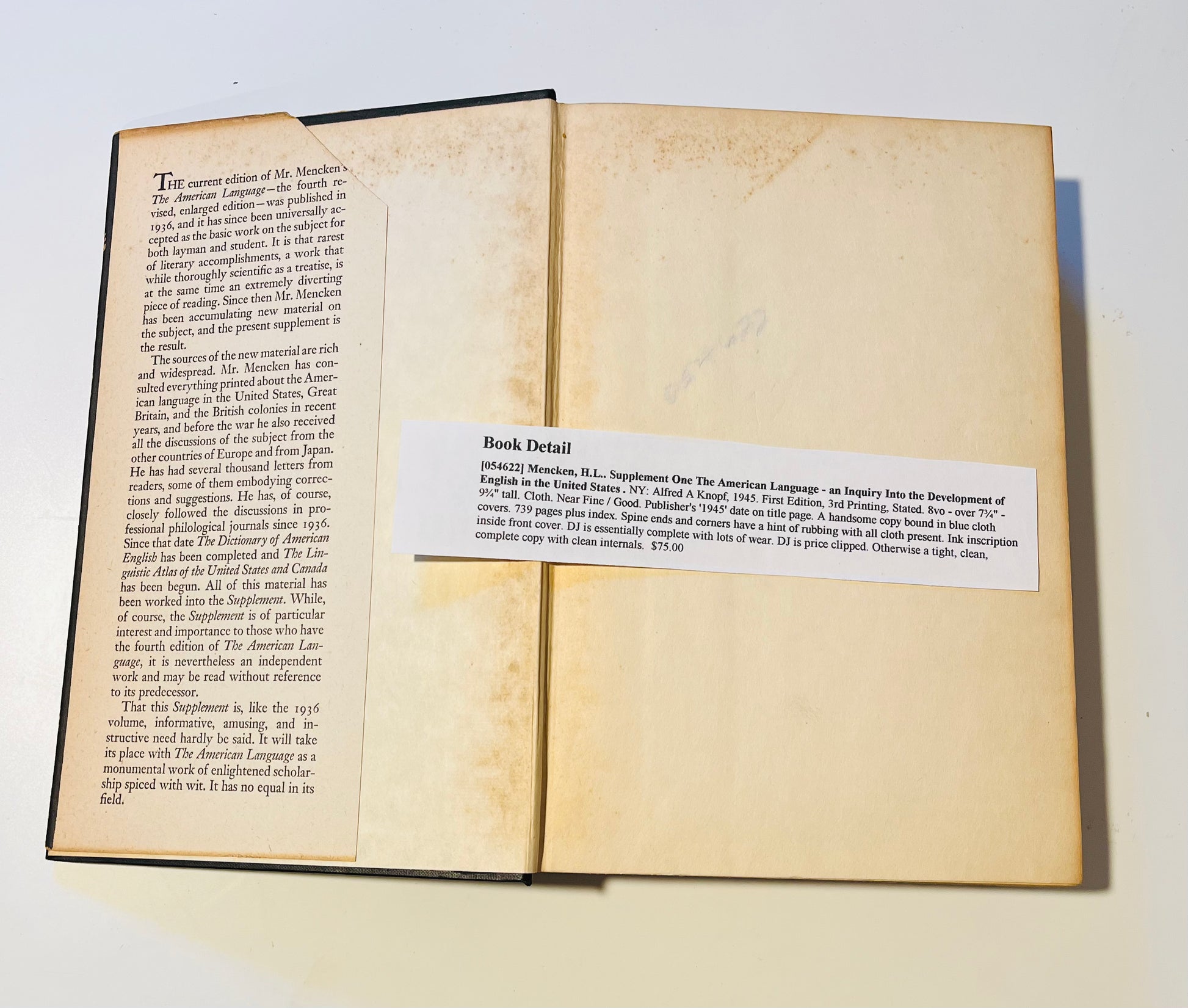 H.L. Mencken. Supplement One. First edition, third printing. Dust Jacket: Very Good. A price-clipped jacket. The jacket has a lot of wear and foxing. Hardcover: Very Good+ New York: Alfred A. Knopf, 1945. No writing or markings in the book, 739 pp.