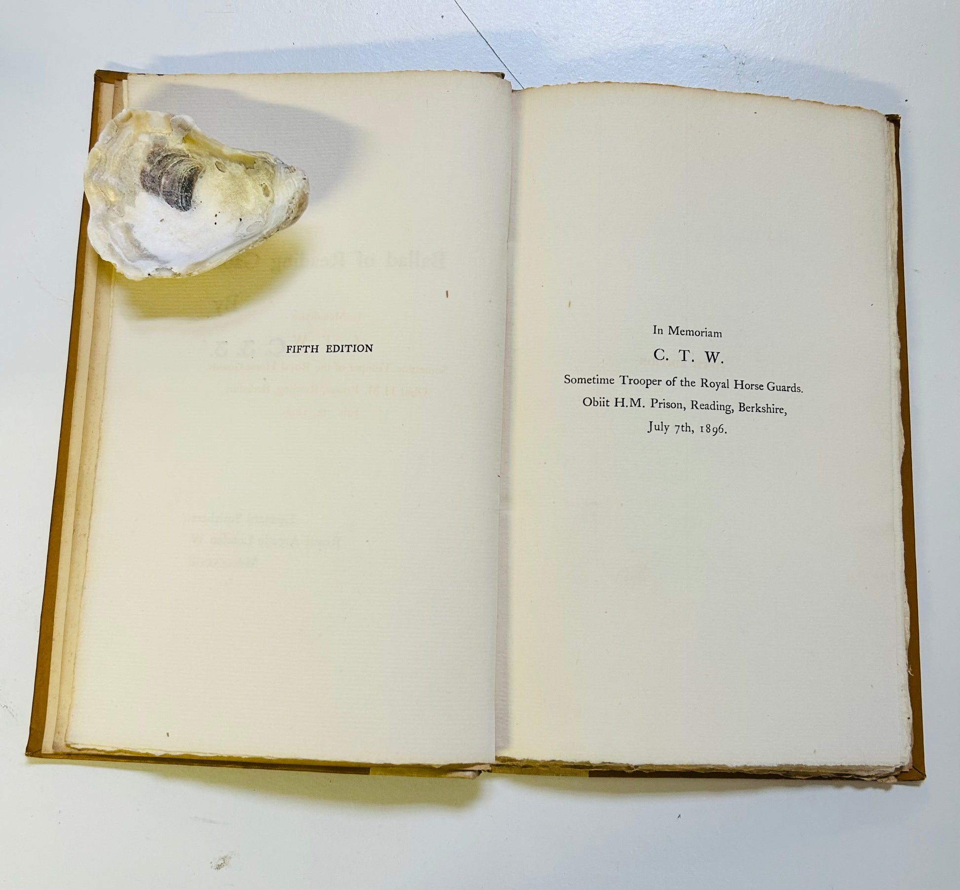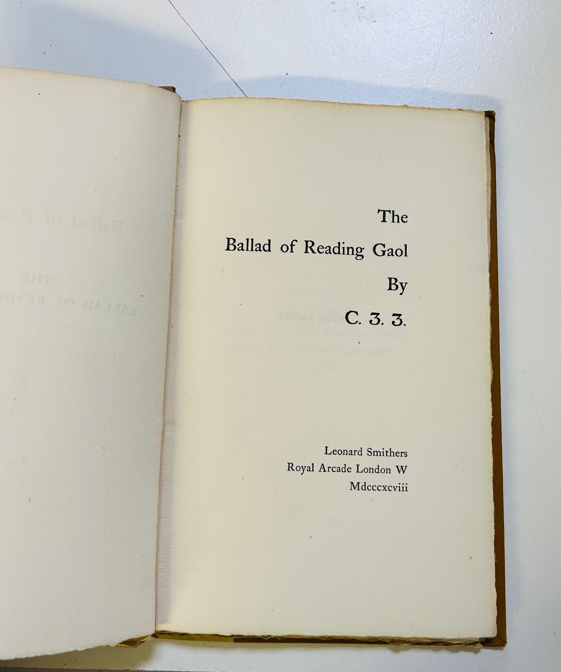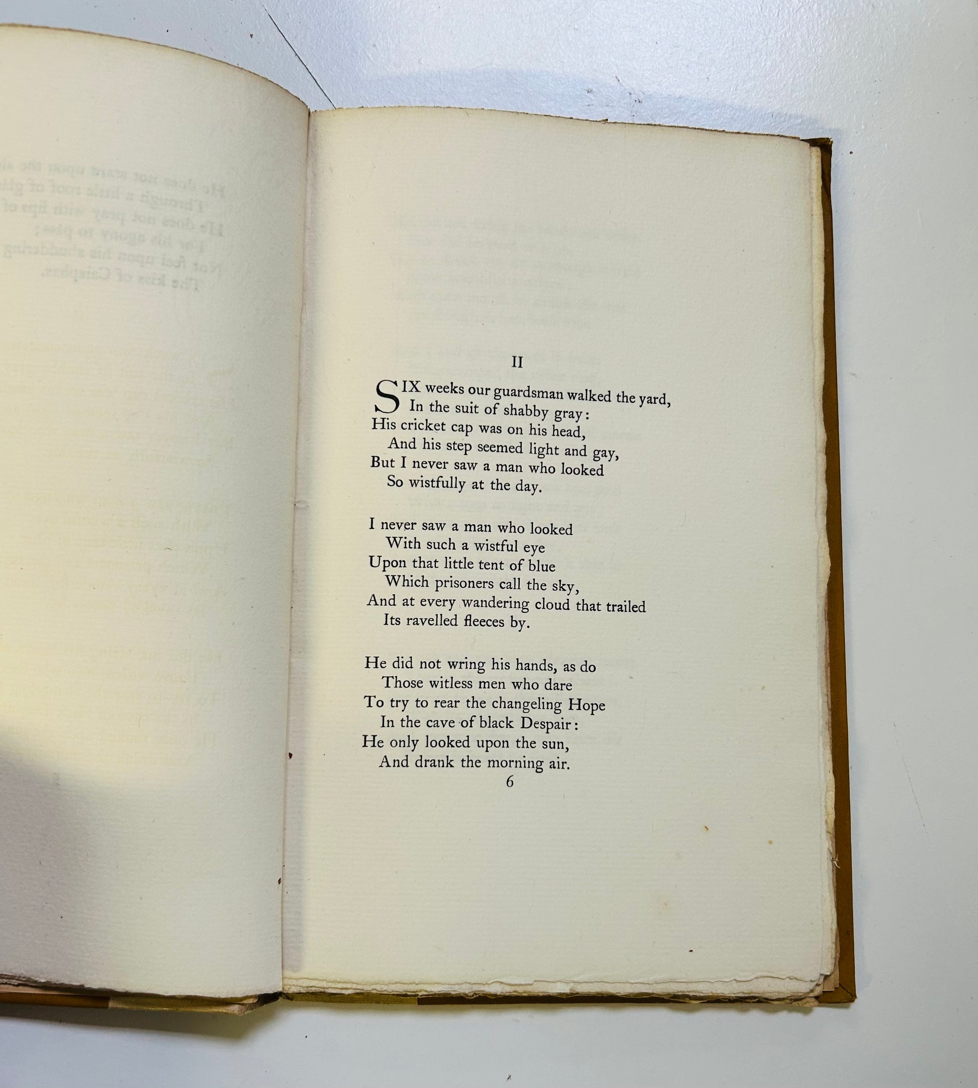 Early printing of Wilde’s searing prison poem, issued anonymously under the pseudonym “C.3.3.” following his conviction and imprisonment at Reading Gaol. This is the Fifth Edition, printed the same year as the first by Leonard Smithers. Bound in original yellow cloth. Ends at page 31, as issued, with no ads or colophon.