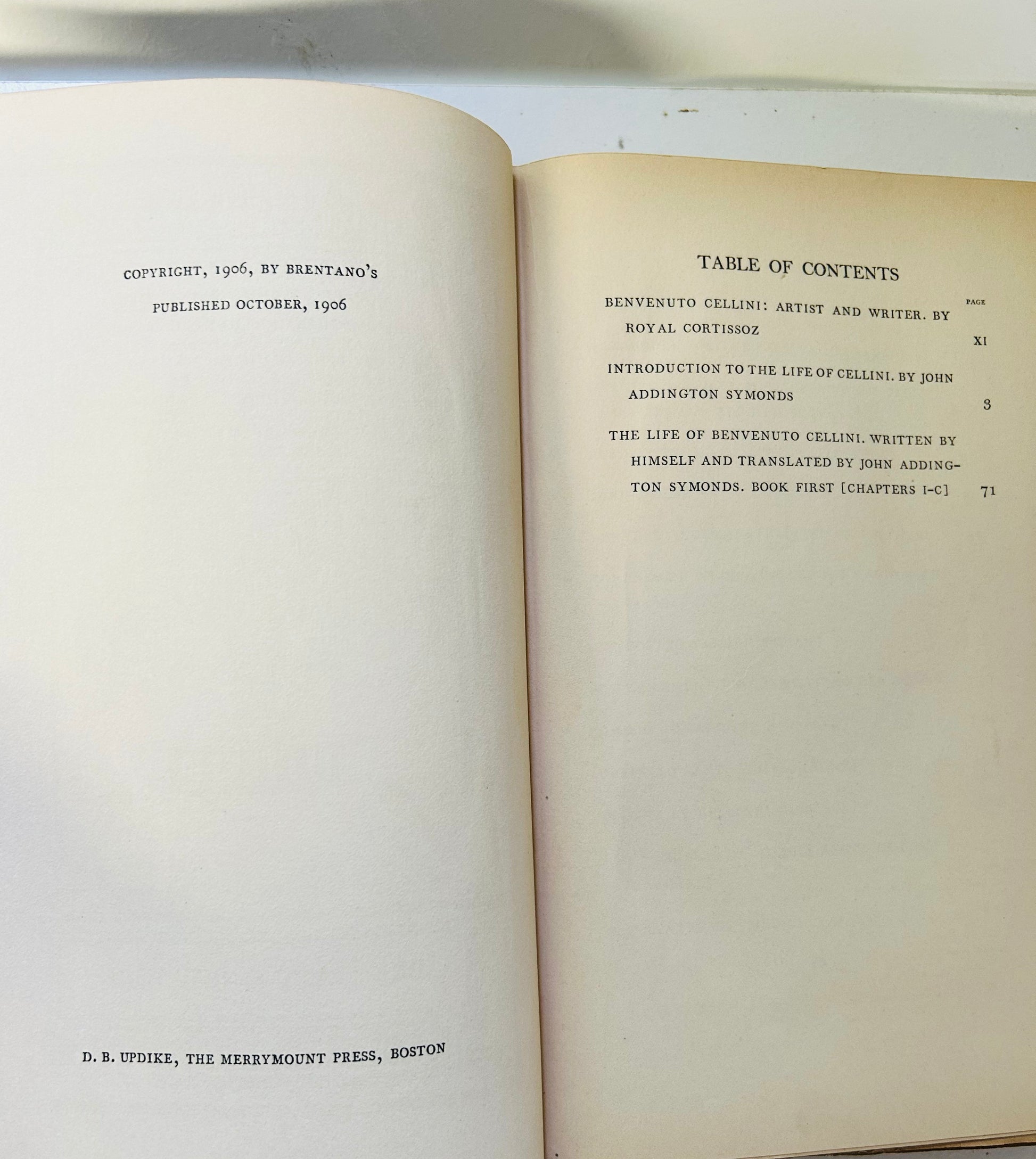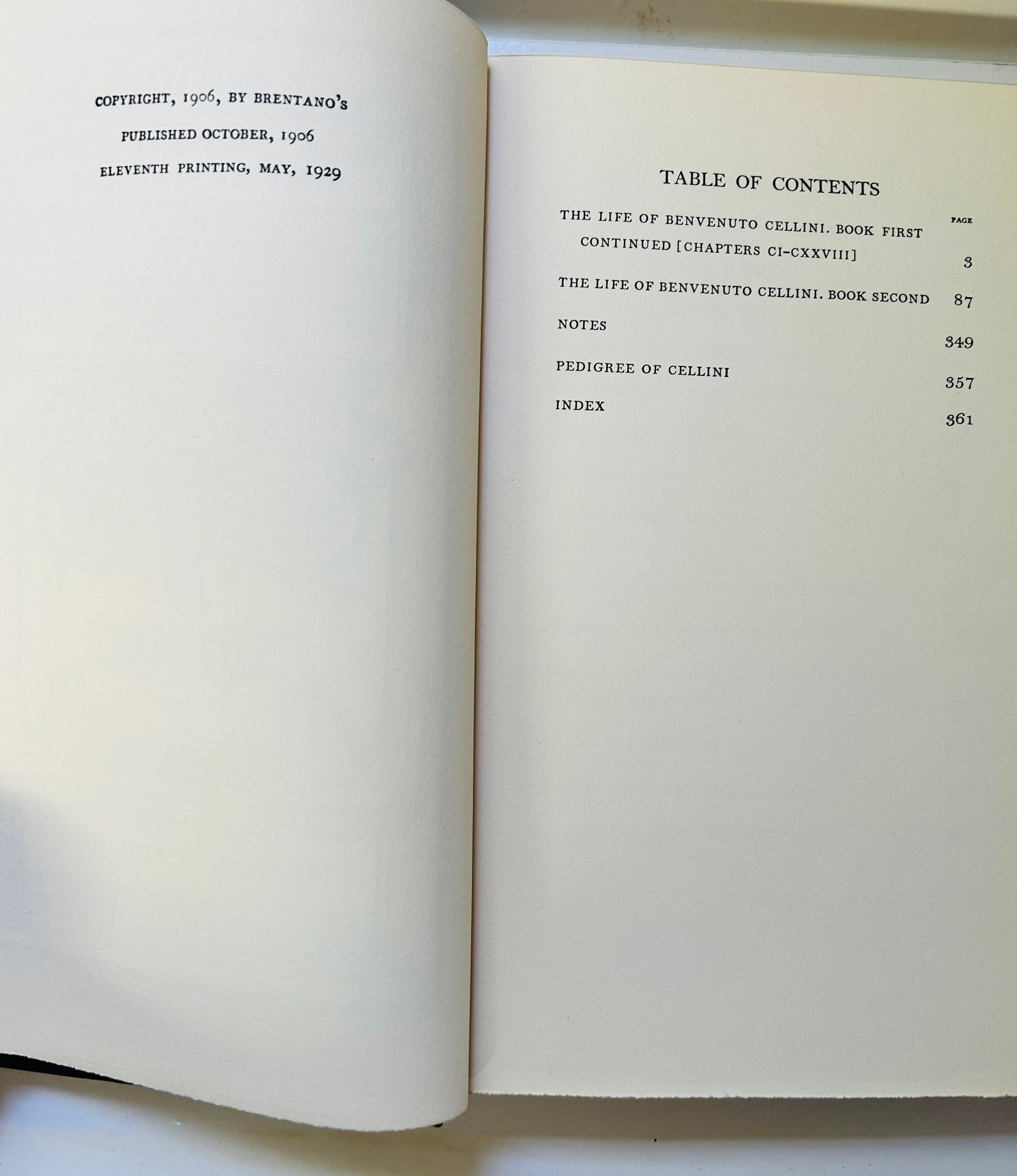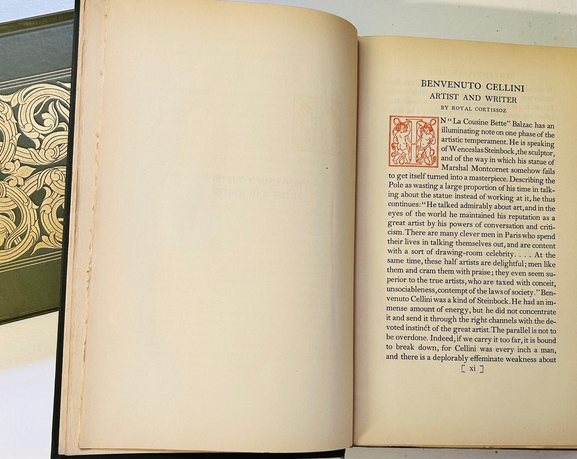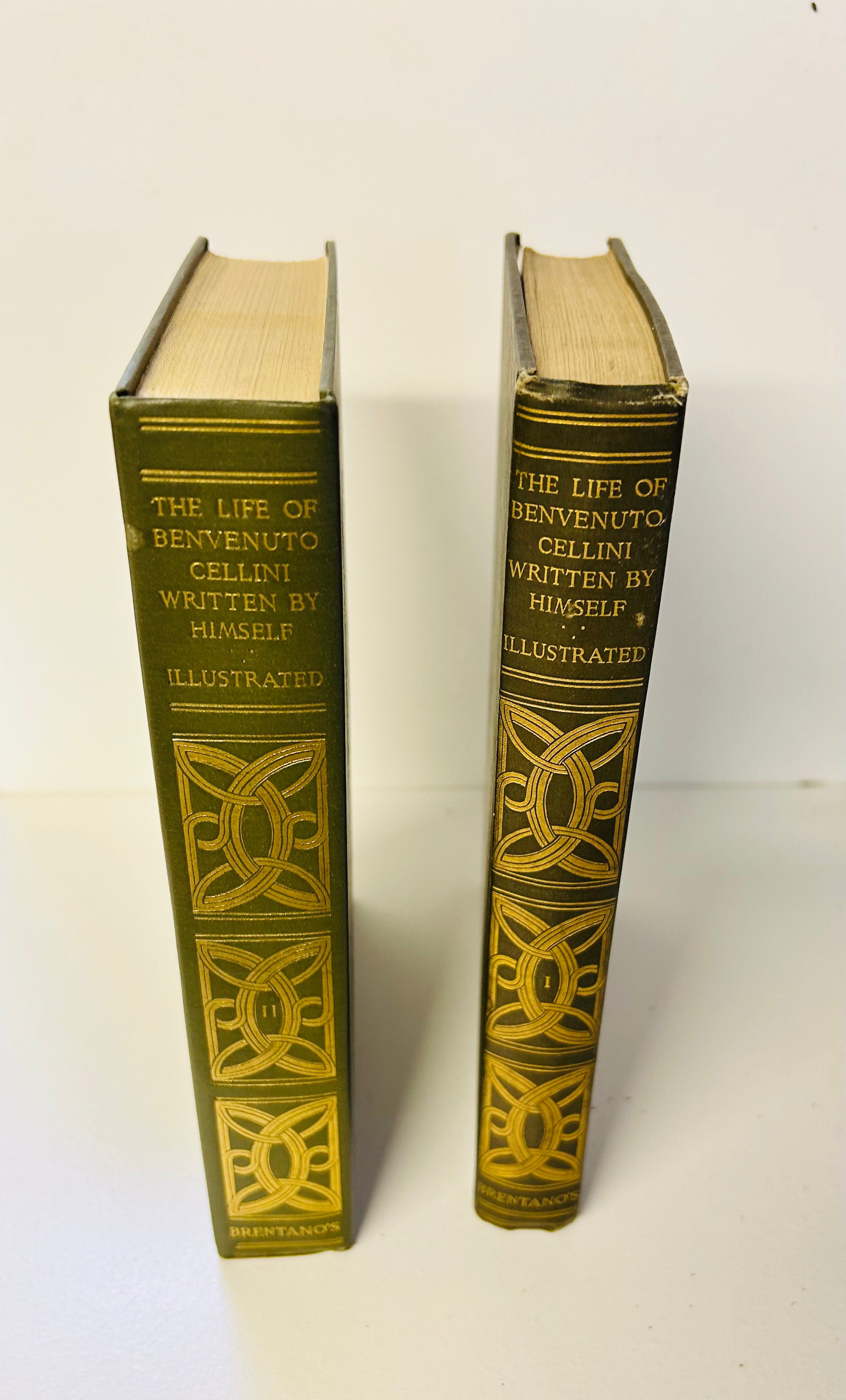 Benvenuto Cellini. John Addington Symonds, Edited and translated by. First edition, first printing (and later). New York: Brentano's, 1906 (and 1929). Green cloth with gold gilt decorative cover and lettering on spine; two volumes; vol. 1 - 360 pp.; vol. 2 - 386 pp.