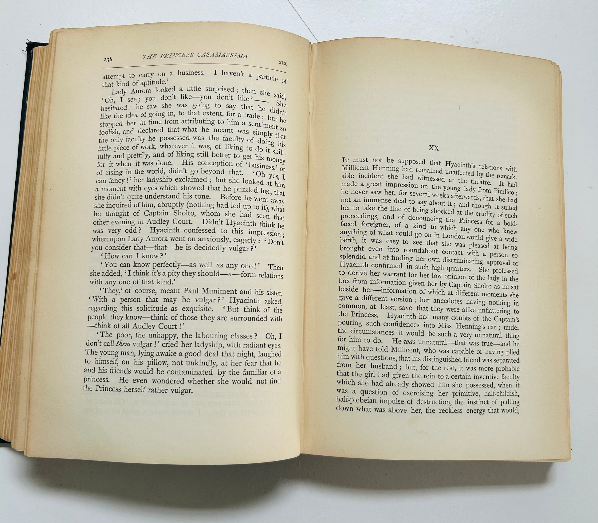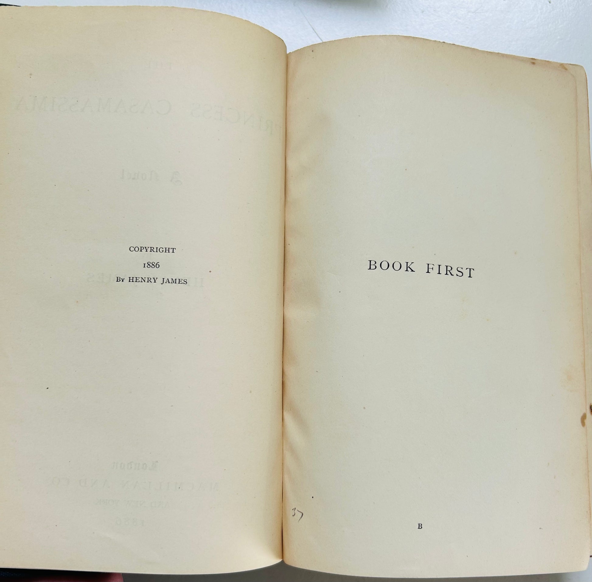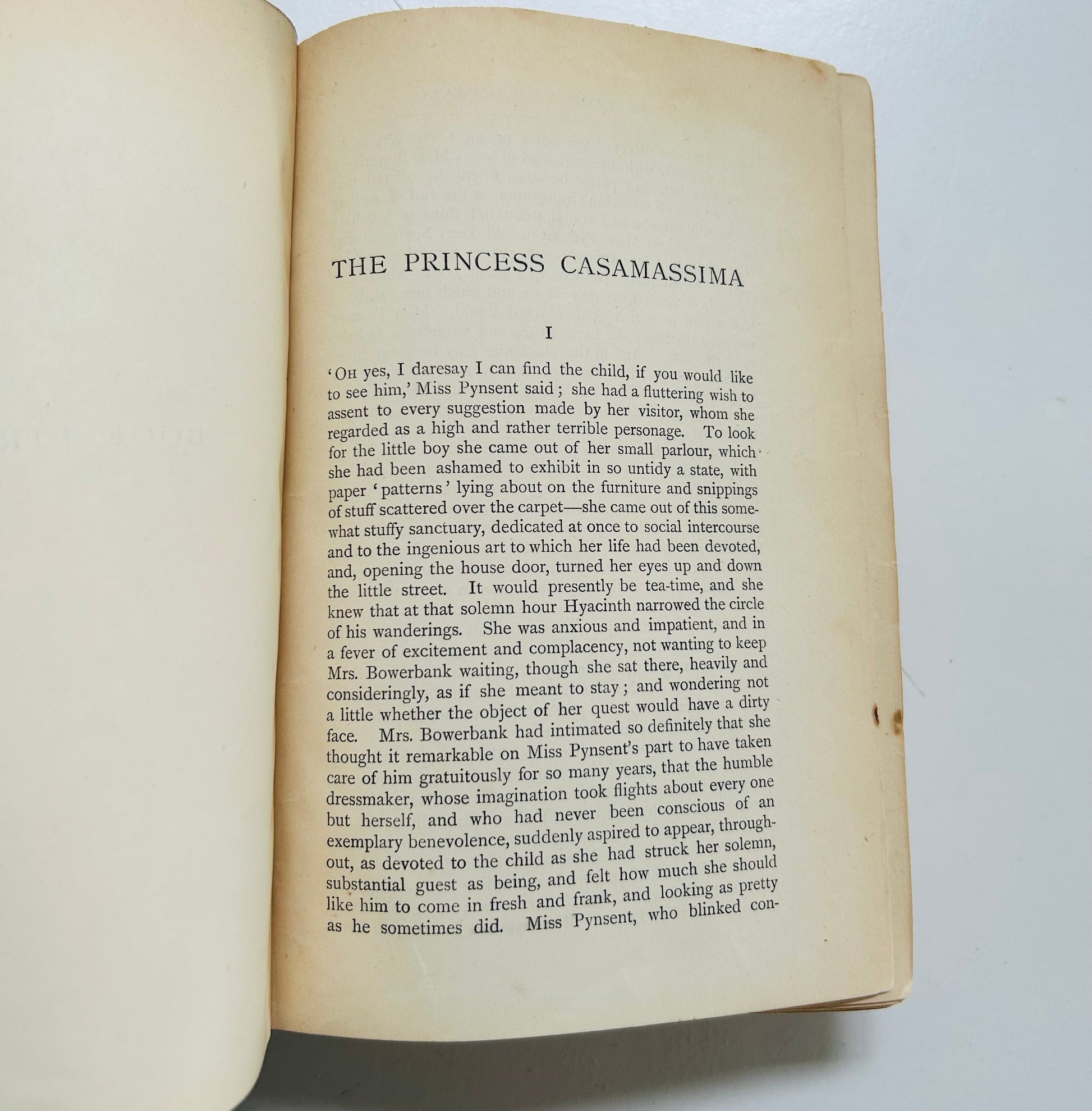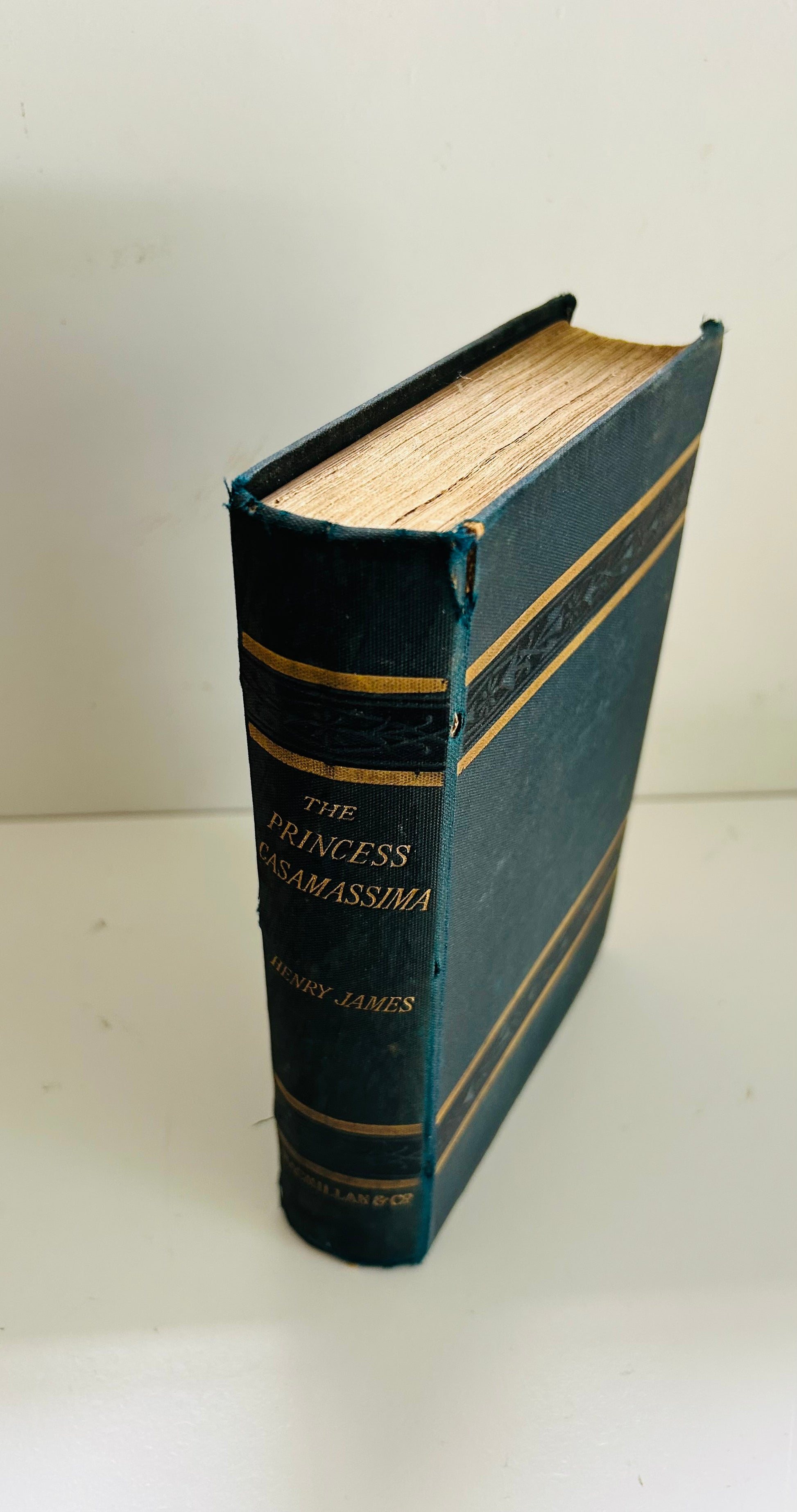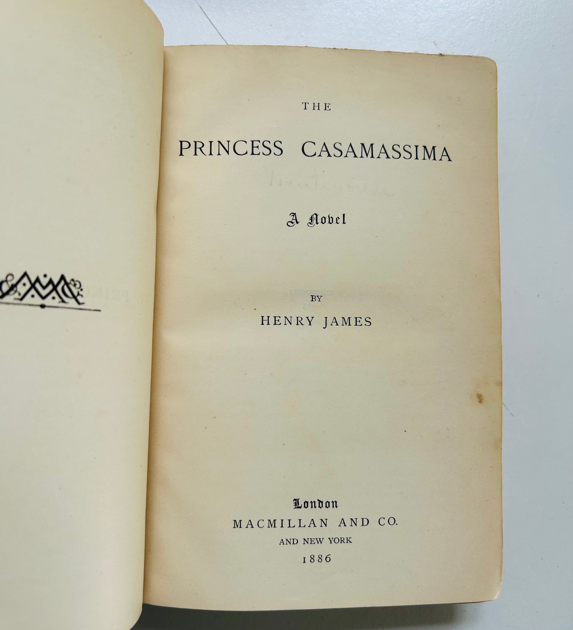 Offered here is a scarce first edition, first printing of The Princess Casamassima by Henry James, published in 1886 by Macmillan and Co., London. This is the true UK first in single-volume format, bound in original dark green cloth with gilt titles and elegant black ruling. A key work in James’s literary shift toward political themes, this novel explores the psychology of radicalism and class identity through the life of a bookbinder drawn into anarchist intrigue.