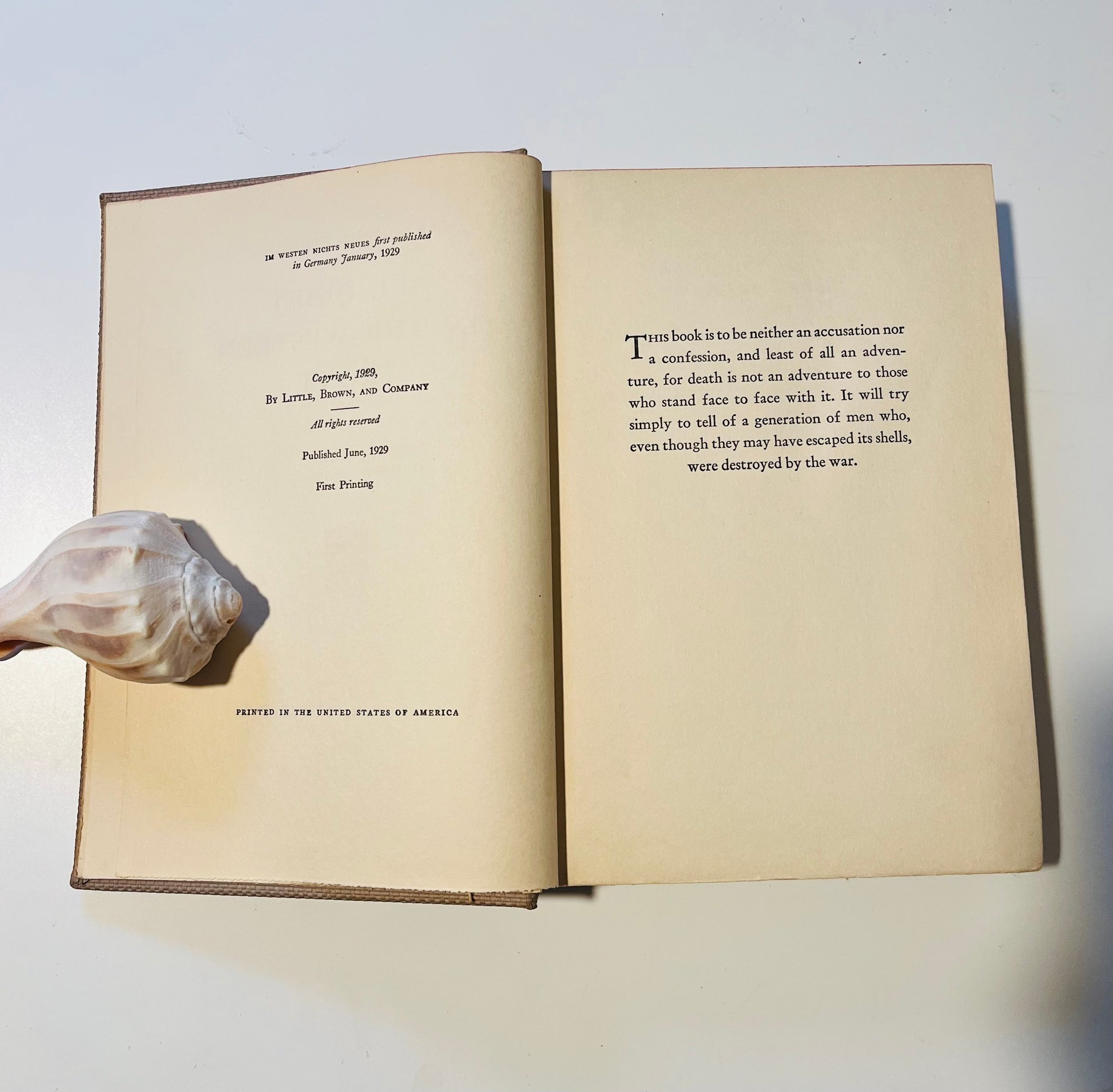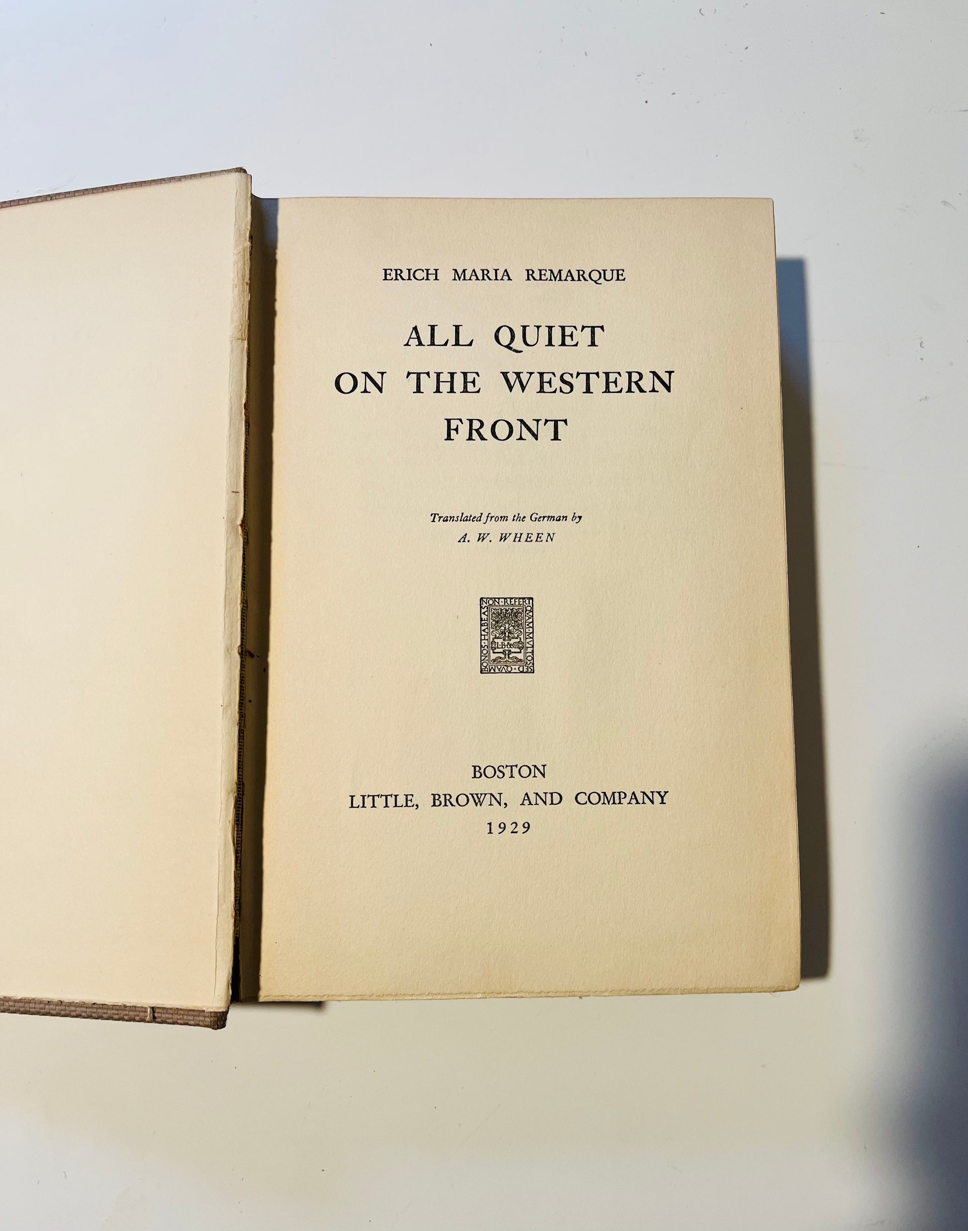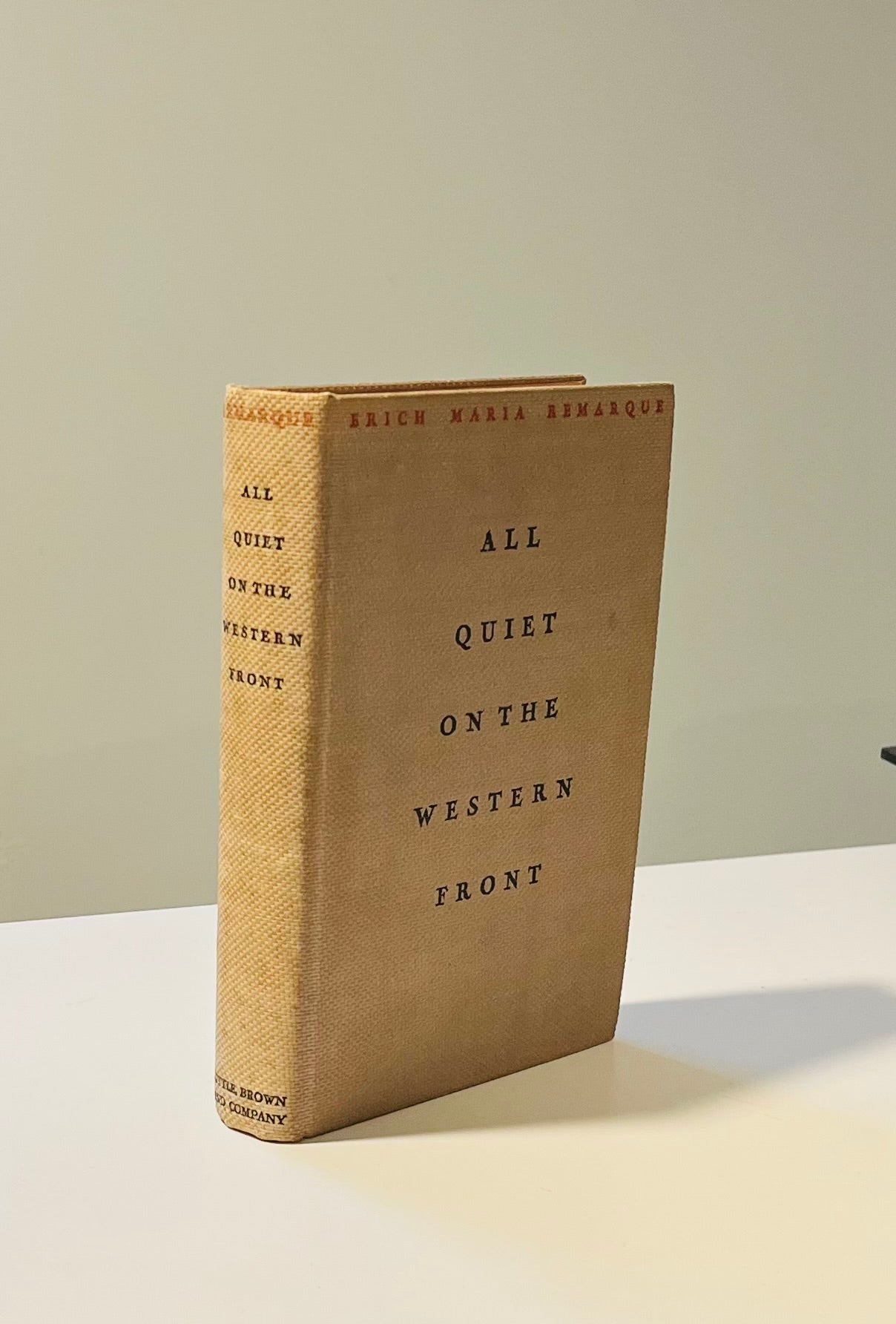 Erich Maria Remarque. First edition, first printing (stated). Dust Jacket: None. Hardcover: Very Good+ Boston: Little, Brown and Company, 1929. The title page is separated but the book is stable and no pages are loose. Oatmeal cloth with black/red lettering on cover and spine. No writing or markings in this well-preserved edition, 291 pp., translated from German by A.W. Wheen.