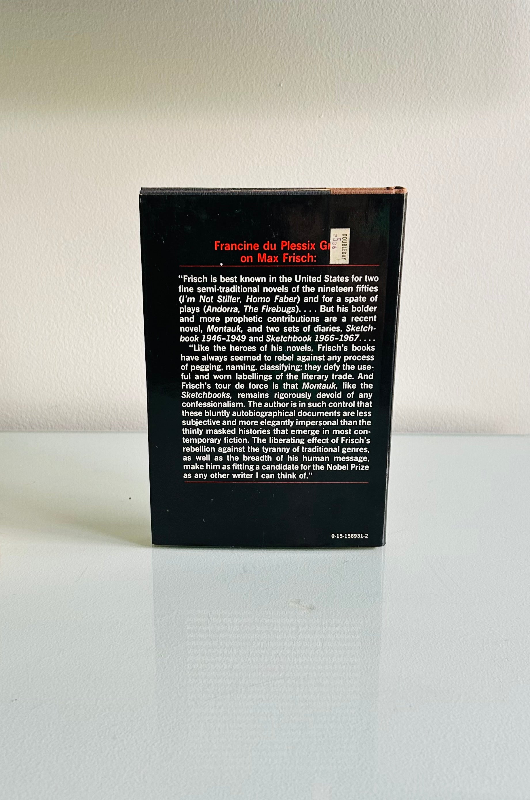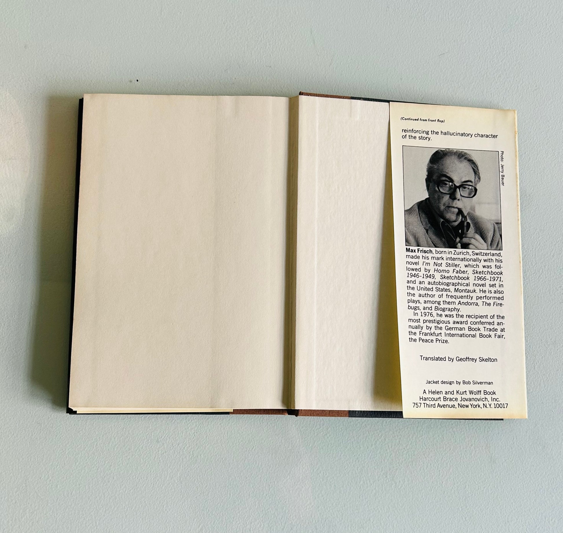 Max Frisch. Stated first edition. New York: Harcourt, Brace Jobanovich, 1980. Both unclipped dust jacket and hardcover are in Very Good+ condition. Jacket design by Bob Silverman. No writing or markings found in the book, 113 pp. There is a small Doubleday sticker on rear jacket.