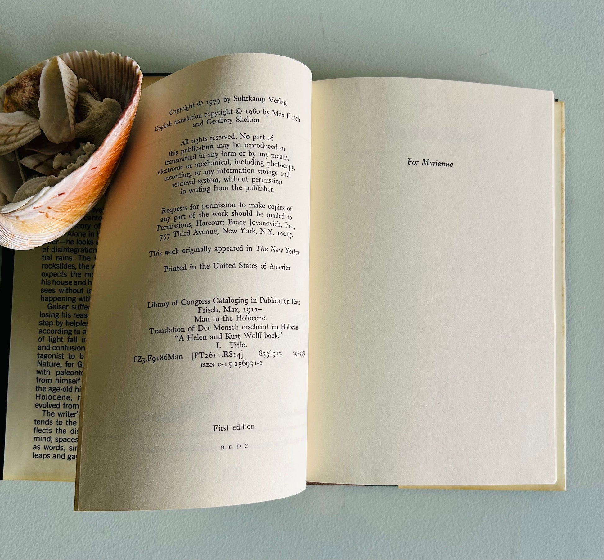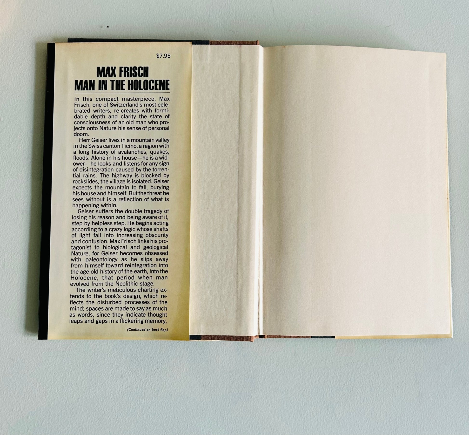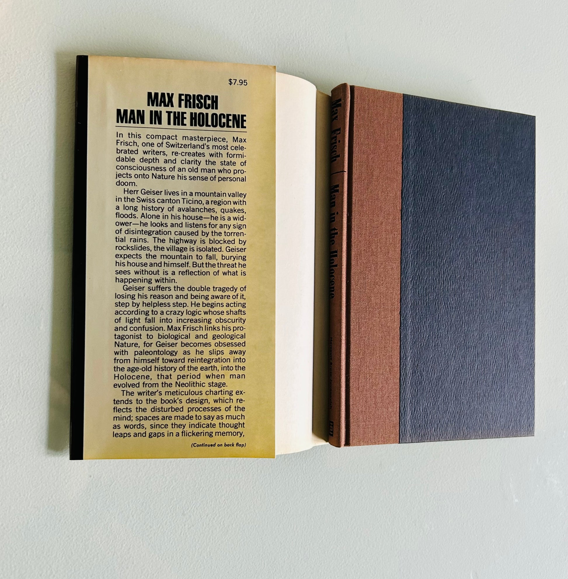 A compelling stated first edition of Man in the Holocene by Max Frisch, one of the most important European writers of the 20th century. Originally published in German in 1979, this novel is widely regarded as Frisch’s late masterpiece—an existential meditation on memory, isolation, and humanity’s fragility against the vast indifference of nature.