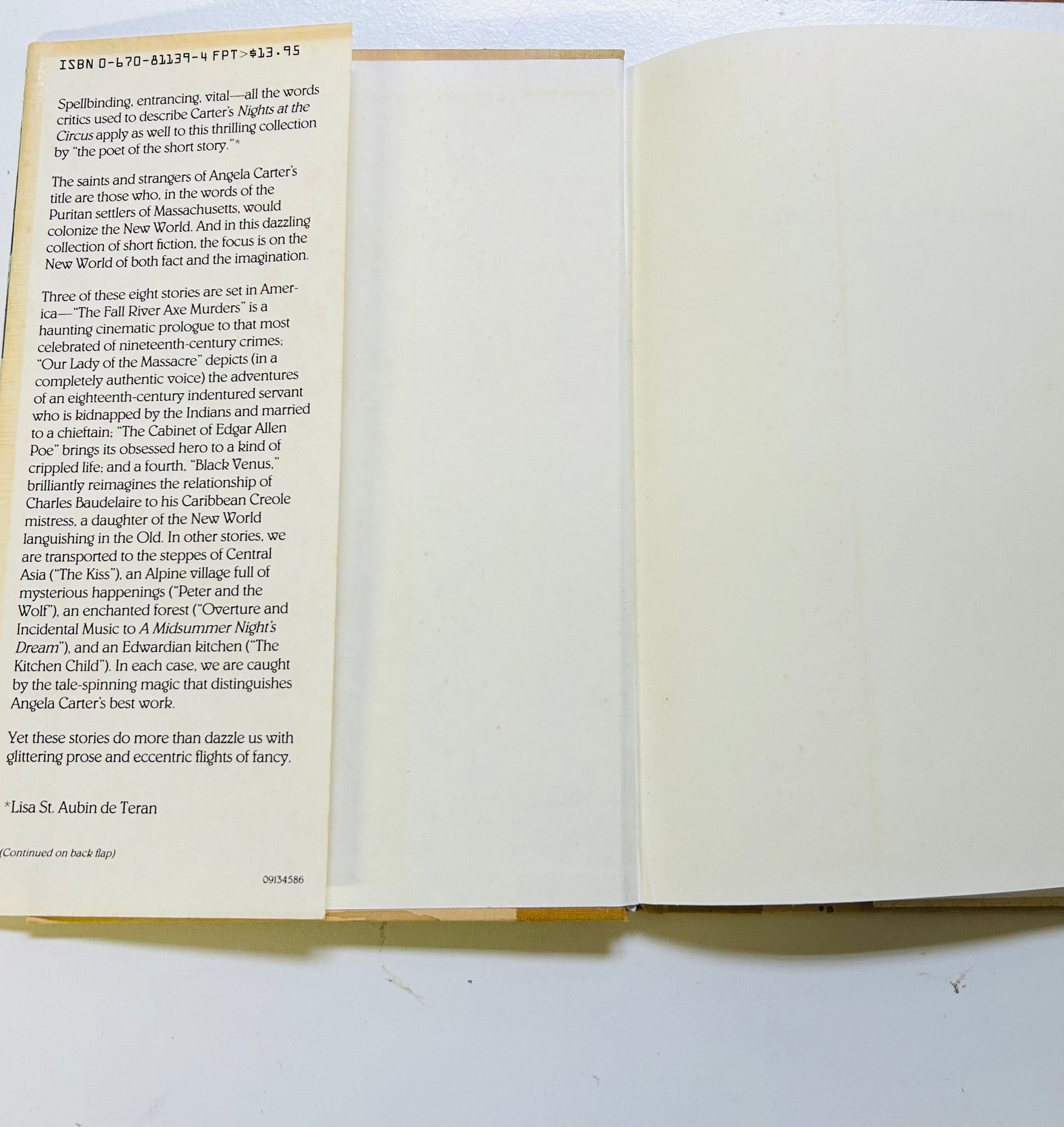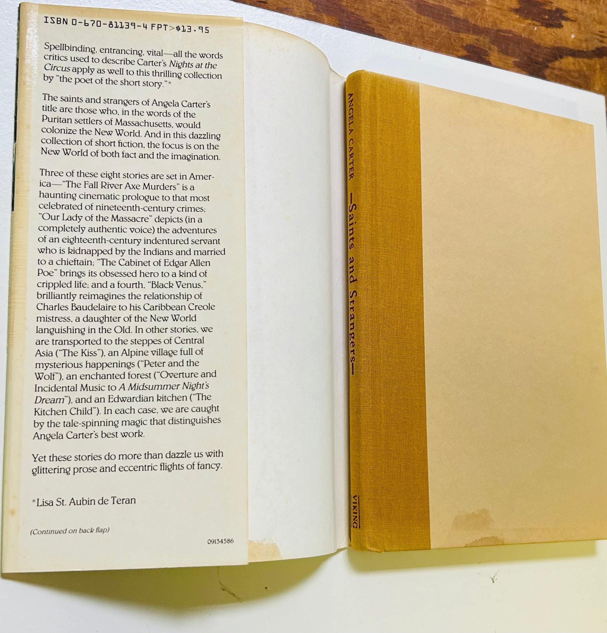 A bold, darkly imaginative collection from one of the fiercest literary voices of the 20th century. In Saints and Strangers, Angela Carter explores myth, politics, sex, and identity with razor-sharp intellect and gothic flair. This is the stated First American Edition published by Viking in 1986—complete in its original unclipped dust jacket.