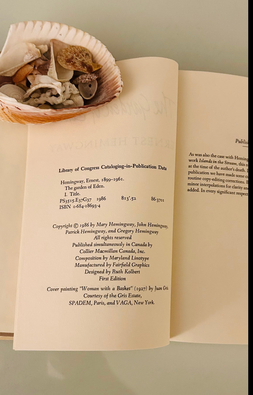Ernest Hemingway. Stated first edition, first printing. New York: Charles Scribner's Sons, 1986. Both unclipped dust jacket and hardcover are in Near Fine condition. The dust jacket, designed by Marek Antoniak, is covered in a mylar protective wrapper. Has the original price $18.95 on inside flap. No writing or markings in this well-preserved copy, 247 pp. Cover painting "Women with a Basket" (1927) by Juan Gris.