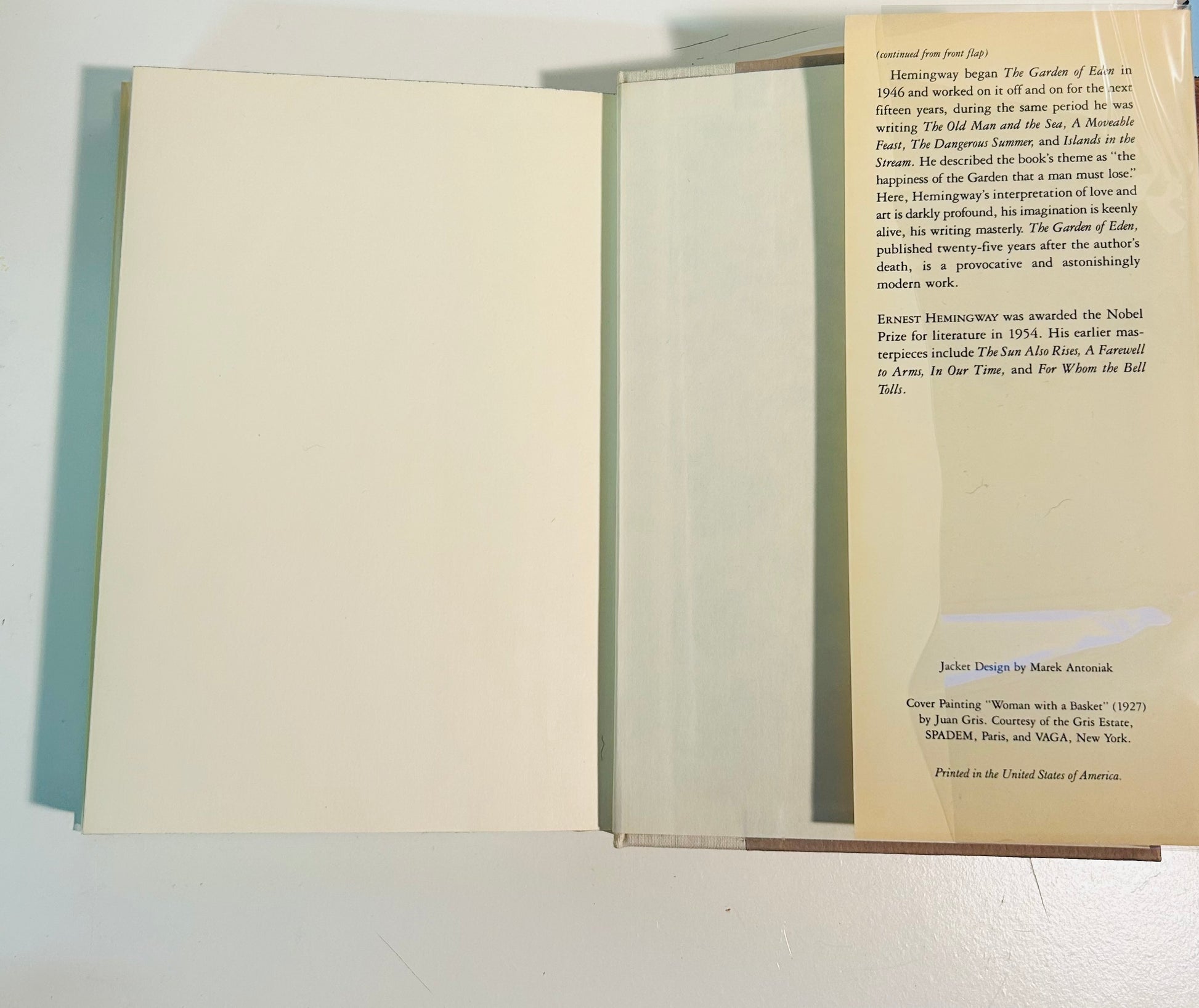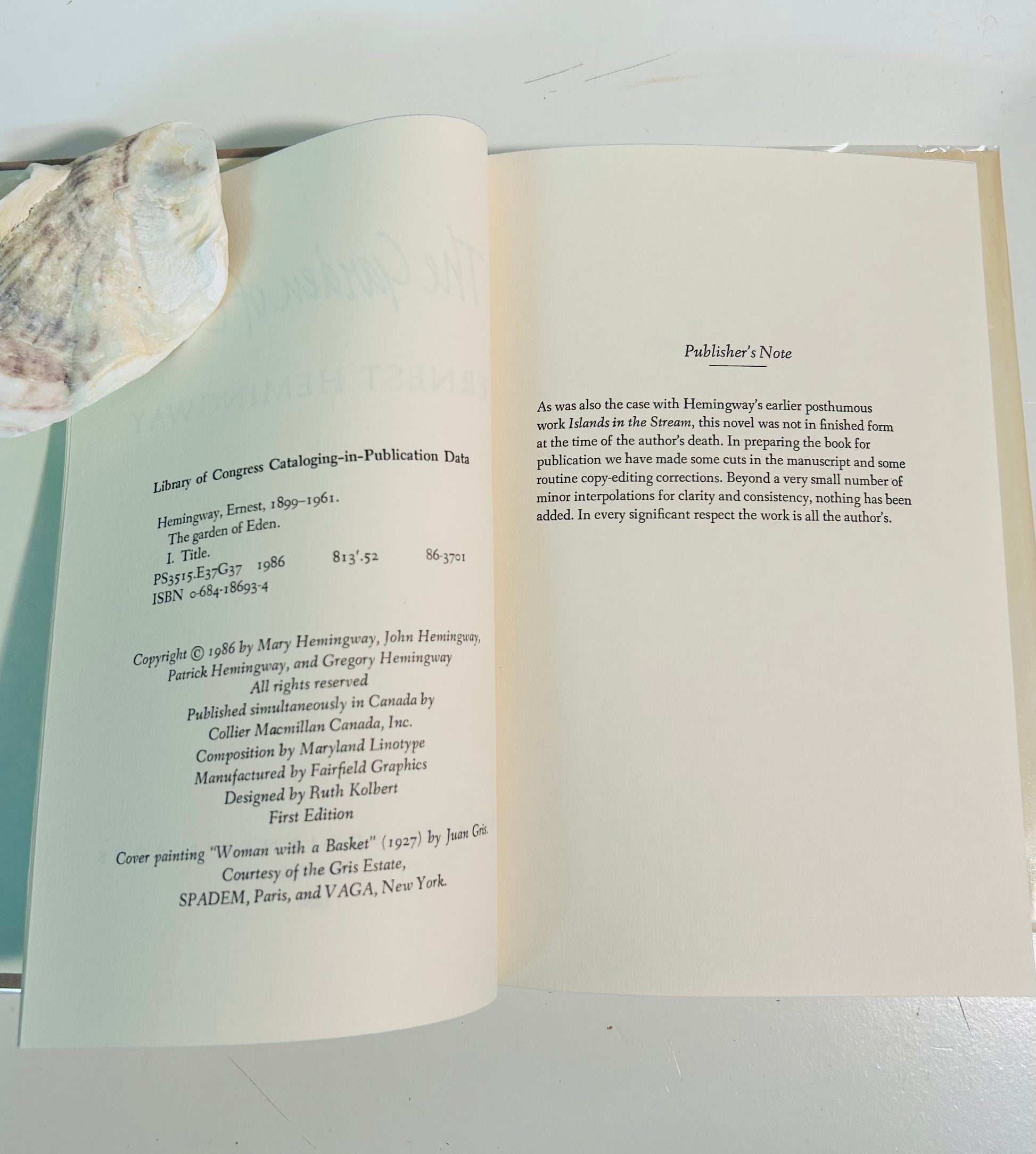 Ernest Hemingway. Stated first edition, first printing. New York: Charles Scribner's Sons, 1986. Both unclipped dust jacket and hardcover are in Near Fine condition. The dust jacket, designed by Marek Antoniak, is covered in a mylar protective wrapper. Has the original price $18.95 on inside flap. No writing or markings in this well-preserved copy, 247 pp. Cover painting "Women with a Basket" (1927) by Juan Gris.
