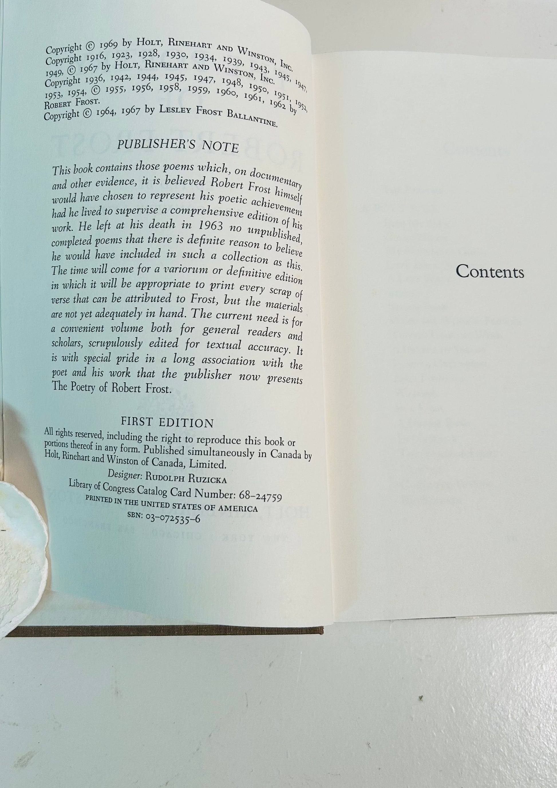 Robert Frost. Edited by Edward Connery Lathem. Stated first edition. BCE (book club edition). New York: Holt, Rinehart and Winston, 1969. Both unclipped dust jacket and hardcover are in Very Good+ condition. Jacket design by the great Lawrence Ratzkin. No writing or markings found in the book, 607 pp.